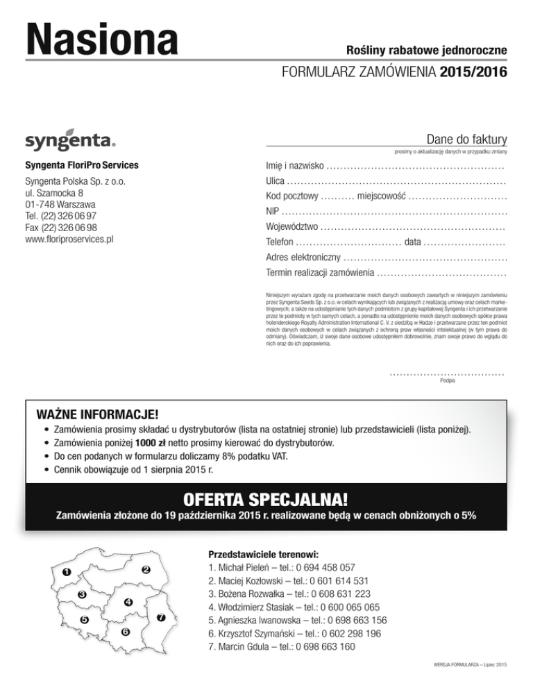 Nasiona Rośliny rabatowe jednoroczne FORMULARZ ZAMÓWIENIA 2015/2016 Dane do faktury prosimy o aktualizację danych w przypadku zmiany Syngenta FloriPro Services Imię i nazwisko .................................................... Syngenta Polska Sp. z o.o. ul. Szamocka 8 01-748 Warszawa Tel. (22) 326 06 97 Fax (22) 326 06 98 www.floriproservices.pl Ulica ................................................................ Kod pocztowy .......... miejscowość ............................. NIP .................................................................. Województwo ...................................................... Telefon ............................... data ........................ Adres elektroniczny ................................................ Termin realizacji zamówienia ...................................... Niniejszym wyrażam zgodę na przetwarzanie moich danych osobowych zawartych w niniejszym zamówieniu przez Syngenta Seeds Sp. z o.o. w celach wynikających lub związanych z realizacją umowy oraz celach marketingowych; a także na udostępnianie tych danych podmiotom z grupy kapitałowej Syngenta i ich przetwarzanie przez te podmioty w tych samych celach, a ponadto na udostępnienie moich danych osobowych spółce prawa holenderskiego Royalty Administration International C. V. z siedzibą w Hadze i przetwarzane przez ten podmiot moich danych osobowych w celach związanych z ochroną praw własności intelektualnej (w tym prawa do odmiany). Oświadczam, iż swoje dane osobowe udostępniłem dobrowolnie, znam swoje prawo do wglądu do nich oraz do ich poprawienia. .................................. Podpis WAŻNE INFORMACJE! • Zamówienia prosimy składać u dystrybutorów (lista na ostatniej stronie) lub przedstawicieli (lista poniżej). • Zamówienia poniżej 1000 zł netto prosimy kierować do dystrybutorów. • Do cen podanych w formularzu doliczamy 8% podatku VAT. • Cennik obowiązuje od 1 sierpnia 2015 r. OFERTA SPECJALNA! Zamówienia złożone do 19 października 2015 r. realizowane będą w cenach obniżonych o 5% 2 1 3 4 7 5 6 Przedstawiciele terenowi: 1. Michał Pieleń – tel.: 0 694 458 057 2. Maciej Kozłowski – tel.: 0 601 614 531 3. Bożena Rozwałka – tel.: 0 608 631 223 4. Włodzimierz Stasiak – tel.: 0 600 065 065 5. Agnieszka Iwanowska – tel.: 0 698 663 156 6. Krzysztof Szymański – tel.: 0 602 298 196 7. Marcin Gdula – tel.: 0 698 663 160 WERSJA FORMULARZA – Lipiec 2015 Rośliny rabatowe jednoroczne Nr art. 2 Nazwa handlowa Forma nasion Opakowanie Cena za opakowanie netto 10023444 Ageratum houstonianum Fields F1 Blue otoczka 1000 nasion 56,10 zł 10440847 Ageratum houstonianum Hawaii Blue Imp otoczka 1000 nasion 55,00 zł 10390898 Antirrhinum majus Montego F1 Formula Mix otoczka 1000 nasion 63,20 zł 10235485 Antirrhinum majus Montego F1 Orange Bicolour otoczka 1000 nasion 63,20 zł 10350151 Antirrhinum majus Montego F1 Pink otoczka 1000 nasion 63,20 zł 10453005 Antirrhinum majus Montego F1 Red Improved otoczka 1000 nasion 63,20 zł 10350557 Antirrhinum majus Montego F1 Sunset otoczka 1000 nasion 63,20 zł 10235503 Antirrhinum majus Montego F1 White otoczka 1000 nasion 63,20 zł 10235506 Antirrhinum majus Montego F1 Yellow otoczka 1000 nasion 63,20 zł 10432772 Begonia semperflorens Foxtrot Scarlet otoczka 1000 nasion 37,70 zł 10498332 Begonia semperflorens Ascot F1 Scarlet otoczka 1000 nasion 37,70 zł 10425087 Begonia semperflorens Ascot F1 Rose Improved otoczka 1000 nasion 37,70 zł 10425093 Begonia semperflorens Ascot F1 Pink Improved otoczka 1000 nasion 37,70 zł 10006140 Begonia semperflorens Ascot F1 White otoczka 1000 nasion 37,70 zł 10462758 Begonia semperflorens Ascot F1 Rose Bicolor Improved otoczka 1000 nasion 37,70 zł 10542585 Begonia semperflorens Ascot F1 Green Leaf Mix Imp. otoczka 1000 nasion 37,70 zł 10462793 Begonia semperflorens Ascot F1 Bronze Rose Improved otoczka 1000 nasion 37,70 zł 10564334 Begonia semperflorens Ascot F1 Bronze Leaf Mix Improved otoczka 1000 nasion 37,70 zł 10425102 Begonia semperflorens Ascot F1 Bronze Pink Improved otoczka 1000 nasion 37,70 zł 10462753 Begonia semperflorens Ascot F1 Bronze Scarlet Imp. otoczka 1000 nasion 37,70 zł 10498337 Begonia semperflorens Ascot F1 Bronze White Improved otoczka 1000 nasion 37,70 zł 10542581 Begonia semperflorens Ascot F1 Complete Mix Imp. otoczka 1000 nasion 37,70 zł 10003114 Begonia tuberhybrida Nonstop F1 Formula Mix otoczka 1000 nasion 156,10 zł 10023360 Begonia tuberhybrida Tenella F1 Mix otoczka 1000 nasion 176,50 zł 10190508 Brassica oleracea Kyoto F1 Pink (Smooth Leaf) nasiona standardowe 1000 nasion 112,20 zł 10190504 Brassica oleracea Kyoto F1 Red Green (Smooth Leaf) nasiona standardowe 1000 nasion 112,20 zł 10190505 Brassica oleracea Kyoto F1 Violet-Green Improved (Curled Leaf) nasiona standardowe 1000 nasion 112,20 zł 10190506 Brassica oleracea Kyoto F1 White-Green Improved (Curled Leaf) nasiona standardowe 1000 nasion 112,20 zł 10190507 Brassica oleracea Kyoto F1 White-Green Improved (Smooth Leaf) nasiona standardowe 1000 nasion 112,20 zł 10190470 Calendula officinalis Little Ball Apricot nasiona standardowe 1000 nasion 67,30 zł 10190469 Calendula officinalis Little Ball Yellow nasiona standardowe 1000 nasion 67,30 zł 10465965 Cobaea scandens Blue nasiona standardowe 1000 nasion 673,20 zł 10571505 Cosmos bipinnatus Casanova Mix Nowość nasiona standardowe 1000 nasion 183,60 zł 10571146 Cosmos bipinnatus Casanova Pink Nowość nasiona standardowe 1000 nasion 183,60 zł 10571499 Cosmos bipinnatus Casanova Red Nowość nasiona standardowe 1000 nasion 183,60 zł 10571502 Cosmos bipinnatus Casanova Violet Nowość nasiona standardowe 1000 nasion 183,60 zł 10571143 Cosmos bipinnatus Casanova White Nowość nasiona standardowe 1000 nasion 183,60 zł 10451326 Dahlia x Hybrida Fresco Formula Mix Improved coated 1000 nasion 134,60 zł 10003401 Dahlia x Hybrida Harlequin Formula Mix coated 1000 nasion 134,60 zł 10017
