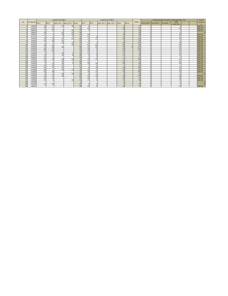 semestr letni MB I Lp. Nr albumu 1 2 3 4 5 6 7 8 9 10 11 12 13 14 15 16 17 18 19 20 21 22 23 24 25 26 27 28 29 30 138054 145941 148350 148363 148673 152275 154040 154041 154042 154043 154045 154046 154047 154049 154050 154051 154052 154053 154056 154057 154058 154059 154060 154061 154062 154064 158650 159599 141434 148341 kol.1 kol.2 semestr letni MB II popr. kol. 1 popr. kol. 2 18 17 9 26 11 0 26 24 3 33 35 48 42 3 17 16 33 15 5 18 31 28 36 8 22 28 27 15 12 11 0 4 18 26 6 11 40 44 28 0 9 0 19 7 13 26 31 3 36 0 37 22 6 31 24 suma 31 18 7 34 49 5 45 31 43 28 16 20 5 43 33 18 46 23 12 6 8 46 39 28 25 45 40 30 7 6 39 46 10 16 14 kol.1 49 29 35 50 69 10 88 57 76 51 86 92 70 29 20 16 76 46 34 51 76 56 72 49 83 50 41 0 55 58 kol.2 popr. kol. 1 popr. kol. 2 suma 8 26 3 20 17 19 4 31 22 24 36 19 21 9 3 15 31 18 1 8 32 16 0 10 28 17 0 13 0 11 7 22 35 6 4 0 8 2 12 28 0 18 0 17 0 26 0 0 0 6 SUMA bonus 8 26 3 0 20 17 30 4 38 44 59 42 23 21 17 5 27 31 46 1 26 32 33 0 36 28 17 0 0 19 2 57 55 38 50 89 27 118 61 114 95 147 134 93 50 37 21 103 77 80 52 102 88 105 49 119 78 58 0 55 77 Podsumowanie semestru zimowego (sem. III) SUMA PUNKTÓW 8 26 3 0 20 17 30 4 38 44 61 42 23 21 17 5 27 31 46 1 26 32 33 0 36 28 17 0 0 19 ZWOLNIENIA EGZAMIN 1 EGZAMIN 2 0 0 0 0 0 0 0 0 0 0 0 0 0 0 0 0 0 0 0 0 0 0 0 0 0 0 0 0 0 0 OCENA KOŃCOW A ndst (2) ndst (2) ndst (2) 0 ndst (2) ndst (2) ndst (2) ndst (2) ndst (2) ndst (2) ndst (2) ndst (2) ndst (2) ndst (2) ndst (2) ndst (2) ndst (2) ndst (2) ndst (2) ndst (2) ndst (2) ndst (2) ndst (2) 0 ndst (2) ndst (2) ndst (2) 0 0 ndst (2)
