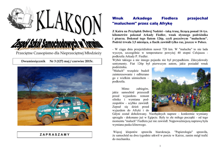 Wnuk Arkadego Fiedlera "maluchem" przez całą Afrykę przejechał Z Kairu na Przylądek Dobrej Nadziei - taką trasę, liczącą ponad 16 tys. kilometrów pokonał Arkady Fiedler, wnuk słynnego podróżnika i pisarza. Dokonał tego fiatem 126p, czyli poczciwym "maluchem". Podróż trwała 3,5 miesiąca, a fiacik zawiódł tylko raz, jeszcze w Polsce. Przeciętne Czasopismo dla Nieprzeciętnej Młodzieży Dwumiesięcznik Nr 3 (127) maj / czerwiec 2015r. - W ciągu dnia przejeżdżałem nawet 720 km. W "maluchu" to nie lada wyczyn, szczególnie w temperaturze powyżej 40 stopni Celsjusza podkreśla Arkady P. Fiedler. Wybór takiego a nie innego pojazdu nie był przypadkiem. Zdecydowały sentymenty. Fiat 126p był pierwszym autem, jakie posiadał wnuk podróżnika. "Maluch" wszędzie budził zainteresowanie i odbierano go z wielkim uśmiechem – podkreśla. Mimo zabiegów, jakie samochód przeszedł przed wyjazdem- remont silnika i wymiana podzespołów - szybko zawiódł. Zepsuł się dzień przed wyjazdem do Afryki i do Gdyni został doholowany. Niezbędnych napraw - konkretnie wymiany sprzęgła - dokonano już w Egipcie. Były to złe miłego początki - od tego momentu "maluch" Fiedlera już nie zawiódł. Najpoważniejszą naprawą była wymiana paska klinowego. ZAPRASZAMY Więcej kłopotów sprawiła biurokracja. "Papierologia" sprawiła, że samochód na dwa tygodnie utkwił w porcie w Kairze, zanim mógł trafić do mechanika. 1 Podróżnik część trasy pokonywał sam, a część z osobami towarzyszącymi. Pierwsze dni podróży przeznaczył na nadgonienie straconego czasu. Przygód po drodze jednak nie brakowało. Z Egiptu Fiedler trafił do Sudanu. - W Polsce myślimy, że to islamski, wrogi kraj, tymczasem spotkaliśmy tam chyba najmilszych ludzi na świecie. Urzędnik, który odprawiał nas na granicy zaprosił nas do domu, a jego żona zrobiła nam kolację - wspomina wnuk słynnego pisarza. Kolejnym punktem była Etiopia - tam "maluch" wspiął się na wysokość 3500 metrów n.p.m. Następnie przez Kenię Fiedler dojechał do Ugandy. Tam podróżnik co chwila utykał w błocie. - Stanąłem na drodze, ruszyłem pięć metrów i znowu wpadałem do rowu. W końcu cała wioska wypychała "malucha" z tych rowów - śmieje się. Dalej przez Rwandę dotarł do Tanzanii, gdzie przez 850 km jechał szutrową, mało uczęszczaną trasą wzdłuż jeziora Tanganika. - Nie spotkałem tam ani jednego białego. Droga była wyboista, mnóstwo kolein, kamienie. Codziennie była walka mówi Fiedler. Z Namibii „maluch” dojechał już do RPA. Wyprawą "maluchem" do Afryki, Fiedler uczcił 40. rocznicę otwarcia muzeum-pracowni literackiej w Puszczykowie oraz 120. rocznicę urodzin patrona tej placówki - jego dziadka, także Arkadego Fiedlera. Nie sposób też nie zwrócić uwagi na nawiązanie do słynnej podróży rowerem przez Afrykę poznańskiego podróżnika Kazimierza Nowaka. Tamta ekspedycja była bardziej hardcorowa - 3-letnia i na rowerze. Ja na rowerze raczej nie dałbym rady. "Maluch" wystarczająco dał mi w kość – kończy Fiedler junior. Wraz z pomysłodawcą w „maluchu” jechała ekipa filmowa: Kuba Dąbrowski, Krzysztof Winter i Albert Wójtowicz. Niebawem siadają do pracy nad filmem, który opowie o przygodach „malucha” w Afryce. Tą trasą dotarł do granicy z Zambią. - Wjeżdżaliśmy do tego kraju mniej uczęszczaną drogą. Na przejściu granicznym sami musieliśmy otworzyć bramy do strefy buforowej i obudzić celnika, by wbił nam pieczątki i puścił nas dalej - relacjonuje. Kolejnymi krajami na trasie były Botswana i Namibia. W drugim z tych państw podróżnik spotkał potomków Buszmenów. - Dziś żyją oni już w inny sposób, ale specjalnie dla nas przebrali się w swoje stare stroje i pokazali kilka tradycji, na przykład jak polować na antylopy - mówi Fiedler. 2 3 Premiera kinowa Jeśli nie masz jeszcze pomysłu na wakacje – sprawdź miejsca, w których straszy… Recenzja filmu „San Andreas” Ogromne wieżowce, upadające niczym domki z kart, gigantyczna fala tsunami zalewająca miasto, a pośród tego katastroficznego krajobrazu nieustępliwy heros podążający za rodziną. "San Andreas" to wyidealizowanie amerykańskiego bohaterstwa i zlepek widowiskowych sekwencji, na które w znacznej mierze składają się efekty specjalne. Reżyser Brad Peyton wiernie odwzorował każdy element kina katastroficznego. Nieustraszony i niemal „niezniszczalny” ojciec przemierza ląd, wodę i powietrze na ratunek córce, odzyskując jednocześnie przychylność żony, która jeszcze do niedawna myślała o rozwodzie. Największym Bohaterem filmu „San Andreas” są efekty specjalne. Zrealizowane zostały na bardzo wysokim poziomie i nie rażą one sztucznością. W tym wszystkim na szczęście reżyser nie zapomina o bohaterach, którzy są niestety dość stereotypowi i banalni. Reżyser nienachalnie wplata w ten festiwal destrukcji historię odbudowującej się rodziny. San Andreas to dobry film. To uczciwie wykonana rzemieślnicza robota. Marek Raczkowski 2B/4 Większość z was pewnie w dzieciństwie zaczytywała się w powieściach o duchach i zjawach. Tajemniczych lochach i opuszczonych zamkach, w których swoje królestwo mają duchy. Ale, duchy i straszydła, pojawiają się nie tylko w książkach. W Polsce są miejsca, w których naprawdę straszy! Nie wierzysz? Sprawdź! Oto top 10 najbardziej niezwykłych miejsc w Polsce, w których dzieją się paranormalne zjawiska: 1. Zamek w Nidzicy 2. Zamek w Janowcu 3. Zamek w Kórniku 4. Zamek w Pieskowej Skale 5. Zamek Ogrodzieniec 6. Kościół w Tumie koło Łęczycy 7.Pałac w Łańcucie 8. Zamek w Bobolicach 9. Zamek w Szamotułach 10.Pałac w Nieborowie Oprac. p. A. Michałowska-Bielicka Gazetka ,,KLAKSON” Zespół redakcyjny: p. J. Jankowska, p. J. Klimaszewska, p. J. Szewczul, p. A. Bielicka, p. D. Szwed, M. Raczkowski IIb/4 4