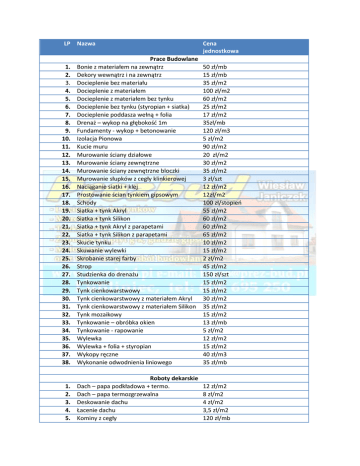 LP Nazwa Cena jednostkowa 1. 2. 3. 4. 5. 6. 7. 8. 9. 10. 11. 12. 13. 14. 15. 16. 17. 18. 19. 20. 21. 22. 23. 24. 25. 26. 27. 28. 29. 30. 31. 32. 33. 34. 35. 36. 37. 38. Prace Budowlane Bonie z materiałem na zewnątrz Dekory wewnątrz i na zewnątrz Docieplenie bez materiału Docieplenie z materiałem Docieplenie z materiałem bez tynku Docieplenie bez tynku (styropian + siatka) Docieplenie poddasza wełną + folia Drenaż – wykop na głębokość 1m Fundamenty - wykop + betonowanie Izolacja Pionowa Kucie muru Murowanie ściany działowe Murowanie ściany zewnętrzne Murowanie ściany zewnętrzne bloczki Murowanie słupków z cegły klinkierowej Naciąganie siatki + klej Prostowanie ścian tynkiem gipsowym Schody Siatka + tynk Akryl Siatka + tynk Silikon Siatka + tynk Akryl z parapetami Siatka + tynk Silikon z parapetami Skucie tynku Skuwanie wylewki Skrobanie starej farby Strop Studzienka do drenażu Tynkowanie Tynk cienkowarstwowy Tynk cienkowarstwowy z materiałem Akryl Tynk cienkowarstwowy z materiałem Silikon Tynk mozaikowy Tynkowanie – obróbka okien Tynkowanie - rapowanie Wylewka Wylewka + folia + styropian Wykopy ręczne Wykonanie odwodnienia liniowego 50 zł/mb 15 zł/mb 35 zł/m2 100 zł/m2 60 zł/m2 25 zł/m2 17 zł/m2 35zł/mb 120 zł/m3 5 zł/m2 90 zł/m2 20 zł/m2 30 zł/m2 35 zł/m2 3 zł/szt 12 zł/m2 12zł/m2 100 zł/stopień 55 zł/m2 60 zl/m2 60 zł/m2 65 zł/m2 10 zł/m2 15 zł/m2 2 zł/m2 45 zł/m2 150 zł/szt 15 zł/m2 15 zł/m2 30 zł/m2 35 zł/m2 15 zł/m2 13 zł/mb 5 zł/m2 12 zł/m2 15 zł/m2 40 zł/m3 35 zł/mb 1. 2. 3. 4. 5. Roboty dekarskie Dach – papa podkładowa + termo. Dach – papa termozgrzewalna Deskowanie dachu Łacenie dachu Kominy z cegły 12 zł/m2 8 zł/m2 4 zł/m2 3,5 zł/m2 120 zł/mb 6. 7. 8. 9. 10. 11. 12. 13. 14. 15. 16. 17. 18. 19. 20. 21. 22. 23. 24. 25. 26. 27. 28. 29. Kominy systemowe Krycie dachu dachówką Krycie dachu blachą trapezową Krycie dachu blachą płaską Krycie dachu blacho-dachówką Krycie dachu gontami Malowanie dachu Montaż deski czołowej Montaż drabinek przeciwśniegowych Montaż ław kominiarskich Montaż wyłazu dachowego Obróbki blacharskie na dachu Obróbki papowe Obróbka daszka komina blachą Obróbka komina Podbitka Rynny Rynny spustowe Więźba dachowa Zabudowa komina łupkiem Zabudowa krokwi łupkiem Założenie folii dachowej Założenie okna dachowego Zerwanie starej papy 50 zł/mb 25 zł/m2 12 zł/m2 25 zł/m2 20 zł/m2 11 zł/m2 10 zł/m2 6 zł/mb 12 zł/mb 40 zł/szt 100 zł/szt 12 zł/mb 5 zł/mb 55 zł/szt 80 zł/szt 25 zł/mb 10 zł/mb 8 zł/mb 20 zł/m2 120 zł/m2 12 zł/mb 2 zł/m2 250 zł/szt 15 zł/m2 1. 2. 3. 4. 5. 6. 7. 8. 9. 10. Roboty elektryczne Instalacja elektryczna ( 5 halogenów = 1pkt) Montaż domofonu Montaż gniazdka TV wraz z podłączeniem Montaż okapu kuchennego Montaż wyłącznika prądowego Osadzenie puszek prądowych bez kucia Osadzenie puszek prądowych z kuciem Wkuwanie koryt pod kable Wkucie monitora wideo domofonu, itp. Założenie anteny na dachu 30 zł/pkt 50 zł/pkt 60 zł/pkt 50 zł/szt 5 zł/szt 7 zł/szt 10 zł/szt 10 zł/mb 30 zł/szt 250 zł/szt 1. 2. 3. 4. 5. 6. 7. 8. 9. Układanie glazury Dekory z płytek Hydroizolacja Płytki podłogowe Płytki ścienne Płytki ścienne 10 x 10 cm Płytki klinkierowe (na cokoliku) Skuwanie płytek Szlify 45 0 Wykonanie półek 15 zł/mb 15 zł/m2 40 zł/m2 40 zł/m2 50 zł/m2 50 zł/m2 25 zł/m2 30 zł/mb 50 zł/mb 2. 3. 4. 5. 6. 7. 8. 9. 10. 11. 12. 13. 14. 15. 16. 17. 18. Roboty hydrauliczne (bojler 2 pkt, piec 2 pkt, zbiornik wyrównawczy 1 pkt, rozdzielacz 1 pkt) C.O. + woda 100 zł/pkt Demontaż pkt C.O. i woda 50 zł/pkt Montaż baterii 25 zł/szt Montaż brodzika + kabina 220 zł/szt Montaż geberitu 150 zł/szt Montaż geberitu wraz z wkuciem w ścianę 230 zł/szt Montaż kompaktu WC lub miski z zabudowy 50 zł/szt Montaż lustra 25 zł/szt Montaż dodatków WC 15 zł/szt Montaż panelu prysznicowego 50 zł/szt Montaż rewizji na magnesach 30 zł/szt Montaż umywalki + syfon + bateria 60 zł/kpl Montaż wanny 120 zł/szt Montaż zlewozmywaka ( wraz z wycięciem w blacie) 150 zł/szt Montaż zaworu ( np. Kątowego) 10 zł/szt Ogrzewanie podłogowe 15 zł/m2 Podłączenie grzejnika 40 zł/szt Zabudowa geberitu 100 zł/szt 1. 2. 3. 4. 5. 6. 7. 8. 9. 10. 11. 12. 13. 14. 15. 16. 17. 18. 19. Prace stolarsko – okładzinowe Drzwi – dwuskrzydłowe – demontaż 60 zł/szt Drzwi – dwuskrzydłowe – montaż 200 zł/szt Drzwi – jednoskrzydłowe – demontaż 50 zł/szt Drzwi – jednoskrzydłowe - montaż 150 zł/szt Drzwi – zewnętrzne montaż 200 zł/szt Montaż listew progowych 20 zł/szt Montaż listew drzwiowych (opasek) 50 zł/kpl Montaż schodów strychowych 160 zł/szt Okno – demontaż 5 zł/mb Okno – montaż 20zł/mb Parapety 30 zł/mb Panele ścienne – demontaż 10 zł/m2 Panele ścienne – montaż 17 zł/m2 Panele podłogowe 12 zł/m2 Płyty OSB 11 zł/m2 Podcinanie drzwi 15 zł/szt Ułożenie legarów 6 zł/m2 Ułożenie listwy przypodłogowej 4 zł/mb Założenie bramy garażowej 450 zł/szt 1. 2. 3. 4. 5. 6. Prace wykończeniowe Gładź gipsowa 14zł/m2 Gruntowanie ścian i sufitów 1 zł/m2 Malowanie (dwa razy) 7 zł/m2 Malowanie z materiałem (dwa razy) 14 zł /m2 Malowanie lamperii 7 zł/m2 Malowanie ościeżnic drzwiowych 10 zł/szt (demontaż 1/3 montażu) 1. 7. 8. 9. 10. 11. 12. 13. 14. 15. 16. 17. 18. 19. 20. 21. 22. 23. 24. 25. 26. 27. 28. 29. 30. 31. 32. Malowanie rurek Malowanie elewacji Malowanie balustrad, płotów itp. Malowanie drzwi z futryną Malowanie drzwi Montaż kratek wentylacyjnych Osadzenie rolety Płyty g-k sufity bez gipsowania Płyty g-k sufity na gotowo Płyty g-k sufity na gotowo z dociepleniem Płyty g-k ścianki bez gipsowania Płyty g-k ścianki na gotowo na klej Płyty g-k ścianki na gotowo na stelażu Płyty g-k ścianki działowe bez gipsowania Płyty g-k ścianki działowe na gotowo Płyty g-k sufity z materiałem Płyty g-k ścianki z materiałem Płyty g