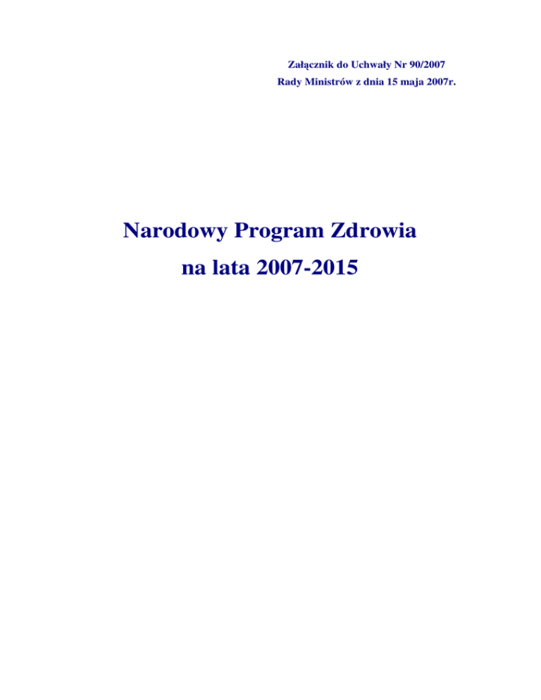 Załącznik do Uchwały Nr 90/2007 Rady Ministrów z dnia 15 maja 2007r. Narodowy Program Zdrowia na lata 2007-2015 Narodowy Program Zdrowia Osoby uczestniczące w opracowaniu projektu Narodowego Programu Zdrowia na lata 2007-2015 Barbara Adamowicz-Klepalska Rudolf Borusiewicz Ewa Burzyńska Bohdan Chazan Dorota Cianciara Jan Czesław Czabała Mirosław Czarkowski Anna Członkowska Wojciech Drygas Jerzy Eliasz Aldona Frączkiewicz-Wronka Janusz Gadzinowski Stanisława Golinowska Mariusz Gujski Wojciech Hanke Mirosław Jarosz Irena Jelonkiewicz Jerzy B. Karski Joanna Mazur Joanna Mikuła Jolanta Mogiła-Lisowska Bożena Moskalewicz Jacek Moskalewicz Rafał Niżankowski Hanna Nowakowska Anna Oblacińska Tomasz Opala Piotr Pawłowski Tadeusz Pieńkowski Halina Potocka Krzysztof Przewoźniak Sławomir Radiukiewicz Kazimierz Roszkowski-Śliż Włodzimierz Sekuła Janusz Sierosławski Janusz Świątczak Katarzyna Szamotulska Maria Wierzbicka Anna Wilmowska-Pietruszyńska Barbara Woynarowska Marek Wójcik Mirosław Wysocki Witold Zatoński Andrzej Zieliński Zespół redakcyjny Krzysztof Kuszewski Paweł Goryński Bogdan Wojtyniak Rafał Halik 2 Narodowy Program Zdrowia Proponowany skład Zespołu Koordynacyjnego Narodowego Programu Zdrowia (instytucje) • Kancelaria Prezesa Rady Ministrów • Ministerstwo Edukacji Narodowej • Ministerstwo Finansów • Ministerstwo Gospodarki Morskiej • Ministerstwo Gospodarki • Ministerstwo Kultury i Dziedzictwa Narodowego • Ministerstwo Nauki i Szkolnictwa Wyższego • Ministerstwo Obrony Narodowej • Ministerstwo Pracy i Polityki Społecznej • Ministerstwo Rozwoju Regionalnego • Ministerstwo Rolnictwa i Rozwoju Wsi • Ministerstwo Sportu • Ministerstwo Sprawiedliwości • Ministerstwo Spraw Wewnętrznych i Administracji • Ministerstwo Środowiska • Ministerstwo Transportu • Ministerstwo Budownictwa • Ministerstwo Zdrowia • Główny Urząd Statystyczny • Zakład Ubezpieczeń Społecznych • Narodowy Fundusz Zdrowia • Kasa Rolniczego Ubezpieczenia Społecznego • Medyczne samorządy zawodowe • Związek Województw RP • Związek Powiatów Polskich • Związek Gmin Wiejskich RP • Unia Miasteczek Polskich • Związek Miast Polskich • Unia Metropolii Polskich • Wybrany przedstawiciel organizacji pozarządowych 3 Narodowy Program Zdrowia Spis treści Od zespołu redakcyjnego.................................................................................... 7 WPROWADZENIE ............................................................................................ 8 1. Determinanty zdrowia oraz promocja zdrowia ..................................... 10 2. Sytuacja demograficzna............................................................................ 10 3. Sytuacja zdrowotna społeczeństwa polskiego......................................... 12 4. Różnice społeczne i terytorialne w stanie zdrowia populacji................ 13 I. STRATEGICZNE CELE ZDROWOTNE.................................................. 17 Cel strategiczny 1........................................................................................... 17 Zmniejszenie zachorowalności i przedwczesnej umieralności z powodu chorób naczyniowo-sercowych, w tym udarów mózgu.............................. 17 Cel strategiczny 2........................................................................................... 18 Zmniejszenie zachorowalności i przedwczesnej umieralności z powodu nowotworów złośliwych. ............................................................................... 18 Cel strategiczny 3........................................................................................... 19 Zmniejszenie częstości urazów powstałych w wyniku wypadków i ograniczenie ich skutków............................................................................ 19 Cel strategiczny 4........................................................................................... 20 Zapobieganie zaburzeniom psychicznym przez działania prewencyjnopromocyjne..................................................................................................... 20 Cel strategiczny 5........................................................................................... 21 Zmniejszenie przedwczesnej zachorowalności i ograniczenie negatywnych skutków przewlekłych schorzeń układu kostno-stawowego. ......................................................................................................................... 21 Cel strategiczny 6........................................................................................... 22 Zmniejszenie zachorowalności i przedwczesnej umieralności z powodu przewlekłych chorób układu oddechowego. ............................................... 22 Cel strategiczny 7........................................................................................... 23 Zwiększenie skuteczności zapobiegania chorobom zakaźnym i zakażeniom................................................................................................... 23 Cel strategiczny 8........................................................................................... 24 Zmniejszenie różnic społecznych i terytorialnych w stanie zdrowia populacji. ........................................................................................................ 24 II CELE DOTYCZĄCE CZYNNIKÓW RYZYKA I DZIAŁANIA W ZAKRESIE PROMOCJI ZDROWIA ................................................... 26 Cel operacyjny 1. ........................................................................................... 26 Zmniejszenie rozpowszechnienia palenia tytoniu. ..................................... 26 Cel operacyjny 2. ........................................................................................... 27 Zmniejszenie i zmiana struktury spożycia alkoholu oraz zmniejszenie szkód zdrowotnych spowodowanych alkoholem.......................................