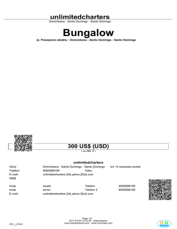 unlimitedcharters Dominikana - Santo Domingo - Santo Domingo Bungalow Poùoýenie obiektu : Dominikana - Santo Domingo - Santo Domingo 300 US$ (USD) ( ca 286 € ) unlimitedcharters Ulica: Telefon: E-mail: WEB Dominikana - Santo Domingo - Santo Domingo 8092898195 Faks: unlimitedcharters [At] yahoo [Dot] com Imiæ Imiæ E-mail: ewald Telefon armin Telefon 2 unlimitedcharters [At] yahoo [Dot] com 272_i_57431 km 14 autopista duarte Page 1/4 2017-03-03 12:43:36 - shipsnetwork www.shipsnetwork.com - www.comships.com 8092898195 8092898195 unlimitedcharters Dominikana - Santo Domingo - Santo Domingo Numer kodu Typ budynku Poùoýenie Materiaùy Property Address 272_i_57431 Bungalow Obszarów Wiejskich Beton km14 autopista duarte Numer kodu Nr referencyjny Status objektet Rok natychmiast potrzebne 2007 Powierzchnia dziaùki Firma Ýycie Kuchnia Sypialnie Zùy Opinie Toaleta 30000 m2 Powierzchnia 120 m2 2 1 2 2 Biznes Inne Usùugi Garaý Carport zadaszony taras Dojazd: 5 Protokoùy Samochód Supermarket Akcesoria Dzierýawa Taras Balkon Jetty Pokój Party Klimatyzacja Resort Ogród Pralnia Goràcy zadaszony taras ogrodzony / murem 272_i_57431 Page 2/4 2017-03-03 12:43:36 - shipsnetwork www.shipsnetwork.com - www.comships.com 1 unlimitedcharters Dominikana - Santo Domingo - Santo Domingo 272_i_57431 Page 3/4 2017-03-03 12:43:36 - shipsnetwork www.shipsnetwork.com - www.comships.com unlimitedcharters Dominikana - Santo Domingo - Santo Domingo 272_i_57431 Page 4/4 2017-03-03 12:43:36 - shipsnetwork www.shipsnetwork.com - www.comships.com