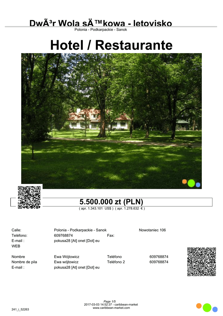 Dwór Wola sÄ™kowa - letovisko Polonia - Podkarpackie - Sanok Hotel / Restaurante Localización del objeto : Polonia - Podkarpackie - Sanok 5.500.000 zt (PLN) ( apr. 1.343.101 US$ ) ( apr. 1.278.632 € ) Calle: Teléfono: E-mail : WEB Polonia - Podkarpackie - Sanok 609768874 Fax: pokusa28 [At] onet [Dot] eu Nombre Nombre de pila E-mail : Ewa Wójtowicz Ewa wójtowicz pokusa28 [At] onet [Dot] eu 241_i_52263 Teléfono Teléfono 2 Page 1/5 2017-03-03 14:52:37 - caribbean-market www.caribbean-market.com Nowotaniec 106 609768874 609768874 Dwór Wola sÄ™kowa - letovisko Polonia - Podkarpackie - Sanok número de código Tipo de objetos Localización Material Adress del objeto 241_i_52263 Hotel / Restaurante Rural número de código Entrar Status de bienes objetos Año www.dworwolasekowa.com.pl Área de la tierra Park zabytkowy m2 Comercial Sitio vivo Cocina Dormitorio Baño Tocador para visitantes Cantidad Habitationes Negocios otras habitaciones garaje Puerto del coche Porch Accesorios arriendo hereditario Terraza Balcón Embarcadero Salon de fiesta Aire acondicionado de A/C Resort Jardín lavadero Agua caliente Porch incluido/pared 241_i_52263 Page 2/5 2017-03-03 14:52:37 - caribbean-market www.caribbean-market.com 6,19 ha m2 Dwór Wola sÄ™kowa - letovisko Polonia - Podkarpackie - Sanok 241_i_52263 Page 3/5 2017-03-03 14:52:37 - caribbean-market www.caribbean-market.com Dwór Wola sÄ™kowa - letovisko Polonia - Podkarpackie - Sanok 241_i_52263 Page 4/5 2017-03-03 14:52:37 - caribbean-market www.caribbean-market.com Dwór Wola sÄ™kowa - letovisko Polonia - Podkarpackie - Sanok 241_i_52263 Page 5/5 2017-03-03 14:52:37 - caribbean-market www.caribbean-market.com