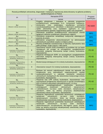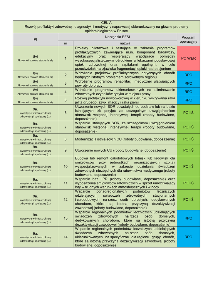 CEL A Rozwój profilaktyki zdrowotnej, diagnostyki i medycyny naprawczej ukierunkowany na główne problemy epidemiologiczne w Polsce Narzędzia EFSI PI nr 8vi Aktywne i zdrowe starzenie się 8vi Aktywne i zdrowe starzenie się 8vi Aktywne i zdrowe starzenie się 8vi Aktywne i zdrowe starzenie się 8vi Aktywne i zdrowe starzenie się 1 2 3 4 5 9a. Inwestycje w infrastrukturę zdrowotną i społeczną (…) 6 9a. Inwestycje w infrastrukturę zdrowotną i społeczną (…) 7 9a. Inwestycje w infrastrukturę zdrowotną i społeczną (…) PO IiŚ PO IiŚ PO IiŚ 10 11 12 13 9a. Inwestycje w infrastrukturę zdrowotną i społeczną (…) RPO Utworzenie nowych CU (roboty budowlane, doposażenie) 9a. Inwestycje w infrastrukturę zdrowotną i społeczną (…) RPO 9 9a. Inwestycje w infrastrukturę zdrowotną i społeczną (…) RPO PO IiŚ 9a. Inwestycje w infrastrukturę zdrowotną i społeczną (…) RPO Modernizacja istniejących CU (roboty budowlane, doposażenie) 9a. Inwestycje w infrastrukturę zdrowotną i społeczną (…) PO WER 8 9a. Inwestycje w infrastrukturę zdrowotną i społeczną (…) nazwa Projekty pilotażowe i testujące w zakresie programów profilaktycznych zawierające m.in. komponent badawczy, edukacyjny oraz wspierający współpracę pomiędzy wysokospecjalistycznym ośrodkiem a lekarzami podstawowej opieki zdrowotnej oraz szpitalami ogólnymi, w celu przeciwdziałania zjawisku fragmentacji opieki nad pacjentem Wdrożenie projektów profilaktycznych dotyczących chorób będących istotnym problemem zdrowotnym regionu Wdrożenie programów rehabilitacji medycznej ułatwiających powroty do pracy Wdrożenie programów ukierunkowanych na eliminowanie zdrowotnych czynników ryzyka w miejscu pracy Rozwój profilaktyki nowotworowej w kierunku wykrywania raka jelita grubego, szyjki macicy i raka piersi Utworzenie nowych SOR powstałych od podstaw lub na bazie istniejących izb przyjęć ze szczególnym uwzględnieniem stanowisk wstępnej intensywnej terapii (roboty budowlane, doposażenie) Wsparcie istniejących SOR, ze szczególnym uwzględnieniem stanowisk wstępnej intensywnej terapii (roboty budowlane, doposażenie) Program operacyjny 14 Budowa lub remont całodobowych lotnisk lub lądowisk dla śmigłowców przy jednostkach organizacyjnych szpitali wyspecjalizowanych w zakresie udzielania świadczeń zdrowotnych niezbędnych dla ratownictwa medycznego (roboty budowlane, doposażenie) Wsparcie baz LPR (roboty budowlane, doposażenie) oraz wyposażenia śmigłowców ratowniczych w sprzęt umożliwiający loty w trudnych warunkach atmosferycznych i w nocy Wsparcie ponadregionalnych podmiotów leczniczych udzielających świadczeń zdrowotnych stacjonarnych i całodobowych na rzecz osób dorosłych, dedykowanych chorobom, które są istotną przyczyną dezaktywizacji zawodowej (roboty budowlane, doposażenie) Wsparcie regionalnych podmiotów leczniczych udzielających świadczeń zdrowotnych na rzecz osób dorosłych, dedykowanych chorobom, które są istotną przyczyną dezaktywizacji zawodowej (roboty budowlane, doposażenie) Wsparcie regionalnych podmiotów leczniczych udzielających świadczeń zdrowotnych na rzecz osób dorosłych, ukierunkowanych na specyficzne dla regionu grupy chorób, które są istotną przyczyną dezaktywizacji zawodowej (roboty budowlane, doposażenie) PO IiŚ PO IiŚ PO IiŚ RPO RPO CEL B Przeciwdziałanie negatywnym trendom demograficznym poprzez rozwój opieki nad matką i dzieckiem oraz osobami starszymi Narzędzia EFSI PI nr 9a. Inwestycje w infrastrukturę zdrowotną i społeczną (…) 15 9a. Inwestycje w infrastrukturę zdrowotną i społeczną (…) 16 9a. Inwestycje w infrastrukturę zdrowotną i społeczną (…) 17 9iv. Ułatwianie dostępu do niedrogich, trwałych oraz wysokiej jakości usług, w tym opieki zdrowotnej (…) 18 9iv. Ułatwianie dostępu do niedrogich, trwałych oraz wysokiej jakości usług, w tym opieki zdrowotnej (…) 19 nazwa Wsparcie ponadregionalnych podmiotów leczniczych udzielających świadczeń zdrowotnych stacjonarnych i całodobowych w zakresie ginekologii, położnictwa, neonatologii, pediatrii oraz innych oddziałów zajmujących się leczeniem dzieci (roboty budowlane, doposażenie) Wsparcie regionalnych podmiotów leczniczych udzielających świadczeń zdrowotnych w zakresie ginekologii, położnictwa, neonatologii, pediatrii oraz innych jednostek zajmujących się leczeniem dzieci (roboty budowlane, doposażenie) Wsparcie podmiotów leczniczych udzielających świadczeń zdrowotnych w zakresie geriatrii, opieki długoterminowej oraz opieki paliatywnej i hospicyjnej (roboty budowlane, doposażenie) Wsparcie deinstytucjonalizacji opieki nad osobami zależnymi, poprzez rozwój alternatywnych form opieki nad osobami niesamodzielnymi (w tym osobami starszymi) Wdrożenie programów wczesnego wykrywania wad rozwojowych i rehabilitacji dzieci zagrożonych niepełnosprawnością i niepełnosprawnych Program operacyjny PO IiŚ RPO RPO RPO PO WER RPO CEL C Poprawa efektywności i organizacji systemu opieki zdrowotnej w kontekście zmieniającej się sytuacji demograficznej i epidemiologicznej oraz wspieranie badań naukowych, rozwoju technologicznego i innowacji w ochronie zdrowia Narzędzia EFSI PI nr nazwa 20 Działania projakościowe dedykowane podmiotom leczniczym, które świadczą szpitalne usługi medyczne PO WER 21 Działania projakościowe dedykowane podmiotom świadczącym podstawową opiekę zdrowotną PO WER 9iv. Ułatwianie dostępu do niedrogich, trwałych oraz wysokiej jakości usług, w tym opieki zdrowotnej (…) 9iv. Ułatwianie dostępu do niedrogich, trwałych oraz wysokiej jakości usług, w tym opieki zdrowotnej (…) 9iv. Ułatwianie dostępu do niedrogich, trwałych oraz wysokiej jakości usług, w tym opieki zdrowotnej (…) 22 9iv. Ułatwianie dostępu do niedrogich, trwałych oraz wysokiej jakości usług, w tym opieki zdrowotnej (…) 23 9iv. Ułatwianie dostępu do niedrogich, tr