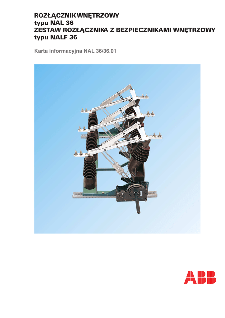 ROZ£¥CZNIK WNÊTRZOWY typu NAL 36 ZESTAW ROZ£¥CZNIKA Z BEZPIECZNIKAMI WNÊTRZOWY typu NALF 36 Karta informacyjna NAL 36/36.01 Roz³¹cznik wnêtrzowy typu NAL 36 Zestaw roz³¹cznika z bezpiecznikami wnêtrzowy typu NALF 36 36 kV 630 A i 800 A Spis treœci 1. Uwagi ogólne ....................................................................................... 3 2. Podstawowe elementy roz³¹cznika NAL 36 ......................................... 3 3. Opis dzia³ania ...................................................................................... 3 4. Zdolnoœæ za³¹czania pr¹dów zwarciowych .......................................... 3 5. Odpornoœæ na warunki atmosferyczne ................................................. 3 6. Szkice wymiarowe .............................................................................. 4 7. Dane techniczne NAL 36 ...................................................................... 6 8. Elementy podstawowe aparatu ........................................................... 6 9. Transport oraz przechowywanie ......................................................... 7 10. Instalowanie oraz konserwacja ............................................................ 7 11. Weryfikacja .......................................................................................... 7 12. Czêœci zamienne .................................................................................. 8 2 ABB 1. UWAGI OGÓLNE Roz³¹cznik izolacyjny typu NAL i zestaw roz³¹cznika z bezpiecznikami typu NALF opieraj¹ siê na budowie modu³owej. Element g³ówny sk³ada siê z podstawy (ramy) z izolatorami oraz elementów toru pr¹dowego. Dwa ró¿ne typy mechanizmów napêdowych: o dzia³aniu migowym typu K (jednosprê¿ynowy) lub mechanizm pozwalaj¹cy na magazynowanie energii typu A (dwusprê¿ynowy), s¹ zamontowane bezpoœrednio na ramie. Bezpoœrednio na roz³¹cznik mo¿e byæ zamontowana równie¿ podstawa bezpiecznikowa typu F z wyzwalaczem bezpiecznikowym. Do zamontowania mo¿e byæ równie¿ dostarczony uziemnik wolnostoj¹cy szybki typu EB. Modu³y te mog¹ byæ ³¹czone w zale¿noœci od potrzeb. Akcesoria takie jak: wyzwalacz elektromagnetyczny, wyzwalacz podnapiêciowy, ³¹czniki pomocnicze, napêdy silnikowe oraz ró¿norodne uk³ady napêdów rêcznych mog¹ byæ z ³atwoœci¹ dodane do zestawu. 2.6. Wyzwalacz elektromagnetyczny mo¿e byæ montowany na mechanizmie typu A. Wyzwalacz elektromagnetyczny dostosowany jest do wszystkich znormalizowanych napiêæ. £¹cznie z wyzwalaczem elektromagnetycznym nale¿y zainstalowaæ ³¹cznik pomocniczy roz³¹cznika, który powoduje przerwanie obwodu wyzwalacza po otwarciu roz³¹cznika. 2.7. Wyposa¿enie dodatkowe Korpus napêdu rêcznego mo¿e byæ wyposa¿ony w blokadê elektromagnetyczn¹ dostosowan¹ do wszystkich znormalizowanych napiêæ. Istnieje mo¿liwoœæ wyposa¿enia aparatu w napêd elektryczny, np. typu UEMC. 2.8. Napêd rêczny typu HE Domyœlnie napêd rêczny jest zainstalowany z prawej strony roz³¹cznika. Do monta¿u z lewej strony konieczne jest u¿ycie przed³u¿acza wa³u na lew¹ stronê (niezbêdnego równie¿ do blokady mechanicznej roz³¹cznik-uziemnik). 3. OPIS DZIA£ANIA Rys. 1 NAL 36 2. PODSTAWOWE ELEMENTY ROZ£¥CZNIKA NAL 36 Roz³¹cznik wnêtrzowy typu NAL/NALF 36 oparty jest na budowie modu³owej i zawiera nastêpuj¹ce elementy: 2.1.Modu³ podstawowy zawiera: ramê (podstawê), izolatory oraz elementy toru pr¹dowego. Podzia³ka miêdzybiegunowa wynosi 360 mm. 2.2.Mechanizmy napêdowe - typu K, z jedn¹ sprê¿yn¹. Zamykanie lub otwieranie roz³¹cznika realizowane jest poprzez napinanie sprê¿yny poza punkt martwy mechanizmu. - typu A, z dwiema sprê¿ynami. Roz³¹cznik wyposa¿ony w ten mechanizm w stanie zamkniêtym ma sprê¿ynê otwieraj¹c¹ zawsze napiêt¹, co pozwala na wyzwolenie go do stanu otwarcia rêcznie, napêdem elektrycznym, przez wyzwalacz elektromagnetyczny lub wybijak wk³adki bezpiecznikowej. 2.3.Podstawa bezpiecznikowa typu F w wersji z wyzwalaczem bezpiecznikowym lub bez. Przewidziana jest do monta¿u zarówno od strony styków sta³ych jak i od strony osi obrotu no¿y g³ównych. W celu zapewnienia prawid³owego dzia³ania dla wszystkich wartoœci pr¹dów, roz³¹cznik wnêtrzowy typu NAL/NALF wyposa¿ony jest w podwójny system gaszenia ³uku. W czasie przerywania pr¹du, ³uk elektryczny poddany bêdzie dzia³aniom: a) niezale¿nego od wartoœci przerywanego pr¹du wydmuchowi powietrza. Jest to osi¹gane poprzez zaprojektowanie izolatorów po stronie styków sta³ych jako cylindrów t³okowych. T³oki te s¹ po³¹czone z wa³em aparatu podobnie jak styki ruchome. Wydmuch powietrza rozpoczyna siê w odpowiednim momencie w czasie otwierania styków aparatu (tzw. autopneumatyczny wydmuch powietrza). b) zale¿nemu od wartoœci przerywanego pr¹du wydmuchowi gazu. Jeœli ³uk powstaj¹cy w czasie roz³¹czania pr¹du ma odpowiednio du¿¹ energiê, œcianki dyszy z materia³u gazuj¹cego rozgrzewaj¹ siê i gazuj¹. Podczas tego procesu nastêpuje wydzielenie du¿ej objêtoœci gazu i w efekcie skuteczne och³odzenie ³uku. Koncentracja wydzielanego gazu roœnie wraz ze wzrostem wartoœci pr¹du. Efekt ten nazwany efektem gazowym Hart'a jest najwa¿niejszy w technice wysokopr¹dowej. Zrównowa¿one wykorzystanie sprê¿onego powietrza oraz gazu z materia³u gazuj¹cego daje nam poprawne dzia³anie systemu gaszeniowego charakteryzuj¹cego siê wysok¹ niezawodnoœci¹ dla wszystkich wartoœci pr¹dów znamionowych. Przy po³¹czeniu z autopneumatycznym wydmuchem powietrza, efekt gazowy Hart'a wykorzystuje siê tylko w przypadku wysokich pr¹dów. Daje nam to system gaszenia wy³adowania ³ukowego, który mo¿e wytrzymaæ du¿¹ liczbê operacji bez nadmiernego zu¿ywania siê. Wskutek tego roz³¹cznik wnêtrzowy typu NAL jest zgodny z wymaganiami norm IEC Publ. 265 Kat. B. 4. ZDOLNOŒÆ ZA£¥CZANIA PR¥DÓW ZWARCIOWYCH Ze wzglêdu na dok³adne 