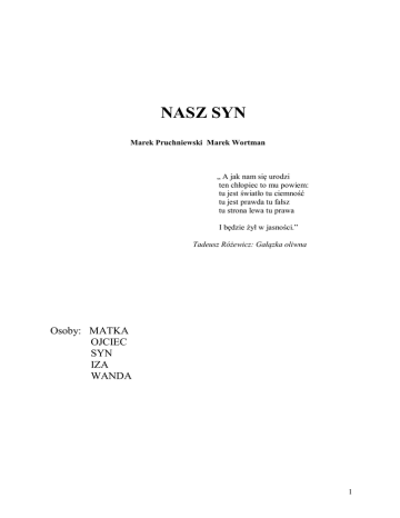 NASZ SYN Marek Pruchniewski Marek Wortman „ A jak nam się urodzi ten chłopiec to mu powiem: tu jest światło tu ciemność tu jest prawda tu fałsz tu strona lewa tu prawa I będzie żył w jasności.” Tadeusz Różewicz: Gałązka oliwna Osoby: MATKA OJCIEC SYN IZA WANDA 1 1. Wchodzi Matka. Stawia na stole trojaki z obiadem. OJCIEC Wreszcie... Michał, obiad przyszedł. MATKA A żebyś wiedział. Głos Syna zza drzwi. SYN Zaraz. OJCIEC Co garkuchnia dzisiaj daje? MATKA Szkolna stołówka nie garkuchnia. Trzeba podgrzać. Nóg nie czuję. OJCIEC Znowu pomidorowa? MATKA Na drugie jest mielony. Wchodzi Syn. Nalewa wodę do miski. Stawia miskę na podłodze. SYN Najpierw wymocz . Matka zdejmuje buty i podkolanówki. MATKA Co tu masz? SYN Gdzie? MATKA Tu na czole. SYN Draśnięcie. MATKA Co się stało? 2 SYN Nic. MATKA Przecież widzę. Co się stało? OJCIEC Stale to samo. Przyszli i chcieli procent od każdej cegły... MATKA No i co? OJCIEC Nic. Michał ich pogonił. MATKA Co wy mi opowiadacie? SYN Idę. MATKA Poczekaj, zaraz podgrzeję. SYN Spieszę się. MATKA Ale... SYN Zjem jak wrócę. Syn wychodzi. MATKA Mów jak było. OJCIEC Mówię. Michał wziął największą lagę i zaczął machać jak szalony... MATKA No i... OJCIEC 3 Pogonił im kota. MATKA Mów prawdę. OJCIEC Naprawdę ich pogonił. Podkulili kity i pojechali. MATKA Michał? OJCIEC Michał. Co tak patrzysz? MATKA I co teraz? OJCIEC A co ma być? MATKA Pewnie znowu przyjdą. OJCIEC Niech tylko spróbują. MATKA A jak spróbują? OJCIEC To będziemy się bronić. 2. Noc. Matka nagle siada na tapczanie. MATKA Śpisz? Wiem, że nie śpisz. OJCIEC Bo mi nie dajesz. Wiercisz się i wiercisz. Śpij. MATKA Jak mam spać... 4 OJCIEC Normalnie na boku. MATKA Śmiej się...śmiej. OJCIEC Ja całe życie śpię na boku. MATKA Nie wrócił. Jak nie wraca, to nie mogę zasnąć. OJCIEC Wrócił i dawno śpi. MATKA Gdyby wrócił to bym słyszała. Matka idzie pod drzwi. OJCIEC Nie podsłuchuj. MATKA Nie podsłuchuję. OJCIEC Tylko co? MATKA Sprawdzam czy jest w domu. OJCIEC Daj mu żyć. MATKA O co ci chodzi? Możesz spać to śpij. Ja ci nie bronię. OJCIEC Pewnie został u niej. Jest dorosły . Nie zauważyłaś tego? MATKA Zauważyłam. OJCIEC 5 To śpij. MATKA Wolałam jak pracował w zajezdni. OJCIEC Ale go zwolnili. Pracujemy razem i jest dobrze. MATKA Dobrze... Rozbieranie murów, szlifowanie cegieł. I gangsterzy co was biją... OJCIEC Tylko to zostało. Nic więcej. MATKA Widziałeś jego ręce? Opuchnięte, poranione... OJCIEC A moje widziałaś? MATKA Zrogowaciałe. OJCIEC Nawet na tokarce takich nie miałem. MATKA Zawsze miałeś delikatne dłonie. OJCIEC Kiedy to było. MATKA Ciii... OJCIEC Co ciii? Zza ściany dobiega odgłos otwieranych drzwi. MATKA Wrócił. Gdzie on był tak długo? Która godzina? 6 OJCIEC Późno. Nie pamiętasz, kiedy ja od ciebie wychodziłem? MATKA Co mam nie pamiętać. Matka kładzie się. MATKA Teraz zasnę. Po chwili. OJCIEC Śpisz? MATKA Prawie. OJCIEC Wszystko mi się przypomniało. Jak zostawałem u ciebie... Jak się kochaliśmy. Pamiętasz? MATKA Pewnie, że pamiętam. OJCIEC Pięknie było.. MATKA I jest. Teraz śpimy. Po chwili. MATKA Zdrowaś Mario, łaskiś pełna, Pan z Tobą, błogosławionaś Ty między niewiastami i błogosławoiny owoc żywota twego, Jezus. ...Święta Maryjo, Matko Boża, módl się za nami grzesznymi teraz i w godzinę śmierci naszej... 3. Wchodzi Syn. SYN 7 Cześć. MATKA Zaraz będzie śniadanie. SYN Nie jestem głodny. MATKA Zrobię kanapki. Weźmiesz ze sobą. Późno wczoraj wróciłeś... Nie mogłam spać to słyszałam. Wypij chociaż herbatę. SYN Spieszę się. MATKA Dokąd? SYN Mam pracę. MATKA Pracę? SYN Załapałem się w markecie. MATKA Naprawdę? Masz umowę? SYN Jeszcze nie, ale... MATKA To co robisz? SYN Zbieram wózki z całego placu. MATKA No i...? SYN Potem idę na zaplecze...sortuję kartony. MATKA 8 Kartony... SYN Kartony, kartony. To się nazywa okres próbny. Słychać dźwięk karetki pogotowia. MATKA Znowu coś się stało. Gdzieś blisko. SYN Lecę. MATKA No leć. SYN Mamo... MATKA Co ? SYN Iza ... MATKA Co? SYN Jesteśmy razem. MATKA Przyjdź z nią kiedyś. Co tak patrzysz? Jestem ciekawa. Przecież jej nie znam. Zrobię coś dobrego. SYN Dobra. To idę. MATKA Zostaw rzeczy do wyprania. SYN Nic nie mam... MATKA 9 W tej koszuli chodzisz trzeci dzień. SYN Jest czysta. MATKA Zdejmuj...zdejmuj. Co tak się chowasz? SYN Duży jestem. Nie zauważyłaś? MATKA Zauważyłam Potem ona będzie ci prała. Syn wkłada czystą koszulę. SYN Powiedziała, że jak wszystko urządzę to... MATKA Co.... SYN Będzie ze mną. MATKA Jak będzie? SYN Normalnie. Zamieszkamy razem... MATKA Gdzie? SYN Tutaj. U mnie. MATKA Kochacie się? SYN Mamo... MATKA To dobrze. SYN 10 Lecę. Całuje Matkę w policzek. MATKA Leć, leć. Syn wychodzi. MATKA Michał.. Kanapki. 4. Matka sama. Pukanie do drzwi. MATKA Proszę. Otwarte. Na progu, oparta o framugę siedzi skulona Wanda. MATKA Wanda ... Boże... Co się stało? Co ci jest? Wstań. Co się stało? Matka prowadzi Wandę do stołu i sadza na krześle. MATKA Na litość boską co się stało? WANDA On...w nocy. MATKA No mów. Kto? WANDA Stefan. MATKA Co mu jest? WANDA 11 Leży tam. W cukierni... Teresa... on nie żyje! MATKA Co?! WANDA Nie żyje. Boże... Muszę do niego. Wanda potyka się i osuwa na podłogę. Matka ją podnosi. MATKA Wanda... Wanda! WANDA Muszę... 5. Matka wrzuca rzeczy do pralki „Frania”. Wchodzi Ojciec. OJCIEC Wiesz? MATKA Wiem. Wanda tu była. Nie mogła wykrztusić słowa...Prawie zasłabła. Zrozumiałam tylko, że ... umarł w nocy. OJCIEC Umarł...? Syreny nie słyszałaś? MATKA Powiedz wreszcie co się stało. OJCIEC Zabity. MATKA Rożek zabity? OJCIEC Nie rozumiesz co mówię. Zabił go ktoś. 12 Wieczorem albo w nocy. MATKA Jak to zabity? OJCIEC Normalnie...na śmierć. Głowa rozbita. Wszystko we krwi. Jedna miazga MATKA Ale... Coś zginęło? OJCIEC Skąd mam wiedzie