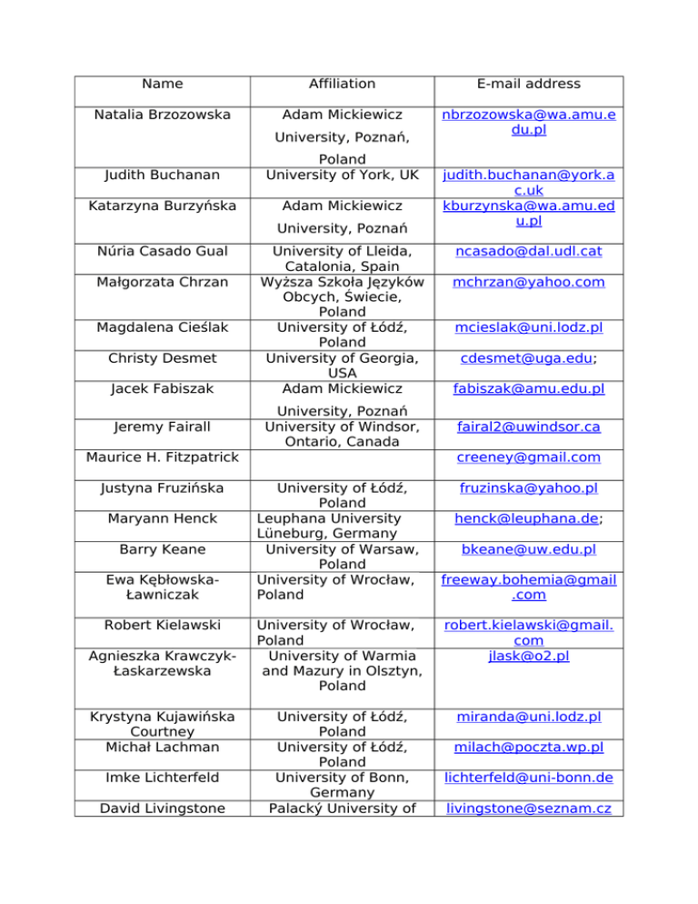 Name Affiliation E-mail address Natalia Brzozowska Adam Mickiewicz [email protected] du.pl University, Poznań, Judith Buchanan Poland University of York, UK Katarzyna Burzyńska Adam Mickiewicz University, Poznań Núria Casado Gual Małgorzata Chrzan Magdalena Cieślak Christy Desmet Jacek Fabiszak Jeremy Fairall University of Lleida, Catalonia, Spain Wyższa Szkoła Języków Obcych, Świecie, Poland University of Łódź, Poland University of Georgia, USA Adam Mickiewicz University, Poznań University of Windsor, Ontario, Canada Maurice H. Fitzpatrick Justyna Fruzińska Maryann Henck Barry Keane Ewa KębłowskaŁawniczak Robert Kielawski Agnieszka KrawczykŁaskarzewska Krystyna Kujawińska Courtney Michał Lachman Imke Lichterfeld David Livingstone [email protected] c.uk [email protected] u.pl [email protected] [email protected] [email protected] [email protected]; [email protected] [email protected] [email protected] University of Łódź, Poland Leuphana University Lüneburg, Germany University of Warsaw, Poland University of Wrocław, Poland [email protected] [email protected]; [email protected] freeway.bohemia@gmail .com University of Wrocław, Poland University of Warmia and Mazury in Olsztyn, Poland robert.kielawski@gmail. com [email protected] University of Łódź, Poland University of Łódź, Poland University of Bonn, Germany Palacký University of [email protected] [email protected] [email protected] [email protected] Edyta Lorek-Jezińska Agnieszka Łowczanin Joanna Matyjaszczyk Ewa Mazierska Mirowska Paulina Katarzyna Ojrzyńska Marta Olasik Agnieszka Rasmus Ellen Redling Natalia Sabiniarz Monika Sarul Artur Skweres Monika Sosnowska Piotr Spyra Kay Stanton Justyna Stępień Dana Strakova Anna SuwalskaKołecka Magda Szuster Olomouc, Czech Republic Nicolaus Copernicus University, Toruń, Poland University of Łódź, Poland University of Łódź, Poland [email protected] [email protected] [email protected] l University of Central Lancashire, UK University of Łódź, Poland University of Łódź, Poland University of Warsaw, Poland University of Łódź, Poland University of Heidelberg, Germany [email protected] km [email protected] Nicolaus Copernicus University, Toruń, Poland University of Łódź, Poland [email protected] Adam Mickiewicz University, Poznań, Poland University of Łódź, Poland University of Łódź, Poland Fullerton California State University, USA University of Szczecin, Poland Palacký University of Olomouc, Czech Republic The State School of Higher Professional Education in Plock, Poland University of Łódź, Poland [email protected] [email protected] [email protected] [email protected] [email protected] m [email protected] m [email protected] l [email protected] [email protected] [email protected]. uk [email protected] m prorektor.stud@pwszplo ck.pl [email protected] om Agnieszka Szwach Jan Kochanowski Univer sity in Kielce, Poland Preti Taneja Royal Holloway, University of London, UK Jadwiga Uchman University of Łódź, Poland Andrzej Wicher University of Łódź, Poland Maciej Wieczorek University of Łódź, Poland Katarzyna Więckowska Nicolaus Copernicus University, Toruń, Poland Dorota Wiśniewska University of Łódź, Poland Joanna Zadarko Adam Mickiewicz University in Poznan, Poland Magdalena University of Gdańsk, Zegarlińska Poland [email protected] [email protected]; [email protected] [email protected] [email protected] [email protected] [email protected] [email protected] m [email protected]
