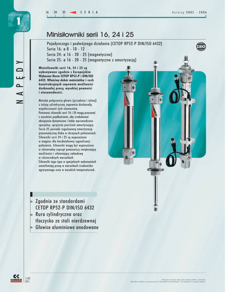 16 24 25 S E R I A Katalog 2005 - 2006 1 Minisi³owniki serii 16, 24 i 25 N A P Ę D Y Pojedynczego i podwójnego działania (CETOP RP52-P DIN/ISO 6432) Seria 16: ø 8 - 10 - 12 Seria 24: ø 16 - 20 - 25 (magnetyczne) Seria 25: ø 16 - 20 - 25 (magnetyczne z amortyzacją) Minisiłowniki serii 16, 24 i 25 są wykonywane zgodnie z Europejskim Wykazem Norm CETOP RP52-P i DIN/ISO 6432. Właściwy dobór materiałów i cech konstrukcyjnych zapewnia możliwości doskonałej pracy, wysokiej pewności i niezawodności. Metoda połączenia głowic (przedniej i tylnej) z tuleją cylindryczną zapewnia doskonałą współosiowość tych elementów. Ponieważ siłowniki serii 16 i 24 mogą pracować z wysokimi prędkościami, aby zredukować obciążenia dynamiczne i hałas wprowadzono specjalny, sprężysty pierścień amortyzujący. Seria 25 posiada regulowaną amortyzację pneumatyczną tłoka w skrajnych położeniach. Siłowniki serii 24 i 25 są wyposażone w magnes dla bezdotykowej sygnalizacji położenia. Siłowniki mogą być wyposażone w różnorodny osprzęt pomocniczy zwiększający możliwości i ułatwiający zabudowę w różnorodnych warunkach. Siłowniki tego typu w specjalnych wykonaniach umożliwiają pracę w warunkach środowiska agresywnego oraz w wysokich temperaturach. Zgodnie ze standardami CETOP RP52-P DIN/ISO 6432 Rura cylindryczna oraz tłoczysko ze stali nierdzewnej Głowice aluminiowe anodowane 1.02 001 Pr o d u c e n t z a s t r z e g a s o b i e p r a w o z m i a n y m o d e l u i w y m i a r ó w . Wszystkie produkty są przeznaczone do zastosowań przemysłowych i nie mogą być w sprzedaży ogólnej. S E R I A Katalog 2005 - 2006 16 24 25 1 DANE OGÓLNE głowice gwintowane, zagniecione pojedynczego i podwójnego działania głowice - aluminium, rura cylindryczna i tłoczysko - stal nierdzewna uszczelki - poliuretan, pozostałe elementy - patrz oznaczenia nakrętki, kołnierze, łapy, uchwyty wahliwe Seria 16 ø 8 ÷ ø 10: 10 - 250 mm / Seria 16: ø 12: 10 - 300 mm Seria 24 i 25 ø 16: 10 - 600 mm; ø 20 - ø 25: 10 - 1000 mm Seria 16: ø 8, 10, 12 / Seria 24 e 25: ø 16, 20, 25 0° ÷ 80°C (dla suchego powietrza -20°C) Uchwyty montażowe Zakres skoków Zakres temperatur N A P Ę D Y Rodzaj konstrukcji Działanie Materiały DANE PNEUMATYCZNE Ciśnienie pracy 1 ÷ 10 bar (podwójnego działania); 2 ÷ 10 bar (pojedynczego działania) Czynnik powietrze filtrowane, bez smarowania* Prędkość ruchu 10 ÷ 1000 mm/sek (bez obciążenia) * Jeśli prowadzone jest smarowanie powietrza, zalecany jest olej ISOVG32 (raz rozpoczęty proces smarowania musi być kontynuowany do końca eksploatacji) OZNACZENIE MINISIŁOWNIKÓW 24N2A16A100 SERIA 16 = niemagnetyczny 24 = magnetyczny 25 = magnetyczny z amortyzacją SPECJALNY - wyszczególnić V = uszczelnienie vitonowe tłoczyska ODMIANA N =standard SKOKI (patrz tabela) Uwaga: Siłowniki dostarczane są w komplecie z zamontowanymi nakrętkami (głowicy i tłoczyska) natomiast pozostałe elementy wyposażenia są dostarczane oddzielnie. DZIAŁANIE 1 = pojedynczego działania (pchający) 2 = podwójnego działania 3 = podwójnego działania, obustronne tłoczysko 7 = pojedynczego działania, obustronne tłoczysko RODZAJ WYPOSAŻENIA A = standard nakrętka na głowicy przedniej i nakrętka tłoczyska RL = hamulec tłoczyska ŚREDNICA TŁOKA 8 mm 16 mm 10 mm 20 mm 12 mm 25 mm STOSOWANE MATERIAŁY A = tłoczysko i rura - stal nierdzewna głowice - aluminium anodowane TABELA POKAZUJĄCA ZNORMALIZOWANE SKOKI MINISIŁOWNIKÓW podwójnego działania pojedynczego działania Seria 16 16 16 24 24 24 25 25 25 ø 8 10 12 16 20 25 16 20 25 10 25 40 50 Standardowe skoki siłowników 80 100 125 160 Pr o d u c e n t z a s t r z e g a s o b i e p r a w o z m i a n y m o d e l u i w y m i a r ó w . Wszystkie produkty są przeznaczone do zastosowań przemysłowych i nie mogą być w sprzedaży ogólnej. 200 250 300 320 400 500 1.02 002 16 24 S E R I A 25 Katalog 2005 - 2006 1 N A P Ę D Y TABELE PRZEDSTAWIAJĄCE SIŁY SPRĘŻYNY POWROTNEJ MINISIŁOWNIKÓW POJEDYNCZEGO DZIAŁANIA SERII 16 I 24 ø mm Skok mm 8 8 8 8 10 10 10 10 10 25 40 50 10 25 40 50 F1 (N) Tłoczysko cofnięte 5,14 4,15 3,16 2,5 5,14 4,15 3,16 2,5 F2 (N) Tłoczysko wysunięte 5,8 5,8 5,8 5,8 5,8 5,8 5,8 5,8 ø mm 12 12 12 12 16 16 16 16 Siły sprężyny powrotnej F1 (N) Skok Tłoczysko mm cofnięte 10 7,18 25 6,475 40 5,77 50 5,3 10 12,66 25 10,8 40 8,94 50 7,7 F2 (N) Tłoczysko wysunięte 7,65 7,65 7,65 7,65 13,9 13,9 13,9 13,9 EE M5 M5 M5 M5 G1/8 G1/8 L2 46 46 50 56 68 69,5 ø mm Skok mm 20 20 20 20 25 25 25 25 10 25 40 50 10 25 40 50 F1 (N) Tłoczysko cofnięte 20,96 18,05 15,14 13,2 23 20 17 15 F2 (N) Tłoczysko wysunięte 22,9 22,9 22,9 22,9 25 25 25 25 Minisi³owniki serii 16 - 24 - 25 + = dodać skok WYMIARY Seria 16 16 16 24-25 24-25 24-25 1.02 003 ø 8 10 12 16 20 25 EW KW BE 8 7 M12 x1,25 8 7 M12 x1,25 12 8 M16 x1,5 12 8 M16 x1,5 16 10 M22 x1,5 16 10 M22 x1,5 KK M4 x 0,7 M4 x 0,7 M6 x1 M6 x1 M8 x1,25 M10 x1,25 øCD øD1 4 9,3 4 11,3 6 14 6 18 8 22 8 27 Ø D2 4 4 6 6 8 10 L1 86 86 105 111 132 141,5 XC 64 64 75 82 95 104 AM 12 12 16 16 20 22 L3 10 10 15 15 18 20 L4 4,5 4,5 4,5 4 8 8 L5 12 12 17 17 20 22 L 6 6 9 9 12 12 WF 16 16 22 22 24 28 L6 9 9 9 10 16 16 L7 28 28 38 38 44 50 KV 19 19 24 24 32 32 SW 5 5 7 9 D 15 15 20 20 27 27 Pr o d u c e n t z a s t r z e g a s o b i e p r a w o z m i a n y m o d e l u i w y m i a r ó w . Wszystkie produkty są przeznaczone do zastosowań przemysłowych i nie mogą być w sprzedaży ogólnej. S E R I A Katalog 2005 - 2006 16 24 25 1 Minisi³owniki serii 16 - 24 - 25 Z obustronnym tłoczyskiem. N A P Ę D Y + = dodać skok ++ = dodać dwa razy skok WYMIARY Seria 16 16 16 24-25 24-25 24-25 ø 8 10 12 16 20 25 KW 7 7 8 8 10 10 BE M12 x1,25 M12 x1,25 M16 x1,5 M16 x1,5 M22 x1,5 M22 x1,5 KK M4 x 0,7 M4 x 0,7 M6 x1 M6 x1 M8 x1,25 M10 x1,25 øD1 9,3 11,3 14 18 22 27 EE M5 M5 M5 M5 G1/8 G1/8 Ø D2 4 4 6 6 8 10 L1 102 102 126 132 156 169,5 L2 46