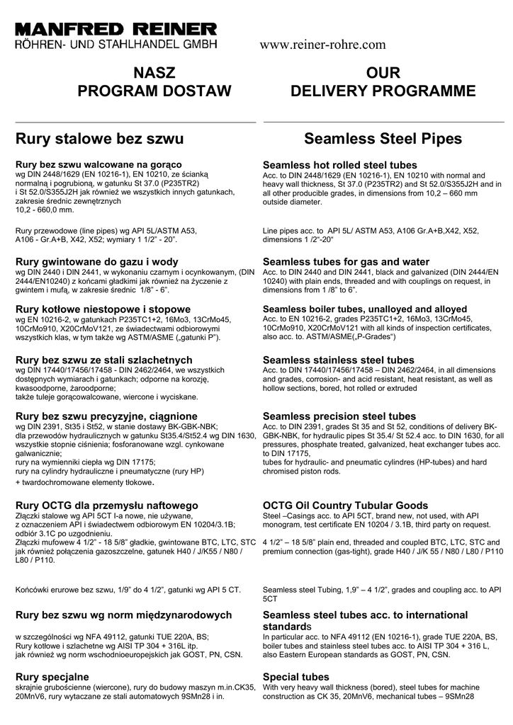 www.reiner-rohre.com NASZ PROGRAM DOSTAW Rury stalowe bez szwu Rury bez szwu walcowane na gorąco wg DIN 2448/1629 (EN 10216-1), EN 10210, ze ścianką normalną i pogrubioną, w gatunku St 37.0 (P235TR2) i St 52.0/S355J2H jak również we wszystkich innych gatunkach, zakresie średnic zewnętrznych 10,2 - 660,0 mm. OUR DELIVERY PROGRAMME Seamless Steel Pipes Seamless hot rolled steel tubes Acc. to DIN 2448/1629 (EN 10216-1), EN 10210 with normal and heavy wall thickness, St 37.0 (P235TR2) and St 52.0/S355J2H and in all other producible grades, in dimensions from 10,2 – 660 mm outside diameter. Rury przewodowe (line pipes) wg API 5L/ASTM A53, A106 - Gr.A+B, X42, X52; wymiary 1 1/2” - 20”. Line pipes acc. to API 5L/ ASTM A53, A106 Gr.A+B,X42, X52, dimensions 1 /2“-20“ Rury gwintowane do gazu i wody Seamless tubes for gas and water wg DIN 2440 i DIN 2441, w wykonaniu czarnym i ocynkowanym, (DIN 2444/EN10240) z końcami gładkimi jak również na życzenie z gwintem i mufą, w zakresie średnic 1/8” - 6”. Acc. to DIN 2440 and DIN 2441, black and galvanized (DIN 2444/EN 10240) with plain ends, threaded and with couplings on request, in dimensions from 1 /8” to 6”. Rury kotłowe niestopowe i stopowe Seamless boiler tubes, unalloyed and alloyed wg EN 10216-2, w gatunkach P235TC1+2, 16Mo3, 13CrMo45, 10CrMo910, X20CrMoV121, ze świadectwami odbiorowymi wszystkich klas, w tym także wg ASTM/ASME („gatunki P”). Acc. to EN 10216-2, grades P235TC1+2, 16Mo3, 13CrMo45, 10CrMo910, X20CrMoV121 with all kinds of inspection certificates, also acc. to. ASTM/ASME(„P-Grades“) Rury bez szwu ze stali szlachetnych Seamless stainless steel tubes wg DIN 17440/17456/17458 - DIN 2462/2464, we wszystkich dostępnych wymiarach i gatunkach; odporne na korozję, kwasoodporne, żaroodporne; także tuleje gorącowalcowane, wiercone i wyciskane. Acc. to DIN 17440/17456/17458 – DIN 2462/2464, in all dimensions and grades, corrosion- and acid resistant, heat resistant, as well as hollow sections, bored, hot rolled or extruded Rury bez szwu precyzyjne, ciągnione Seamless precision steel tubes wg DIN 2391, St35 i St52, w stanie dostawy BK-GBK-NBK; dla przewodów hydraulicznych w gatunku St35.4/St52.4 wg DIN 1630, wszystkie stopnie ciśnienia; fosforanowane wzgl. cynkowane galwanicznie; rury na wymienniki ciepła wg DIN 17175; rury na cylindry hydrauliczne i pneumatyczne (rury HP) + twardochromowane elementy tłokowe. Acc. to DIN 2391, grades St 35 and St 52, conditions of delivery BKGBK-NBK, for hydraulic pipes St 35.4/ St 52.4 acc. to DIN 1630, for all pressures, phosphate treated, galvanized, heat exchanger tubes acc. to DIN 17175, tubes for hydraulic- and pneumatic cylindres (HP-tubes) and hard chromised piston rods. Rury OCTG dla przemysłu naftowego OCTG Oil Country Tubular Goods Złączki stalowe wg API 5CT I-a nowe, nie używane, z oznaczeniem API i świadectwem odbiorowym EN 10204/3.1B; odbiór 3.1C po uzgodnieniu. Złączki mufowew 4 1/2” - 18 5/8” gładkie, gwintowane BTC, LTC, STC jak również połączenia gazoszczelne, gatunek H40 / J/K55 / N80 / L80 / P110. Steel –Casings acc. to API 5CT, brand new, not used, with API monogram, test certificate EN 10204 / 3.1B, third party on request. Końcówki erurowe bez szwu, 1/9” do 4 1/2”, gatunki wg API 5 CT. Seamless steel Tubing, 1,9” – 4 1/2”, grades and coupling acc. to API 5CT Rury bez szwu wg norm międzynarodowych Seamless steel tubes acc. to international standards w szczególności wg NFA 49112, gatunki TUE 220A, BS; Rury kotłowe i szlachetne wg AISI TP 304 + 316L itp. jak również wg norm wschodnioeuropejskich jak GOST, PN, CSN. In particular acc. to NFA 49112 (EN 10216-1), grade TUE 220A, BS, boiler tubes and stainless steel tubes acc. to AISI TP 304 + 316 L, also Eastern European standards as GOST, PN, CSN. Rury specjalne Special tubes 4 1/2” – 18 5/8” plain end, threaded and coupled BTC, LTC, STC and premium connection (gas-tight), grade H40 / J/K 55 / N80 / L80 / P110 skrajnie grubościenne (wiercone), rury do budowy maszyn m.in.CK35, With very heavy wall thickness (bored), steel tubes for machine 20MnV6, rury wytaczane ze stali automatowych 9SMn28 i in. construction as CK 35, 20MnV6, mechanical tubes – 9SMn28 Rury ze szwem Welded Steel Tubes Rury ze szwem Welded steel tubes wg DIN 2458/1626 EN 10217-1 na przewody; EN 10217-2 kotłowe normalne i grubościenne; EN 10219/EN10210 dla xcelów konstrukcyjnych we wszystkich używanych gatunkach, w zakresie średnic 10,2 - 2 220 mm; także wg norm zagranicznych jak API, ASTM, GOST i in. Acc. to DIN 2458/ 1626 EN10217-1 for pipelines, EN 10217-2 for boiler production, with normal and heavy wall thickness, EN 10219/EN 10210 for construction purposes, in all usual grades, in dimensions from 10,2 – 2.220 mm outside diameter, also acc. to international standards as API, ASTM, GOST, i.a. Rury ze szwem precyzyjne Welded precision steel tubes wg DIN 2393 i 2394, we wszystkich odmianach (m.in. rury na cylindry i przenośniki rolkowe, jak również wg norm zagranicznych). Acc. to DIN 2393 and 2394, in all different kinds (i.a. cylinder tubes and tubes for supporting rollers), as well as acc. to international standards Rury ze szwem szlachetne Welded stainless steel tubes wg DIN 17440/17445/17457-DIN 2463/2465, we wszystkich Acc. to DIN 17440/17455/17457-DIN 2463/2465, in all dimensions używanych gatunkach, odporne na korozję, kwaso- i żaroodporne, jak and grades, corrosion- and acid resistant, heat resistant, as well as też wg norm zagranicznych jak AISI, ANSI itd acc. to international standards as AISI, ANSI, i.a. Wykonania specjalne Manufacturing on Request Rury skrajnie duże i grubościenne Steel tubes with very big out. diam. and heavy wall thickness wg życzeń klienta do średnicy ponad 4500 mm. On request of customer up to outside diameter 4500 mm Rury kołnierzowe, elementy odkuwane matrycowo i in. Flange tubes, Drop Forgings and others Rury profilowe Spec
