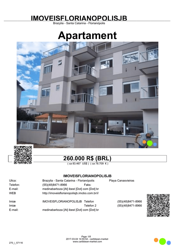 IMOVEISFLORIANOPOLISJB Brazylia - Santa Catarina - Florianópolis Apartament Poùoýenie obiektu : Brazylia - Santa Catarina - Florianópolis 260.000 R$ (BRL) ( ca 83.467 US$ ) ( ca 78.709 € ) IMOVEISFLORIANOPOLISJB Ulica: Telefon: E-mail: WEB Brazylia - Santa Catarina - Florianópolis (55)(48)8471-8966 Faks: medinabarboza [At] ibest [Dot] com [Dot] br http://imoveisflorianopolisjb.imobo.com.br/i/ Imiæ Imiæ E-mail: IMOVEISFLORIANOPOLISJB Telefon Telefon 2 medinabarboza [At] ibest [Dot] com [Dot] br 270_i_57116 Page 1/8 2017-03-04 14:55:54 - caribbean-market www.caribbean-market.com Playa Canasvieiras (55)(48)8471-8966 (55)(48)8471-8966 IMOVEISFLORIANOPOLISJB Brazylia - Santa Catarina - Florianópolis Numer kodu Typ budynku Poùoýenie Materiaùy Property Address 270_i_57116 Apartament Seafront Powierzchnia dziaùki Firma Ýycie Kuchnia Sypialnie Zùy Opinie Toaleta 63 m2 Powierzchnia 6 m2 1 2 2 Biznes Inne Usùugi Garaý Carport zadaszony taras 1 Dojazd: 300 m Numer kodu Nr referencyjny krótki Status objektet Nowy Rok 2014 Playa CANASVIEIRAS 300mt del Mar-FLORIANÓPOLIS-BRAZIL Pieszo Plaýa Akcesoria Dzierýawa Taras Balkon Jetty Pokój Party Klimatyzacja Resort Ogród Pralnia Goràcy zadaszony taras ogrodzony / murem 270_i_57116 Page 2/8 2017-03-04 14:55:54 - caribbean-market www.caribbean-market.com IMOVEISFLORIANOPOLISJB Brazylia - Santa Catarina - Florianópolis 270_i_57116 Page 3/8 2017-03-04 14:55:54 - caribbean-market www.caribbean-market.com IMOVEISFLORIANOPOLISJB Brazylia - Santa Catarina - Florianópolis 270_i_57116 Page 4/8 2017-03-04 14:55:54 - caribbean-market www.caribbean-market.com IMOVEISFLORIANOPOLISJB Brazylia - Santa Catarina - Florianópolis 270_i_57116 Page 5/8 2017-03-04 14:55:54 - caribbean-market www.caribbean-market.com IMOVEISFLORIANOPOLISJB Brazylia - Santa Catarina - Florianópolis 270_i_57116 Page 6/8 2017-03-04 14:55:54 - caribbean-market www.caribbean-market.com IMOVEISFLORIANOPOLISJB Brazylia - Santa Catarina - Florianópolis 270_i_57116 Page 7/8 2017-03-04 14:55:54 - caribbean-market www.caribbean-market.com IMOVEISFLORIANOPOLISJB Brazylia - Santa Catarina - Florianópolis 270_i_57116 Page 8/8 2017-03-04 14:55:54 - caribbean-market www.caribbean-market.com
