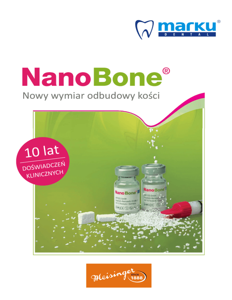 Nowy wymiar odbudowy koœci 10 lat CZ E Ñ DOŒWIAD CH KLINICZNY Wyj¹tkowa struktura NanoBone® NanoBone® jest materia³em biomimetycznym wzorowanym na naturalnych procesach zachodz¹cych podczas odbudowy koœci. Struktura materia³u koœciotwórczego jest bardzo podobna do struktury koœci naturalnej. Dziêki po³¹czeniu nanokrystalicznego hydroksyapatytu (HA), który jest g³ównym sk³adnikiem koœci autologicznej i nanocz¹steczkowej struktury ¿elowej matrycy krzemionkowej, która aktywnie pobudza proces formowania siê nowej koœci, odbudowa koœci przebiega w naturalnym procesie remodelingu. Nanokrystaliczny hydroksyapatyt zawarty w NanoBone® ma tak¹ sam¹ morfologiê jak koœæ autologiczna. Nisko-temperaturowa technologia wytwarzania pozostawia hydroksyapatyt w postaci niesynteryzowanej. Krzem zawarty w ¿elowej matrycy krzemionkowej jest niezbêdnym pierwiastkiem œladowym dla zdrowych w³osów, paznokci, skóry oraz koœci. Jest równie¿ istotnym elementem komórek koœciotwórczych i odpowiada za odbudowê tkanki kostnej i jej jakoœæ. G³ówne zalety Syntetyczny materia³ koœciotwórczy NanoBone® nie zawiera sk³adników pochodzenia ludzkiego czy zwierzêcego co eliminuje ryzyko przeniesienia infekcji. Równie¿ kwestie etyczne zwi¹zane z zastosowaniem materia³ów syntetycznych nie stanowi¹ problemu dla pacjentów. Nowoczesna technologia wytwarzania gwarantuje najwy¿sz¹ jakoœæ produktu. Natruralny proces remodelingu Dziêki unikalnej nanostrukturze NanoBone®, przebudowa koœci przebiega w sposób ca³kowicie naturalny: osteoklasty rozpuszczaj¹ materia³, a osteoblasty tworz¹ now¹ koœæ. Procesy resorpcji materia³u i tworzenia koœci s¹ po³¹czone. Wyniki leczenia s¹ powtarzalne i przewidywalne. Kontrolowana osteoindukcja NanoBone® posiada w³aœciwoœci osteokondukcyjne i osteoindukcyjne, co oznacza, ¿e aktywnie pobudza proces tworzenia siê nowej koœci, a nie jest jedynie rusztowaniem. NanoBone®: naturalny remodeling - od biomateria³u do naturalnej koœci 1 2 Augmentacja materia³em NanoBone® Wyj¹tkowo du¿a wewnêtrzna powierzchnia u³atwia adhezjê protein Dziêki specjalnej nanostrukturze wszystkie produkty NanoBone® posiadaj¹ bardzo du¿¹ wewnêtrzn¹ powierzchniê. Jest to kluczowy czynnik u³atwiaj¹cy adhezjê protein i szybk¹ regeneracjê koœci. A B C D NanoBone® oferowany jest w ró¿nych formach aplikacyjnych dla ³atwiejszego zastosowania w ka¿dej sytuacji klinicznej: E NanoBone® granulat, fine (0,6mm) i coarse (1,0 mm) NanoBone® blok NanoBone® putty A • NanoBone® putty (206.8 m²/g) B • Organiczny HA (c.200 m²/g)* C • Niesynteryzowany HA pochodzenia zwierzêcego (79 m²/g) D • Beta TCP (1.2 m²/g) E • Bioszk³o (0.4 m²/g) *Hench L, An Introduction to Bioceramics, World Scientifi c, 1993. £atwa i szybka aplikacja materia³u. 3 4 Zmiana matrycy - biologizacja i angiogeneza Naturalny proces przebudowy koœci (remodeling) Ju¿ w ci¹gu zaledwie kilku dni, ¿elowa matryca krzemionkowa zostaje zast¹piona przez organiczn¹ matrycê o tej samej objêtoœci. Pojawiaj¹ siê kluczowe w regeneracji koœci bia³ka, takie jak osteopontyna, osteokalcyna oraz bia³ka morfogenetyczne koœci BMP-2 * Nanostruktura materia³u sprzyja bardzo szybkiemu rozwojowi procesu angiogenezy, co jest podstaw¹ szybkiego formowania siê koœci. Wyj¹tkowa struktura NanoBone® sprawia, ¿e organizm akceptuje materia³ jako autologiczny. Dlatego w³aœnie osteoklasty i osteoblasty przekszta³caj¹ NanoBone® w naturaln¹ koœæ w procesie remodelingu. matryca organiczna Osteoklasty Osteoblasty a stn ko z ier ac M SiO2 Nowa koœæ Makrofagi *Götz et al: Immunohistochemical characterization of nanocrystalline hydroxyapatite silica gel (NanoBone) osteogenesis: A study on biopsies from human jaws. Clin Oral Implants Res 2008;19(10):1016-1026 5 6 Implantacja Ca³kowita przebudowa Procedura wszczepienia implantu mo¿e zostaæ przeprowadzona ju¿ po 3 - 6 miesi¹cach od augmentacji w zale¿noœci od wskazañ: 12 miesiêcy 9 miesiêcy 3 miesi¹ce 6 miesiêcy • Po oko³o 10 dniach: zamiana matrycy • Od 3 miesi¹ca: mo¿liwe wszczepienie implantu po przeprowadzonej procedurze augmentacji zatoki szczêkowej* • Od 4 do 6 miesi¹ca po augmentacji zêbodo³u poekstrakcyjnego • Od 6 do 9 miesi¹ca po rekonstrukcji poziomej wyrostka zêbodo³owego z wykorzystaniem bloku kostnego NanoBone® • Po oko³o 12 miesi¹cach: NanoBone® ulega pe³nej biodegradacji, powstaje ca³kowicie autologiczna koœæ. *Meier et al: Application of the synthetic nanostructured bone-formation material NanoBone in the case of sinus floor elevation. Implantologie 2008;16(3):301-314 NanoBone® w ci¹gu 12 - 14 miesiêcy zostaje ca³kowicie zamieniony w procesie remodelingu w koœæ autologiczn¹.* Nie ma ¿adnych pozosta³oœci i cia³ obcych, pozostaje jedynie naturalna koœæ, idealna baza dla implantu. Naturalna koœæ *Götz et al: Immunohistochemical characterization of nanocrystalline hydroxyapatite silica gel (NanoBone) osteogenesis: A study on biopsies from human jaws. Clin Oral Implants Res 2008;19(10):1016-1026 NanoBone® dostêpny jest w ró¿nych formach u³atwiaj¹cych aplikacjê w konkretnej sytuacji klinicznej NanoBone® granulat NanoBone® block NanoBone® putty NanoBone® granulat jest dostêpny w dwóch wielkoœciach ziaren fine (0,6 mm) i coarse (1,0 mm), odpowiednich dla konkretnych wskazañ. Granulat mo¿na ³¹czyæ z krwi¹ pacjenta lub sterylnym roztworem fizjologicznym. Producent zaleca wymieszanie z krwi¹ pacjenta. NanoBone® granulat jest wysoce hydrofilny, dlatego szybko wch³ania krew czy sól fizjologiczn¹. Po wymieszaniu granulatu NanoBone® z krwi¹ powstaje materia³ o konsystencji pasty, któr¹ mo¿na ³atwo aplikowaæ szpatu³k¹ lub ³y¿k¹ do augmentacji. NanoBone® block zosta³ zaprojektowany przy wspó³pracy z lekarzami, jako alternatywa dla bloku koœci autologicznej. W zestawie z NanoBone® block znajduj¹ siê dwie œruby d