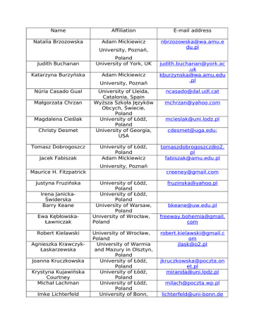 Name Affiliation E-mail address Natalia Brzozowska Adam Mickiewicz [email protected] du.pl University, Poznań, Judith Buchanan Poland University of York, UK Katarzyna Burzyńska Adam Mickiewicz University, Poznań Núria Casado Gual Małgorzata Chrzan Magdalena Cieślak Christy Desmet Tomasz Dobrogoszcz Jacek Fabiszak University of Lleida, Catalonia, Spain Wyższa Szkoła Języków Obcych, Świecie, Poland University of Łódź, Poland University of Georgia, USA University of Łódź, Poland Adam Mickiewicz [email protected] .uk [email protected] .pl [email protected] [email protected] [email protected] [email protected]; tomaszdobrogoszcz@o2. pl [email protected] University, Poznań Maurice H. Fitzpatrick Justyna Fruzińska Irena JanickaŚwiderska Barry Keane Ewa KębłowskaŁawniczak Robert Kielawski Agnieszka KrawczykŁaskarzewska Joanna Kruczkowska Krystyna Kujawińska Courtney Michał Lachman Imke Lichterfeld [email protected] University of Łódź, Poland University of Łódź, Poland University of Warsaw, Poland University of Wrocław, Poland University of Wrocław, Poland University of Warmia and Mazury in Olsztyn, Poland University of Łódź, Poland University of Łódź, Poland University of Łódź, Poland University of Bonn, [email protected] [email protected] freeway.bohemia@gmail. com [email protected] om [email protected] [email protected] et.pl [email protected] [email protected] [email protected] David Livingstone Edyta Lorek-Jezińska Agnieszka Łowczanin Joanna Matyjaszczyk Ewa Mazierska Mirowska Paulina Katarzyna Ojrzyńska Marta Olasik Agnieszka Rasmus Ellen Redling Natalia Sabiniarz Monika Sarul Artur Skweres Monika Sosnowska Piotr Spyra Kay Stanton Justyna Stępień Dana Strakova Magda Szuster Agnieszka Szwach Germany Palacký University of Olomouc, Czech Republic Nicolaus Copernicus University, Toruń, Poland University of Łódź, Poland University of Łódź, Poland University of Central Lancashire, UK University of Łódź, Poland University of Łódź, Poland University of Warsaw, Poland University of Łódź, Poland University of Heidelberg, Germany Kazimierz Wielki University in Bydgoszcz, Toruń, Poland University of Łódź, Poland Adam Mickiewicz University, Poznań, Poland University of Łódź, Poland University of Łódź, Poland Fullerton California State University, USA University of Szczecin, Poland Palacký University of Olomouc, Czech Republic University of Łódź, Poland Jan Kochanowski University in Kielce, [email protected] [email protected] [email protected] [email protected] [email protected] km [email protected] [email protected] [email protected] [email protected] [email protected] [email protected] [email protected] [email protected] m [email protected] [email protected] [email protected] [email protected]. uk [email protected] m [email protected] m [email protected] Poland Jadwiga Uchman University of Łódź, Poland [email protected] Dara Weinberg University of Łódź, Poland [email protected] m Andrzej Wicher University of Łódź, Poland Maciej Wieczorek University of Łódź, Poland Katarzyna Więckowska Nicolaus Copernicus University, Toruń, Poland Dorota Wiśniewska University of Łódź, Poland Joanna Zadarko Adam Mickiewicz University in Poznan, Poland [email protected] [email protected] [email protected] [email protected] [email protected]