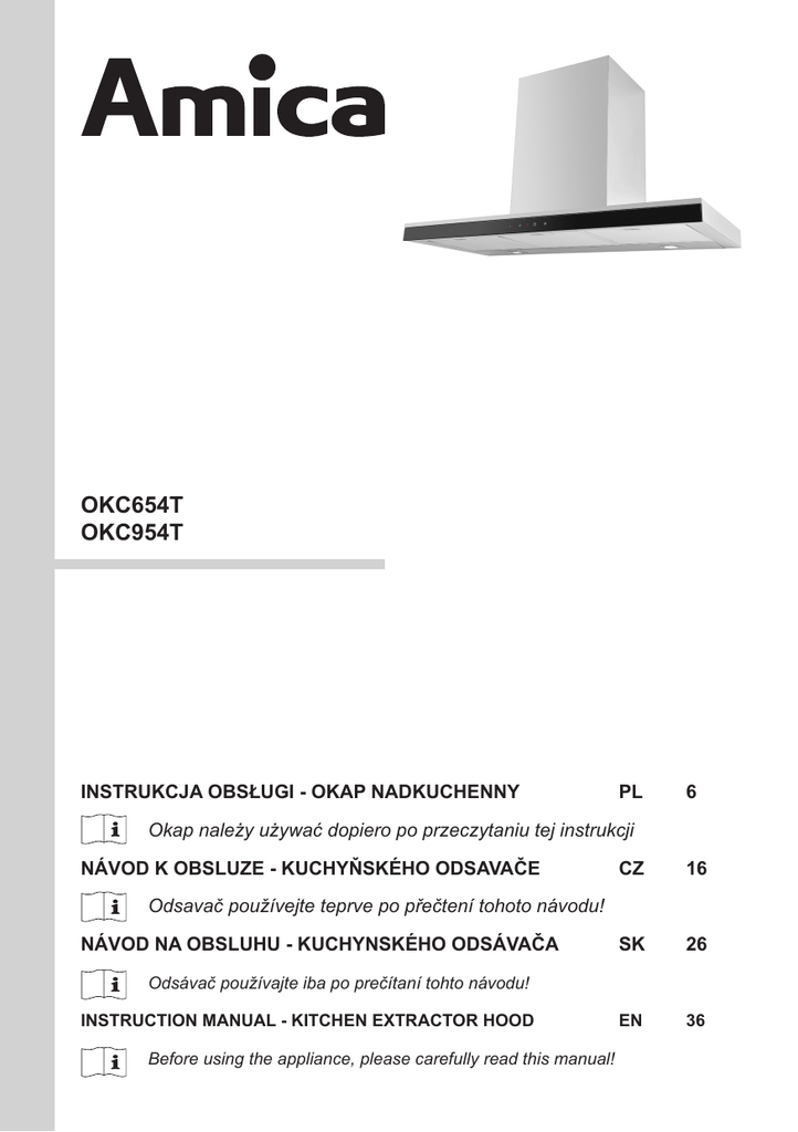 OKC654T OKC954T INSTRUKCJA OBSŁUGI - OKAP NADKUCHENNY 16 SK 26 EN 36 Odsávač používajte iba po prečítaní tohto návodu! INSTRUCTION MANUAL - KITCHEN EXTRACTOR HOOD CZ Odsavač používejte teprve po přečtení tohoto návodu! NÁVOD NA OBSLUHU - KUCHYNSKÉHO ODSÁVAČA 6 Okap należy używać dopiero po przeczytaniu tej instrukcji NÁVOD K OBSLUZE - KUCHYŇSKÉHO ODSAVAČE PL Before using the appliance, please carefully read this manual! min 650mm Gas cookers min 450mm Electrical cookers min 650mm Gas cookers 1b 1a 1c 2a X ELECTRICAL 550 = = 3a GAS 650 A Y 3b 2 2xŘ8 X X Y Y 3c 3d 3e 3f 2x Ř 8 x 40mm 2x Ř 4.5 x 50mm 10 cm Ř16 cm 2xŘ8 2x 2x Ř 8 x 40mm Ř 4.5 x 50mm 3g 3h 3 W cm >1 cm 220-240V ~50-60Hz W - 2cm >30 cm 3i 3j 3x Ř 4 x 16mm 3k 3l 3m 3n 4 4x Ř 3.9 x 9.5 3o 4 5 6 7 5 GRATULUJEMY WYBORU SPRZĘTU MARKI AMICA Szanowni Państwo, Staliście się Państwo użytkownikami najnowszej generacji okapu kuchennego. Okap ten został zaprojektowany i wykonany specjalnie z myślą o spełnieniu Państwa oczekiwań i z pewnością będzie stanowić część nowocześnie wyposażonej kuchni. Zastosowane w nim nowoczesne rozwiązania konstrukcyjne i użycie najnowszej technologii produkcji, zapewniają mu wysoką funkcjonalność i estetykę. Przed przystąpieniem do montażu okapu prosimy o dokładne zapoznanie się z treścią niniejszej instrukcji. Dzięki temu unikną Państwo błędnej instalacji i obsługi okapu. Życzymy satysfakcji i zadowolenia z wyboru okapu naszej firmy Poniżej znajdują się objaśnienia dotyczące symboli występujących w niniejszej instrukcji: Ważne informacje dotyczące bezpieczeństwa użytkownika urządzenia oraz prawidłowej jego eksploatacji. Zagrożenia wynikające z niewłaściwego postępowania z urządzeniem oraz czynnościach, które może wykonać jedynie wykwalifikowana osoba, na przykład z serwisu producenta. i Wskazówki związane z użytkowaniem sprzętu. Informacje dotyczące ochrony środowiska naturalnego. Zakaz wykonywania pewnych czynności przez użytkownika. SPIS TREŚCI WAŻNE INSTRUKCJE BEZPIECZEŃSTWA 7 INSTALACJA URZĄDZENIA 11 OBSŁUGA I KONSERWACJA 13 OCHRONA ŚRODOWISKA 15 GWARANCJA, OBSŁUGA POSPRZEDAŻNA 15 i Urządzenie przeznaczone jest wyłącznie do użytku domowego. Producent zastrzega sobie możliwość dokonywania zmian niewpływających na działanie urządzenia. 6 Masz wątpliwości? Jeśli pewne fragmenty instrukcji są niezrozumiałe, należy skontaktować się z centrum serwisowym, aby uzyskać wszechstronną pomoc. WAŻNE INSTRUKCJE BEZPIECZEŃSTWA i lProducent nie ponosi żadnej odpowiedzialności za ewentualne szkody lub pożary spowodowane przez urządzenie wynikające z nieprzestrzegania zaleceń podanych w niniejszej instrukcji. l Okap nadkuchenny służy do usuwania oparów kuchennych. Nie należy go używać do innych celów. l Okap pracujący w trybie wyciągu należy podłączyć do odpowiedniego kanału wentylacyjnego (nie podłączać do kanałów kominowych, dymowych lub spalinowych, będących w eksploatacji). Okap wymaga zainstalowania przewodu odprowadzającego powietrze na zewnątrz. Długość przewodu (najczęściej rura Ø 120 lub 150mm) nie powinna być dłuższa niż 4-5 m. Przewód odprowadzający powietrze jest również wymagany przy okapach teleskopowych i meblowych w trybie pochłaniacza. i 7 l Okap pracujący w trybie pochłaniacza wymaga zainstalowania filtra z węglem aktywnym. W tym przypadku nie wymaga się instalowania przewodu odprowadzającego powietrze na zewnątrz, zaleca się natomiast montaż kierownicy wydmuchu powietrza (tylko okapy kominowe). l Okap posiada niezależne oświetlenie oraz wentylator wyciągowy z możliwością ustawienia jednej z kilku prędkości obrotowych. l W zależności od wersji urządzenia, okap jest przeznaczony do trwałego zamocowania na pionowej ścianie ponad kuchenką gazową lub elektryczną (okapy kominowe i uniwersalne); na suficie ponad kuchenką gazową lub elektryczną (okapy wyspowe); na pionowej ścianie w zabudowie meblowej ponad kuchenką gazową lub elektryczną (okapy teleskopowe i do zabudowy). Przed montażem należy się upewnić czy konstrukcja ściany / sufitu jest odpowiednia do utrzymania okapu. Niektóre modele okapów są bardzo ciężkie. l Wysokość montażu urządzenia nad płytą elektryczną podana jest w karcie produktu (specyfikacji technicznej urządzenia). Jeżeli w instrukcjach instalowania urządzeń gazowych podano większą odległość, należy to uwzględnić (Rys. 1a/b/c). l Pod okapem kuchennym nie wolno pozostawiać odkrytego płomienia, podczas zdejmowania naczyń znad palnika, należy ustawić minimalny płomień. Zawsze należy sprawdzać czy płomień nie wykracza poza naczynie, gdyż powoduje to niepożądane straty energii i niebezpieczną koncentrację ciepła. l Potrawy przygotowywane na tłuszczach powinny być stale nadzorowane, gdyż przegrzany tłuszcz może się łatwo zapalić. l Przed każdą operacją czyszczenia, wymianą filtra lub przed podjęciem prac naprawczych, należy wyjąć wtyczkę urządzenia z gniazdka. l Filtr przeciw tłuszczowy do okapu kuchennego należy czyścić, co najmniej, raz na 1 miesiąc, gdyż nasycony tłuszczem jest łatwopalny. 8 l Jeżeli w pomieszczeniu, oprócz okapu, eksploatuje się inne urządzenia o zasilaniu nieelektrycznym (np. piece na paliwa ciekłe, grzejniki przepływowe, termy), należy zadbać o wystarczającą wentylację (dopływ powietrza). Bezpieczna eksploatacja jest możliwa, gdy przy jednoczesnej pracy okapu i urządzeń spalających, zależnych od powietrza w pomieszczeniu, w miejscu ustawienia tych urządzeń panuje podciśnienie najwyżej 0,004 milibara (ten punkt nie obowiązuje, gdy okap nadkuchenny jest użytkowany jako pochłaniacz zapachów). l Okap nie powinien służyć jako płaszczyzna podparcia dla osób znajdujących się w kuchni l Okap powinien być często czyszczony zarówno na zewnątrz jak i od wewnątrz (PRZYN
