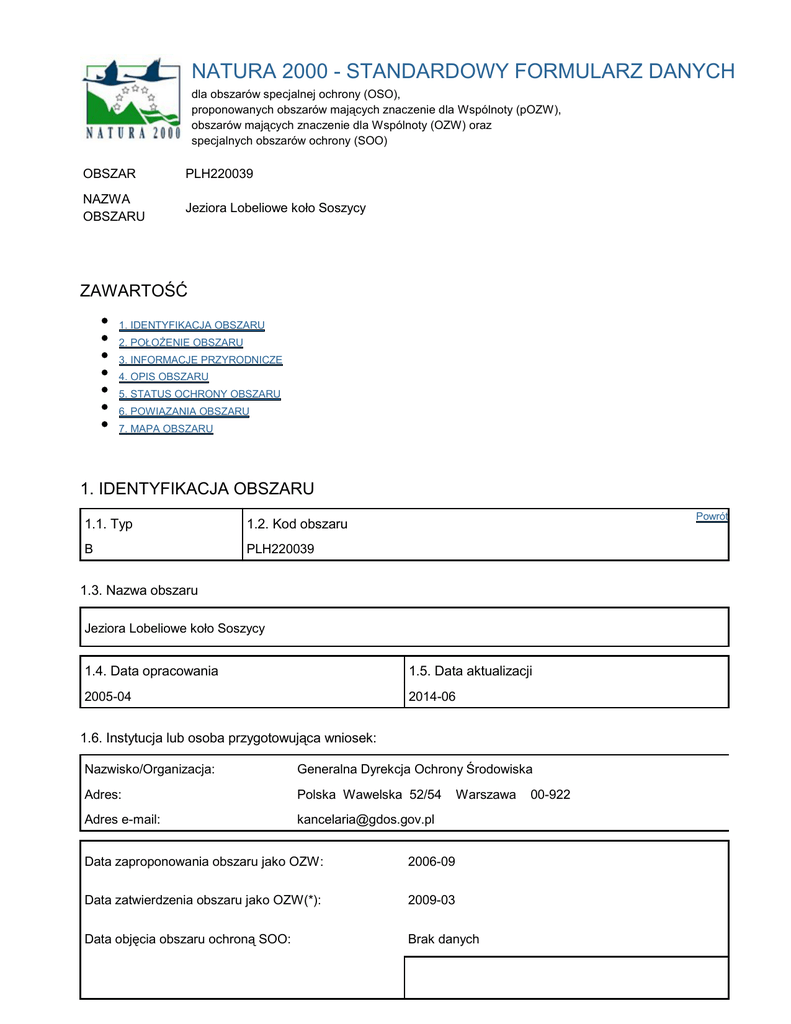 NATURA 2000 - STANDARDOWY FORMULARZ DANYCH dla obszarów specjalnej ochrony (OSO), proponowanych obszarów mających znaczenie dla Wspólnoty (pOZW), obszarów mających znaczenie dla Wspólnoty (OZW) oraz specjalnych obszarów ochrony (SOO) OBSZAR PLH220039 NAZWA OBSZARU Jeziora Lobeliowe koło Soszycy ZAWARTOŚĆ 1. IDENTYFIKACJA OBSZARU 2. POŁOŻENIE OBSZARU 3. INFORMACJE PRZYRODNICZE 4. OPIS OBSZARU 5. STATUS OCHRONY OBSZARU 6. POWIĄZANIA OBSZARU 7. MAPA OBSZARU 1. IDENTYFIKACJA OBSZARU 1.1. Typ 1.2. Kod obszaru B PLH220039 Powrót 1.3. Nazwa obszaru Jeziora Lobeliowe koło Soszycy 1.4. Data opracowania 1.5. Data aktualizacji 2005-04 2014-06 1.6. Instytucja lub osoba przygotowująca wniosek: Nazwisko/Organizacja: Generalna Dyrekcja Ochrony Środowiska Adres: Polska Wawelska 52/54 Adres e-mail: [email protected] Warszawa Data zaproponowania obszaru jako OZW: 2006-09 Data zatwierdzenia obszaru jako OZW(*): 2009-03 Data objęcia obszaru ochroną SOO: Brak danych 00-922 Krajowe odniesienie prawne dla formy ochrony SOO: Nie wydano rozporządzenia 2. POŁOŻENIE OBSZARU Powrót 2.1. Położenie centralnego punktu [wartości dziesiętne stopni]: Długość geograficzna Szerokość geograficzna nd nd 2.2. Powierzchnia [ha]: 2.3. Obszar morski [%] 132.71 0.0 2.5. Kod i nazwa regionu administracyjnego Kod poziomu NUTS 2 Nazwa regionu PL63 Pomorskie 2.6. Region biogeograficzny Kontynentalny(100.0 %) 3. INFORMACJE PRZYRODNICZE 3.1. Typy siedlisk przyrodniczych występujących na terenie obszaru i ocena znaczenia obszaru dla tych siedlisk: Typy siedlisk wymienione w załączniku I Kod PF NP Pokrycie [ha] Powrót Ocena obszaru Jaskinie Jakość A|B|C|D [liczba] danych A|B|C Reprezentatywność Powierzchnia względna Stan zachowania Ocena ogólna 3110 24.1 G A C A A 3160 2.61 G A C A A 7140 1.28 G B C A A 91D0 1.64 G B C B C PF: dla typów siedlisk, do których mogą odnosić się zarówno formy priorytetowe, jak i niepriorytetowe (6210, 7130, 9430) należy wpisać „x" w kolumnie PF celem wskazania formy priorytetowej. NP: jeśli dany typ siedliska nie istnieje już na danym terenie, należy wpisać „x" (opcjonalnie). Pokrycie: można wpisywać z dokładnością do wartości dziesiętnych. Jaskinie: w przypadku siedlisk typu 8310 i 8330 (jaskinie) należy podać liczbę jaskiń, jeśli nie są dostępne szacunkowe dane na temat powierzchni. Jakość danych: G = „wysoka" (np. na podstawie badań); M = „przeciętna" (np. na podstawie częściowych danych i ekstrapolacji); P = „niska" (np. zgrubne dane szacunkowe). 4. OPIS OBSZARU Powrót 4.1. Ogólna charakterystyka obszaru Klasa siedliska przyrodniczego Pokrycie [%] N17 99.63 N12 0.37 Ogółem pokrycia siedliska przyrodniczego 100 Dodatkowa charakterystyka obszaru: Obszar obejmuje grupę czterech jezior położonych na północ od miejscowości Soszyca, w krajobrazie borów sosnowych. Są to trzy jeziora lobeliowe - Modre, Obrowo Małe i Pomysko oraz jedno dystroficzne - jezioro Żabie. Do jezior przylegają niewielkie torfowiska przejściowe oraz małe płaty brzeziny bagiennej. Ostoja położona jest na głównym szlaku sandrowym Pradoliny Pomorskiej. Wśród utworów powierzchniowych obszaru dominują piaski różnoziarniste z wkładkami i przewarstwieniami żwirów. Pod względem hipsometrycznym obszar ostoi jest słabo urozmaicony, z wysokościami nieznacznie przekraczającymi 130 m n.p.m. Dominującym typem gleb są gleby bielicowe. Jeziora lobeliowe obszaru są niewielkie i bezprzepływowe. Są to miękkowodne, oligo-/mezotroficzne i dobrze zachowane zbiorniki. W każdym z jezior znaczną powierzchnię fitolitoralu m zajmują płaty zespołu Isoeto-lobelietum. Na obrzeżach jezior Modre i Pomysko wykształciły się fitocenozy przejściowo-torfowiskowe. W fitoplanktonie zbiorników dominują zielenice, natomiast w zooplanktonie - wrotki. Ichtiofauna jezior jest uboga, zanotowano w nich występowanie 6 gatunków ryb. Jezioro Żabie jest dobrze zachowanym zbiornikiem dystroficznym w stosunkowo wczesnym stadium rozwoju. Pod względem hydrochemicznym jest to jezioro miękkowodne i skrajnie ubogie w sole mineralne, o podwyższonej zawartości substancji humusowych w wodzie. Brzegi jeziora zajmują zbiorowiska przejściowo przejściowo-torfowiskowe, wykształcone w postaci pasa o zróżnicowanej szerokości, a w północnej części jeziora tworzące typowe pływające pło narastające na lustro w wody. Roślinność podwodną tworzy zbiorowisko podwodnych mszaków. W jeziorze licznie występuje także krasnorost trzęśl Batrachospermum sp. W fitoplanktonie dominują kryptofity. Torfowiska przejściowe w obszarze występują na obrzeżach jezior lobeliowych Modre i Pomysko oraz jeziora dystroficznego Żabie i stanowią wraz z nimi oraz niewielkimi płatami brzeziny bagiennej typowo wykształcone, niewielkie kompleksy jeziorno-torfowiskowe. Siedlisko wykształcone jest w postaci wąskiego pasa zbiorowisk przejściowo-torfowiskowych na cienkiej warstwie torfu wzdłuż brzegów jezior, szerszego pasa o charakterze pływającego pła lub też w postaci większych płatów roślinności torfowiskowej. Powierzchniowo dominuje zbiorowisko torfowca kończystego i wełnianki wąskolistnej, wąski pas zatorfień wokół jezior zajmują fitocenozy torfowca kończystego i turzycy nitkowatej oraz situ rozpierzchłego. Na torfowiskach w zatoce jeziora Pomysko oraz jeziora Modrego występują także niewielkie płaty mszaru przygiełkowego. Niewielkie obniżenia terenu będące przedłużeniem niecek jeziornych (nad jeziorami Pomysko oraz Obrowo Małe) zajmują dwa przyjeziorne płaty brzeziny bagiennej. Ponadto w obniżeniu terenu na wschód od jeziora Pomysko występuje płat sosnowego boru bagiennego. 4.2. Jakość i znaczenie Jeziora obszaru waz z przylegającymi do nimi niewielkimi płatami torfowisk przejściowych oraz brzezin bagiennych stanowią bardzo dobrze zachowane, modelowe kompleksy torfowiskowo-jeziorne na różnym etapie sukcesji, o 