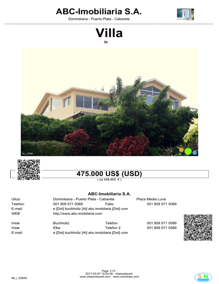 ABC-Imobiliaria S.A. Dominikana - Puerto Plata - Cabarete Villa 475.000 US$ (USD) ( ca 448.400 € ) ABC-Imobiliaria S.A. Ulica: Telefon: E-mail: WEB Dominikana - Puerto Plata - Cabarete 001 809 571 0089 Faks: e [Dot] buchholtz [At] abc-imobilaria [Dot] com http://www.abc-imobilaria.com Plaza Media Luna 001 809 571 0089 Imiæ Imiæ E-mail: Buchholtz Telefon Elke Telefon 2 e [Dot] buchholtz [At] abc-imobilaria [Dot] com 001 809 571 0089 001 809 571 0089 98_i_52849 Page 1/13 2017-03-07 10:24:38 - shipsnetwork www.shipsnetwork.com - www.comships.com ABC-Imobiliaria S.A. Dominikana - Puerto Plata - Cabarete Numer kodu Typ budynku Poùoýenie Materiaùy Property Address 98_i_52849 Villa Seafront Beton Cabrera Nr. VCABROASRE Numer kodu Nr referencyjny Status objektet Rok po uzgodnieniu potrzebne Powierzchnia dziaùki Firma Ýycie Kuchnia Sypialnie Zùy Opinie Toaleta 1500 m2 Powierzchnia 300 m2 2 1 4 4 Biznes Inne Usùugi Garaý Carport zadaszony taras 1 3 Dojazd: 40 Protokoùy 5 Protokoùy 3 Protokoùy 40 Protokoùy 5 Protokoùy 3 Protokoùy Samochód Samochód Samochód Samochód Samochód Samochód Lotnisko Plaýa Centrum Lotnisko Plaýa Centrum Akcesoria Dzierýawa Taras Balkon Jetty Pokój Party Klimatyzacja Resort Ogród Pralnia Goràcy zadaszony taras ogrodzony / murem 98_i_52849 Page 2/13 2017-03-07 10:24:38 - shipsnetwork www.shipsnetwork.com - www.comships.com ABC-Imobiliaria S.A. Dominikana - Puerto Plata - Cabarete 98_i_52849 Page 3/13 2017-03-07 10:24:38 - shipsnetwork www.shipsnetwork.com - www.comships.com ABC-Imobiliaria S.A. Dominikana - Puerto Plata - Cabarete 98_i_52849 Page 4/13 2017-03-07 10:24:38 - shipsnetwork www.shipsnetwork.com - www.comships.com ABC-Imobiliaria S.A. Dominikana - Puerto Plata - Cabarete 98_i_52849 Page 5/13 2017-03-07 10:24:38 - shipsnetwork www.shipsnetwork.com - www.comships.com ABC-Imobiliaria S.A. Dominikana - Puerto Plata - Cabarete 98_i_52849 Page 6/13 2017-03-07 10:24:38 - shipsnetwork www.shipsnetwork.com - www.comships.com ABC-Imobiliaria S.A. Dominikana - Puerto Plata - Cabarete 98_i_52849 Page 7/13 2017-03-07 10:24:38 - shipsnetwork www.shipsnetwork.com - www.comships.com ABC-Imobiliaria S.A. Dominikana - Puerto Plata - Cabarete 98_i_52849 Page 8/13 2017-03-07 10:24:38 - shipsnetwork www.shipsnetwork.com - www.comships.com ABC-Imobiliaria S.A. Dominikana - Puerto Plata - Cabarete 98_i_52849 Page 9/13 2017-03-07 10:24:38 - shipsnetwork www.shipsnetwork.com - www.comships.com ABC-Imobiliaria S.A. Dominikana - Puerto Plata - Cabarete 98_i_52849 Page 10/13 2017-03-07 10:24:38 - shipsnetwork www.shipsnetwork.com - www.comships.com ABC-Imobiliaria S.A. Dominikana - Puerto Plata - Cabarete 98_i_52849 Page 11/13 2017-03-07 10:24:38 - shipsnetwork www.shipsnetwork.com - www.comships.com ABC-Imobiliaria S.A. Dominikana - Puerto Plata - Cabarete 98_i_52849 Page 12/13 2017-03-07 10:24:38 - shipsnetwork www.shipsnetwork.com - www.comships.com ABC-Imobiliaria S.A. Dominikana - Puerto Plata - Cabarete 98_i_52849 Page 13/13 2017-03-07 10:24:38 - shipsnetwork www.shipsnetwork.com - www.comships.com