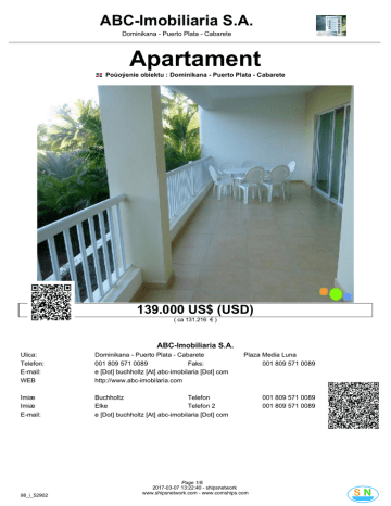 ABC-Imobiliaria S.A. Dominikana - Puerto Plata - Cabarete Apartament Poùoýenie obiektu : Dominikana - Puerto Plata - Cabarete 139.000 US$ (USD) ( ca 131.216 € ) ABC-Imobiliaria S.A. Ulica: Telefon: E-mail: WEB Dominikana - Puerto Plata - Cabarete 001 809 571 0089 Faks: e [Dot] buchholtz [At] abc-imobilaria [Dot] com http://www.abc-imobilaria.com Plaza Media Luna 001 809 571 0089 Imiæ Imiæ E-mail: Buchholtz Telefon Elke Telefon 2 e [Dot] buchholtz [At] abc-imobilaria [Dot] com 001 809 571 0089 001 809 571 0089 98_i_52902 Page 1/6 2017-03-07 13:22:40 - shipsnetwork www.shipsnetwork.com - www.comships.com ABC-Imobiliaria S.A. Dominikana - Puerto Plata - Cabarete Numer kodu Typ budynku Poùoýenie Materiaùy Property Address Powierzchnia dziaùki Firma Ýycie Kuchnia Sypialnie Zùy Opinie Toaleta Dojazd: 30 Protokoùy 1 Protokoùy 3 Protokoùy 98_i_52902 Apartament Seafront Beton Camino Real, Cabarete 1 1 2 2 Samochód Pieszo Samochód Numer kodu Nr referencyjny Status objektet Rok natychmiast Nowy 2007 Powierzchnia 164 m2 Biznes Inne Usùugi Garaý Carport zadaszony taras 1 1 Lotnisko Plaýa Centrum Akcesoria Dzierýawa Taras Balkon Jetty Pokój Party Klimatyzacja Resort Ogród Pralnia Goràcy zadaszony taras ogrodzony / murem 98_i_52902 Page 2/6 2017-03-07 13:22:40 - shipsnetwork www.shipsnetwork.com - www.comships.com ABC-Imobiliaria S.A. Dominikana - Puerto Plata - Cabarete 98_i_52902 Page 3/6 2017-03-07 13:22:40 - shipsnetwork www.shipsnetwork.com - www.comships.com ABC-Imobiliaria S.A. Dominikana - Puerto Plata - Cabarete 98_i_52902 Page 4/6 2017-03-07 13:22:40 - shipsnetwork www.shipsnetwork.com - www.comships.com ABC-Imobiliaria S.A. Dominikana - Puerto Plata - Cabarete 98_i_52902 Page 5/6 2017-03-07 13:22:40 - shipsnetwork www.shipsnetwork.com - www.comships.com ABC-Imobiliaria S.A. Dominikana - Puerto Plata - Cabarete 98_i_52902 Page 6/6 2017-03-07 13:22:40 - shipsnetwork www.shipsnetwork.com - www.comships.com