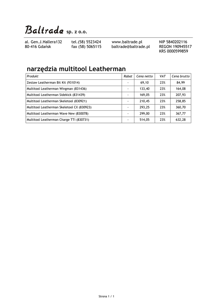 sp. z o.o. al. Gen.J.Hallera132 80-416 Gdańsk tel.(58) 5523424 fax (58) 5065115 www.baltrade.pl [email protected] NIP 5840202116 REGON 190945517 KRS 0000599859 narzędzia multitool Leatherman Produkt Rabat Cena netto VAT Cena brutto Zestaw Leatherman Bit Kit (931014) - 69,10 23% 84,99 Multitool Leatherman Wingman (831436) - 133,40 23% 164,08 Multitool Leatherman Sidekick (831439) - 169,05 23% 207,93 Multitool Leatherman Skeletool (830921) - 210,45 23% 258,85 Multitool Leatherman Skeletool CX (830923) - 293,25 23% 360,70 Multitool Leatherman Wave New (830078) - 299,00 23% 367,77 Multitool Leatherman Charge TTi (830731) - 514,05 23% 632,28 Strona 1 / 1