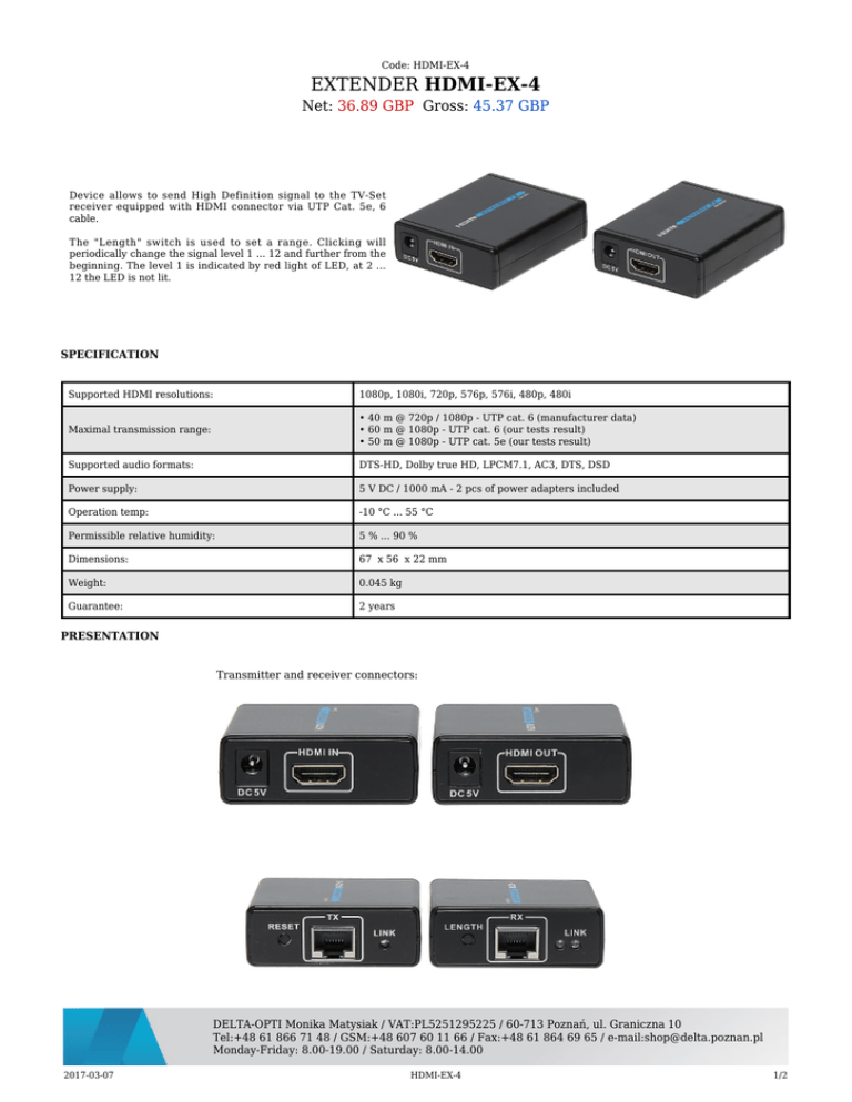 Code: HDMI-EX-4 EXTENDER HDMI-EX-4 Net: 36.89 GBP Gross: 45.37 GBP Device allows to send High Definition signal to the TV-Set receiver equipped with HDMI connector via UTP Cat. 5e, 6 cable. The "Length" switch is used to set a range. Clicking will periodically change the signal level 1 ... 12 and further from the beginning. The level 1 is indicated by red light of LED, at 2 ... 12 the LED is not lit. SPECIFICATION Supported HDMI resolutions: 1080p, 1080i, 720p, 576p, 576i, 480p, 480i Maximal transmission range: • 40 m @ 720p / 1080p - UTP cat. 6 (manufacturer data) • 60 m @ 1080p - UTP cat. 6 (our tests result) • 50 m @ 1080p - UTP cat. 5e (our tests result) Supported audio formats: DTS-HD, Dolby true HD, LPCM7.1, AC3, DTS, DSD Power supply: 5 V DC / 1000 mA - 2 pcs of power adapters included Operation temp: -10 °C ... 55 °C Permissible relative humidity: 5 % ... 90 % Dimensions: 67 x 56 x 22 mm Weight: 0.045 kg Guarantee: 2 years PRESENTATION Transmitter and receiver connectors: DELTA-OPTI Monika Matysiak / VAT:PL5251295225 / 60-713 Poznań, ul. Graniczna 10 Tel:+48 61 866 71 48 / GSM:+48 607 60 11 66 / Fax:+48 61 864 69 65 / e-mail:[email protected] Monday-Friday: 8.00-19.00 / Saturday: 8.00-14.00 2017-03-07 HDMI-EX-4 1/2 Transmission schematic diagram: 1) Device with HDMI output 2) HDMI cable 3) HDMI-EX-4 set 4) UTP cat. 6 5) Monitor with HDMI input In the kit: PACKAGE PARAMETERS Dimensions (L x W x H): 165x110x80 mm Gross Weight: 0.33 kg DELTA-OPTI Monika Matysiak / VAT:PL5251295225 / 60-713 Poznań, ul. Graniczna 10 Tel:+48 61 866 71 48 / GSM:+48 607 60 11 66 / Fax:+48 61 864 69 65 / e-mail:[email protected] Monday-Friday: 8.00-19.00 / Saturday: 8.00-14.00 2017-03-07 HDMI-EX-4 2/2