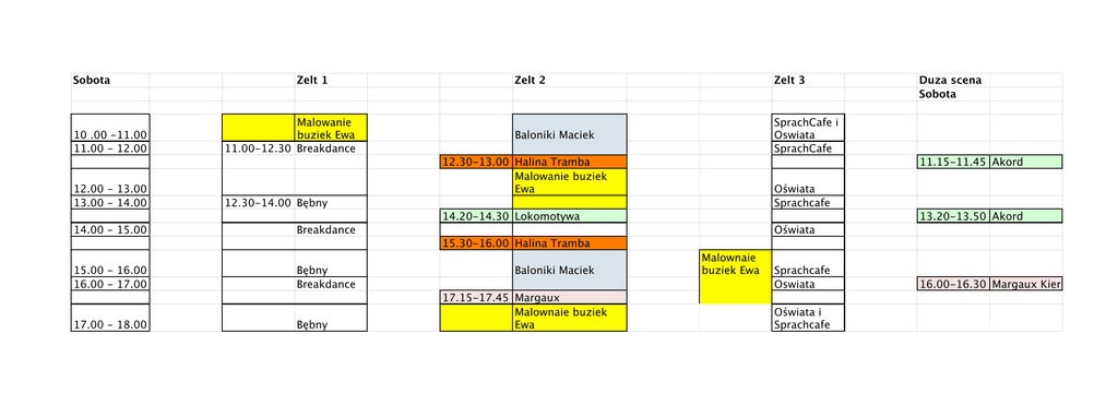 Sobota 10 .00 -11.00 11.00 - 12.00 12.00 - 13.00 13.00 - 14.00 Zelt 1 Malowanie buziek Ewa 11.00-12.30 Breakdance Zelt 2 Zelt 3 Baloniki Maciek SprachCafe i Oswiata SprachCafe 12.30-13.00 Halina Tramba Malowanie buziek Ewa 11.15-11.45 Akord Oświata Sprachcafe 12.30-14.00 Bębny 14.20-14.30 Lokomotywa 14.00 - 15.00 Duza scena Sobota 13.20-13.50 Akord Breakdance Oświata 15.30-16.00 Halina Tramba 15.00 - 16.00 16.00 - 17.00 17.00 - 18.00 Bębny Breakdance Bębny Baloniki Maciek 17.15-17.45 Margaux Malownaie buziek Ewa Malownaie buziek Ewa Sprachcafe Oswiata Oświata i Sprachcafe 16.00-16.30 Margaux Kier Zelt 2 Niedziela Godziny 10.00 - 11.00 11.00 - 12.00 Zelt 3 Duza Scena Zelt 1 10.15 - 10.35 Anna Nova 10.45-12.00 Breakdance Malowanie buziek Anna Jackiewicz Oświata i Sprachcafe SprachCafe 11.50-12.20 Akord Buzki 12.00 - 13.00 12.00-13.15 Bębny 12.30-13.00 Halina Tramba 13.00 - 14.00 13.20-13.40 Anna Nova 13.20-13.30 Lokomotywa Balonik Maciek Oświata 13.00-13.30 Margaux SprachCafe 14.30-15.00 Akord Buzki 14.00 - 15.00 13.50-15.00 Breakdance 14.30-15.00 Margaux Oświata 15.00 - 16.00 Bębny 15.30-16.00 Halina Tramba SprachCafe 16.00 - 17.00 Breakdance 16.30-16.50 Anna Nova 17.00 - 18.00 Bębny Oświata SprachCafe i Oswiata Buzki