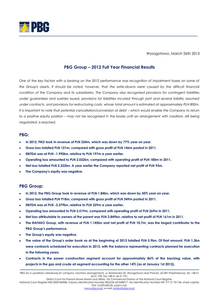 Wysogotowo, March 26th 2013 PBG Group – 2012 Full Year Financial Results One of the key factors with a bearing on the 2012 performance was recognition of impairment losses on some of the Group's assets. It should be noted, however, that the write-downs were caused by the difficult financial condition of the Company and its subsidiaries. The Company also recognised provisions for contingent liabilities under guarantees and sureties issued, provisions for liabilities incurred through joint and several liability assumed under contracts, and provisions for restructuring costs, whose total amount is estimated at approximately PLN 800m. It is important to note that potential cancellation/conversion of debt – which would enable the Company to return to a positive equity position – may not be recognised in the books until an arrangement with creditors, still being negotiated, is reached. PBG: In 2012, PBG took in revenue of PLN 224m, which was down by 77% year on year. Gross loss totalled PLN 121m, compared with gross profit of PLN 146m posted in 2011. EBITDA was at PLN -1.990bn, relative to PLN 197m a year earlier. Operating loss amounted to PLN 2.032bn, compared with operating profit of PLN 180m in 2011. Net loss totalled PLN 2.322bn. A year earlier the Company reported net profit of PLN 93m. The Company's equity was negative. PBG Group: In 2012, the PBG Group took in revenue of PLN 1.84bn, which was down by 50% year on year. Gross loss totalled PLN 918m, compared with gross profit of PLN 349m posted in 2011. EBITDA was at PLN -3.379bn, relative to PLN 329m a year earlier. Operating loss amounted to PLN 3.519m, compared with operating profit of PLN 269m in 2011. Net loss attributable to owners of the parent was PLN 2.849bn, relative to net profit of PLN 161m in 2011. The RAFAKO Group, with revenue of PLN 1.145bn and net profit of PLN 10.7m, was the largest contributor to the PBG Group’s performance. The Group's equity was negative. The value of the Group's order book as at the beginning of 2013 totalled PLN 5.9bn. Of that amount, PLN 1.3bn were contracts scheduled for execution in 2013, with the balance representing contracts planned for execution in the following years. Contracts in the power construction segment account for approximately 86% of the backlog value, with projects in the gas and crude oil segment accounting for the other 14% (as at January 1st 2013). PBG SA w upadłości układowej (in company voluntary arrangement), ul. Skórzewska 35, Wysogotowo near Poznań, 62-081 Przeźmierowo, tel. +48 61 66 51 700, fax +48 61 66 51 701, District Court for Poznań-Nowe Miasto and Wilda, VIII Commercial Division of the National Court Register. National Court Register KRS 0000184508, Industry Identification Number REGON 631048917, Tax Identification Number NIP 777 21 94 746, share capital: PLN 14,295,000.00, paid in full. www.pbg-sa.pl, e-mail: [email protected] The Group's total amounts due from customers for construction contract work as well as trade and other receivables were in excess of PLN 1.078bn as at the end of December 2012. Amounts due to customers for construction contract work as well as trade and other payables totalled PLN 976m. Summary of PBG's 2012 full year results PBG's income statement (PLN ‘000) Net revenue from sales of products, services, merchandise and materials 2012 2011 224,014 964,135 Cost of sales 344,710 817,801 Gross profit (loss) -120,696 146,334 Administrative expenses 113,271 31,015 Profit on sales -233,967 115,319 Other income 71,927 93,024 1,837,560 28,018 32,023 - -2,031,623 180,325 Other expenses Restructuring costs Operating profit (loss) Finance costs Profit (loss) before tax Income tax expense Net profit (loss) 308,452 63,355 -2,340,075 116,970 17,531 (24,079) -2,322,544 92,891 The Company's net loss as at the end of 2012 was PLN 2.323bn. Such a high loss was primarily due to revaluation of the Company's assets, as well as to gross loss of nearly PLN 121m. The 2012 results show a clear downward trend at all levels of the income statement. With revenue of PLN 224m, the Company's cost of sales reached nearly PLN 345m. Such low revenue relative to the historical sales volumes is connected with the Company’s current situation – PBG is in company voluntary arrangement. The Company's financial performance was also negatively affected by the execution of the following contracts: 1. Construction of the Malczyce Barrage - due to the fact that the contracting party (Maxer in bankruptcy by liquidation) did not extend the contract to cover the remaining scope of work, uninvoiced revenue estimated at the beginning of the year was revised in the course of 2012, from PLN 15.8m (as at January 1st 2012) to the amount of invoices issued, i.e. PLN 5.6m. Other estimated receivables on costs incurred were not recognised in the process of the final contract settlement or there is high risk that these receivables will not be enforced against the contracting party (which relate to PLN 3.3m). 2. “Construction of the Wierzchowice Underground Gas Storage Facility” – the Company recognised PLN 56.5m under contractual penalties for failing to meet the originally agreed deadline. 3. “Conversion of boiler OP230” – the Company recognised PLN 12m under contractual penalties for failing to meet the originally agreed deadline and the required technological parameters. 2 of 7 PBG SA w upadłości układowej (in company voluntary arrangement), ul. Skórzewska 35, Wysogotowo near Poznań, 62-081 Przeźmierowo, tel. +48 61 66 51 700, fax +48 61 66 51 701, District Court for Poznań-Nowe Miasto and Wilda, VIII Commercial Division of the National Court Register. National Court Register KRS 0000184508, Industry Identification Number REGON 631048917, Tax Identification Number NIP 777 21 94 746, share capital: PLN 14,295,000.00, paid in full. www.pbg-sa.pl, e-mail: [email protected] 4. “Construction of underground fuel tanks for NATO contract” – the financial re