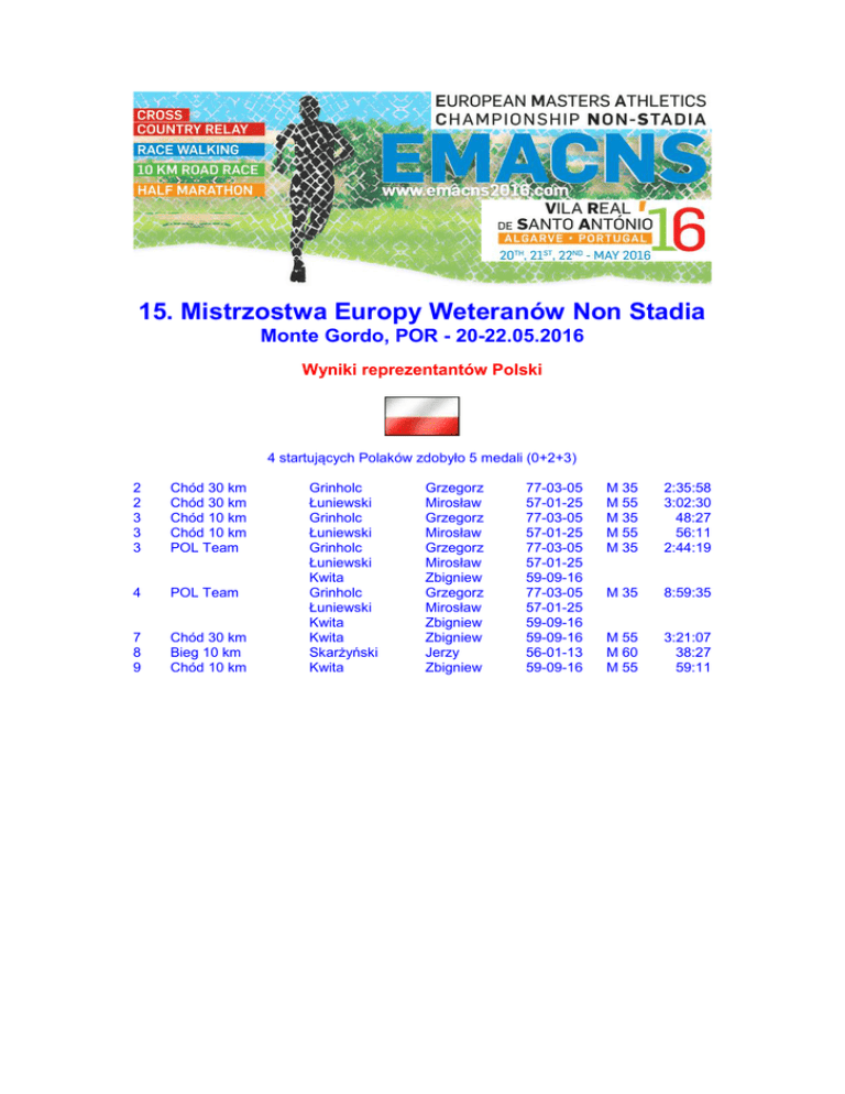 15. Mistrzostwa Europy Weteranów Non Stadia Monte Gordo, POR - 20-22.05.2016 Wyniki reprezentantów Polski 4 startujących Polaków zdobyło 5 medali (0+2+3) 2 2 3 3 3 Chód 30 km Chód 30 km Chód 10 km Chód 10 km POL Team 4 POL Team 7 8 9 Chód 30 km Bieg 10 km Chód 10 km Grinholc Łuniewski Grinholc Łuniewski Grinholc Łuniewski Kwita Grinholc Łuniewski Kwita Kwita Skarżyński Kwita Grzegorz Mirosław Grzegorz Mirosław Grzegorz Mirosław Zbigniew Grzegorz Mirosław Zbigniew Zbigniew Jerzy Zbigniew 77-03-05 57-01-25 77-03-05 57-01-25 77-03-05 57-01-25 59-09-16 77-03-05 57-01-25 59-09-16 59-09-16 56-01-13 59-09-16 M 35 M 55 M 35 M 55 M 35 2:35:58 3:02:30 48:27 56:11 2:44:19 M 35 8:59:35 M 55 M 60 M 55 3:21:07 38:27 59:11