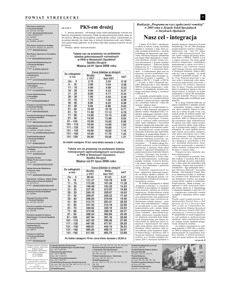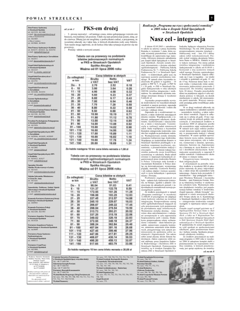 P O W I A T 7 S T R Z E L E C K I Dom Pomocy Spo³ecznej cd. ze str. 1 w Strzelcach Opolskie Realizacja Programu na rzecz spo³ecznoci romskiej PKS-em dro¿ej w 2005 roku w Zespole Szkó³ Specjalnych w Strzelcach Opolskich tel. 4612329, 4613480 e-mail: [email protected] - z fili¹ w Szymiszowie benzyny, trzymalimy ich poziom. Uda³o siê nam przetrzymaæ jesieñ, zimê, a¿ tel. 4623845 I - proszê zauwa¿yæ od tamtego czasu, mimo galopuj¹cego wzrostu cen do czerwca. D³u¿ej ju¿ nie moglimy z podwy¿kami czekaæ, a przypomnê, ¿e z fili¹ w Lenicy wczeniej zdarza³y siê i takie lata, w których dwukrotnie ros³y ceny biletów. tel. 4639840, 4639830 Tym razem mogê zapewniæ, ¿e do koñca roku taka sytuacja na pewno siê nie Dom Pomocy Spo³ecznej w Kad³ubie powtórzy. tel. 4636337, 4636422, fax 4636744 - Poni¿ej tabele z nowymi cenami. e-mail: [email protected] Nasz cel - integracja Z dniem 02.05.2005 r. zatrudniono w szkole na umowê o pracê Asystentkê Romsk¹ w wymiarze 1 etatu, która zosta³a wczeniej przeszkolona i uzyska³a kwalifikacje do zajmowania tego stano- Dom Pomocy Spo³ecznej w Zawadzkiem wiska. G³ównym miejscem zatrudnienia tel. 4622011 jest Zespó³ Szkó³ Specjalnych w Strzel- e-mail: [email protected] cach Opolskich. Zawarte zosta³o równie¿ porozumienie z dwiema szko³ami Zespó³ Szkó³ Ogólnokszta³c¹cych w Strzelcach Opolskich ogólnodostêpnymi Publiczn¹ Szko³¹ tel. 4612225 Podstawow¹ Nr 7 i Publiczn¹ Szko³¹ e-mail: [email protected] Podstawow¹ Nr 1 w Strzelcach Opolskich w rodowiskach, gdzie uczy siê Zespó³ Szkó³ Zawodowych nr 1 najwiêcej uczniów pochodzenia rom- w Strzelcach Op. skiego. W ramach etatu Asystentka re- tel. 4612701 alizowa³a 40 godzin w tygodniu 10 e-mail: [email protected] godzin w PSP Nr 7, 10 godz. w PSP Nr 1 i 20 godz. w ZSS w Strzelcach Op., Zespó³ Szkó³ Zawodowych gdzie funkcjonowa³a w roku szkolnym w Zawadzkiem 2005/06 wietlica integracyjna i week- tel. 4616288, 4616541 endowa. Na zatrudnienie asystenta rom- e-mail: [email protected] skiego otrzymano dotacjê w wysokoci 9.600,00 z³ Liceum Ogólnokszta³c¹ce Asystentka przeprowadzi³a wywia- w Zawadzkiem dy rodowiskowe we wszystkich domach tel. 4616430 romskich w naszym powiecie, zapozna³a e-mail: [email protected] siê z potrzebami rodowisk i rodzin dla rozwoju i edukacji dzieci. Powiatowe Centrum Pomocy Rodzinie w Strzelcach Opolskie Zapozna³a siê z oczekiwaniami rodziców, a tak¿e rodowisk nauczaj¹cych tel. 4613381, 4613901 e-mail: [email protected] dziecko romskie. Wspó³pracowa³a z rodzicami, pedagogami szkolnymi, dyrek- Poradnia Psychologiczno-Pedagogiczna torami, wychowawcami i nauczyciela- w Strzelcach Opolskich mi, a tak¿e z instytucjami. Uczestni- tel. 4613026 czy³a w realizacji zadañ statutowych e-mail: [email protected] szkó³. Sta³a wspó³praca z Asystentem Romskim zintegrowa³a rodowisko rom- Zespó³ Szkó³ Specjalnych przy DPS skie bez wzglêdu na pochodzenie rodzin- w Zawadzkiem ne. Wyeksponowane zosta³y elementy tel. 4620046, 4616049, 4620049 to¿samoci kulturowej tego rodowiska. e-mail: [email protected] Wspó³praca ze rodowiskiem Romów w Strzelcach Opolskich przebiega³a w at- Zespó³ Szkó³ Specjalnych w Strzelcach Opolskich mosferze wzajemnej ¿yczliwoci, zro- tel. 4612882 zumienia, z poszanowaniem tradycji i e-mail: [email protected] zwyczajów. Zespó³ Szkó³ Specjalnych przy DPS uczestnicz¹c w szkoleniu. Bra³a udzia³ W okresie wakacji Asy- stentka podnosi³a swoje kwalifikace w Kad³ubie równie¿ w imprezach kulturalnych or- tel. 4636422, 463637 ganizowanych przez rodowisko Romów e-mail: [email protected] w Polsce. Utrzymuje sta³y kontakt z Asystentami Romskimi w Polsce dzie- Specjalny Orodek l¹c siê dowiadczeniami, wymieniaj¹c Szkolno-Wycho-wawczy w Lenicy pogl¹dy, materia³y. Uczniowie Romscy tel. 4615261 i ich rodzice chêtnie i twórczo uczestni- e-mail: [email protected] czyli w ¿yciu kulturalnym i sportowym miasta i Powiatu. Szkolne Schronisko M³odzie¿owe Problemów w Górze w. Anny organizacyjnych nie by³o zadania by³y realizowane rytmicz- tel. 4615261 e-mail: [email protected] nie, na bie¿¹co, zgodnie z planem i do- Samodzielny Publiczny Zak³ad Opieki dywidualnych uwarunkowañ rozwoju po- stosowane do aktualnych potrzeb i inszczególnych uczniów. Zdrowotnej w Strzelcach Opolskich Ze rodków pozyskanych w ramach tel. 4613291-95 Programu romskiego w wysokoci e-mail: [email protected] 12.000,00 z³ przyst¹piono do adaptacji Komenda Powiatowa Pañstwowej Stra¿y starej kot³owni szkolnej na wietlicê Po¿arnej w Strzelcach Opolskich integracyjn¹. Przeprowadzono szereg tel. 4049903 robót ogólnobudowlanych maj¹cych na celu przystosowanie tych pomieszczeñ Komenda Powiatowa Policji w Strzelcach Opolskich tel. 4621200, 4621903 tel. 4614528 Wydawca: Starostwo Strzeleckie Redaktor Naczelny: Marta Górka Redaguje Zespó³. Druk: Drukarnia PRO MEDIA mieszczenia do spe³nienia celów sa- dowlanym. Zakres czêciowy robót zosta³ odebrany przez Inspektora Nadzor u Bu d o wl a n e g o i Dy r e k t o r a Z SS w Strzelcach Opolskich. Pomieszczenia wietlicy s¹ w trwa³ym Zarz¹dzie Dyrektora ZSS w Strzelcach Opolskich w 45-125 Opole, ul. Sk³adowa 4, tel. 077/4428008, fax 077/4428009 Redakcja zastrzega sobie prawo do skracania tekstów i adiustacji. Materia³ów nie zamówionych nie zwraca. Nie odpowiada za treæ zamieszczonych reklam i og³oszeñ. Tel. wew.: 727, 728, 730, 731, 732, 733, 734, 735 skania pomocy w lekcjach, na skutek nieobecnoci w szkole, lub niezrozumienia partii materia³u. Wszyscy nauczyciele posiadaj¹ pe³ne kwalifikacje pedagogiczne. W co drugi weekend odbywa³y siê zajêcia weekendowe z udzia³em uczniów uczestników wietlicy, a tak¿e rodziców dzieci romskich. Zajêcia te odbywa³y siê w sobotê od godz. 15-tej i najczêciej trwa³y do pónych godzin wieczornych. Z otrzymanych rodków w wysokoci 4000 z³ zakupiono posi³ki dla uczestników zajêæ weekendowych. W