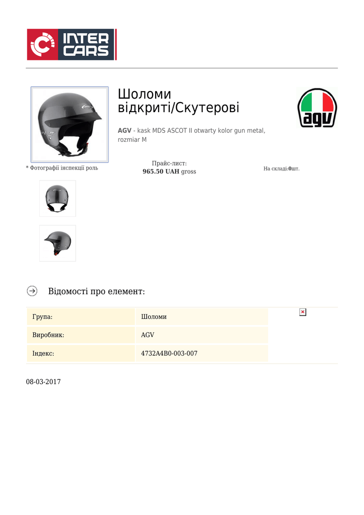 Шоломи відкриті/Скутерові AGV - kask MDS ASCOT II otwarty kolor gun metal, rozmiar M * Фотографії інспекції роль Прайс-лист: 965.50 UAH gross Відомості про елемент: Група: Шоломи Виробник: AGV Індекс: 4732A4B0-003-007 08-03-2017 На складі:0шт.