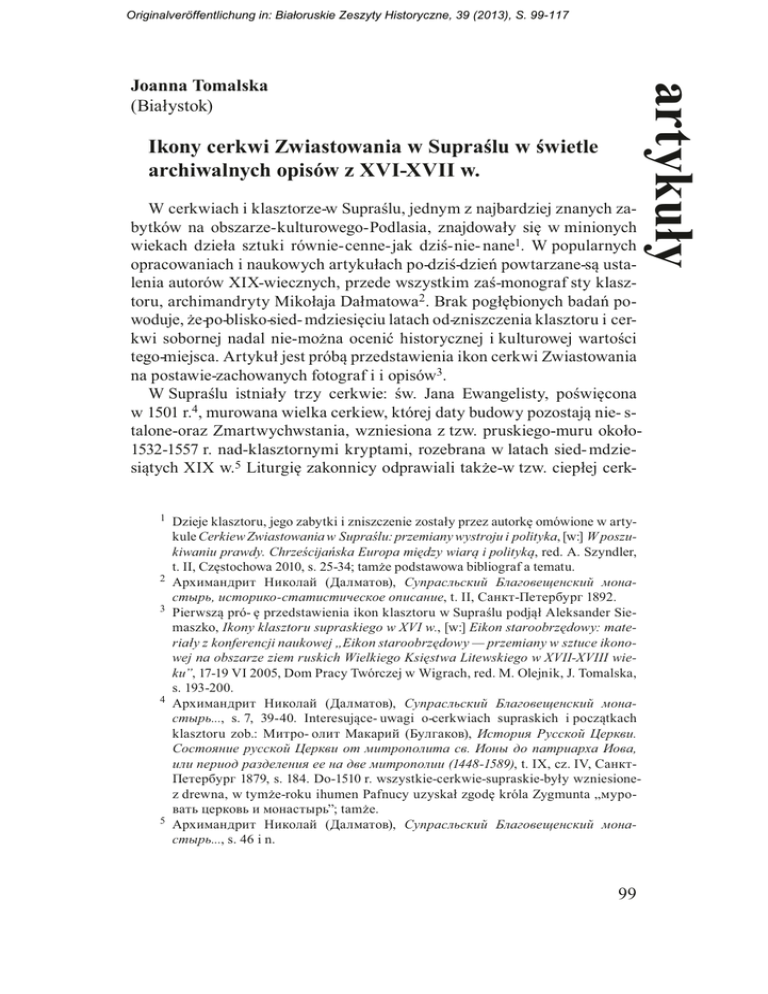 Originalveröffentlichung in: Białoruskie Zeszyty Historyczne, 39 (2013), S. 99-117 DUW\NXá\ -oDnnD7oPDlVND %LDá\VWoN ,NoQ\FHUNZL=ZLDsWoZDQLDZ6XpUDśOXZ śZLHWOH DrFKiZDln\FKoSiVyZ];9,;9,,Z : FeUNZLDFK L NODV]WoU]HZ 6XSUDśOX MedQ\P ] QDMEDUd]LeM ]QDQ\FK ]D E\WNóZ QD oEV]DU]HNXOWXroZeJR3odODVLD ]QDMdoZDá\ VLĊ Z PLQLoQ\FK ZLeNDFK d]LeáD V]WXNL UóZQLHFeQQHMDN d]LĞQLH QDQe : SoSXODUQ\FK oSUDFoZDQLDFK L QDXNoZ\FK DUW\NXáDFK SRd]LĞd]LeĔ SoZWDU]DQHVą XVWD OeQLD DXWoUóZ ;,;ZLeF]Q\FK SU]ede ZV]\VWNLP ]DĞPoQoJUDf VW\ NODV] WoUX DUFKLPDQdU\W\ 0LNoáDMD 'DáPDWoZD %UDN SoJáĊELoQ\FK EDdDĔ So ZodXMe ĪHSREOLVNRVLeG Pd]LeVLĊFLX ODWDFK oG]QLV]F]eQLD NODV]WoUX L FeU NZL soEoUQeM QDdDO QLHPoĪQD oFeQLü KLVWoU\F]QeM L NXOWXroZeM ZDUWośFL WeJRPLeMVFD $UW\NXá MeVW SróEą SU]edVWDZLeQLD LNoQ FeUNZL =ZLDVWoZDQLD QD SoVWDZLH]DFKoZDQ\FK foWoJUDf L L oSLVóZ : 6XSUDśOX LVWQLDá\ WU]\ FeUNZLe śZ -DQD (ZDQJeOLVW\ SośZLĊFoQD Z U PXroZDQD ZLeOND FeUNLeZ NWóUeM dDW\ EXdoZ\ So]oVWDMą QLH V WDOoQHoUD] =PDUWZ\FKZVWDQLD Z]QLeVLoQD ] W]Z SUXVNLeJRPXUX oNoáR U QDGNODV]WoUQ\PL NU\SWDPL ro]eEUDQD Z ODWDFK VLeG Pd]Le VLąW\FK ;,; Z /LWXUJLĊ ]DNoQQLF\ odSUDZLDOL WDNĪHZ W]Z FLeSáeM FeUN ']LeMe NODV]WoUX MeJo ]DE\WNL L ]QLV]F]eQLe ]oVWDá\ SU]e] DXWoUNĊ oPóZLoQe Z DUW\ NuOH &HrNLHZ=ZLDsWoZDQLDZ6XprDśOXpr]HPLDQ\Z\sWroMXLpoOLW\ND >Z@ :pos]X NLZDQLXprDZG\&Kr]HśFLMDńsND(XropDPLęG]\ZLDrąLpoOLW\Ną UHG $ 6]\nGOHU W ,, &]ĊVWoFKoZD V WDPĪe SodVWDZoZD ELEOLoJUDf D WePDWX Ⱥрɯиɦɚндриɬ +иɤоɥɚɣ ȾɚɥɦDɬоɜ ɋɭпɪɚсɥьсɤɢɣ Ȼɥɚɝоɜеɳенсɤɢɣ ɦонɚ сɬɵɪьɢсɬоɪɢɤосɬɚɬɢсɬɢɱесɤоеопɢсɚнɢе W ,, ɋɚнɤɬɉеɬерɛɭрɝ 3LeUZV]ą SUy Ċ SU]edVWDZLeQLD LNoQ NODV]WoUX Z 6XSUDśOX SodMąá $OeNVDQdeU 6Le PDV]No ,NoQ\NODs]WorXsXprDsNLHJoZ;9,Z >Z@ (LNoQsWDroobr]ęGoZ\PDWH rLDá\]NoQIHrHQFMLQDXNoZHMÄ(LNoQsWDroobr]ęGoZ\²pr]HPLDQ\Z s]WXFHLNoQo ZHMQDobs]Dr]H]LHPrXsNLFK:LHONLHJo.sLęsWZD/LWHZsNLHJoZ;9,,;9,,,ZLH NX´ 9, 'oP 3UDF\ 7ZóUF]eM Z :LJUDFK Ued 0 2OeMQLN - 7oPDOVND V Ⱥрɯиɦɚндриɬ +иɤоɥɚɣ ȾɚɥɦDɬоɜ ɋɭпɪɚсɥьсɤɢɣ Ȼɥɚɝоɜеɳенсɤɢɣ ɦонɚ сɬɵɪь V ,QWeUeVXMąFH XZDJL RFeUNZLDFK VXSUDVNLFK L SoF]ąWNDFK NODV]WoUX ]oE Ɇиɬрɨ оɥиɬ Ɇɚɤɚриɣ Ȼɭɥɝɚɤоɜ ɂсɬоɪɢɹ Ɋɭссɤоɣ ɐеɪɤɜɢ ɋосɬоɹнɢе ɪɭссɤоɣ ɐеɪɤɜɢ оɬ ɦɢɬɪопоɥɢɬɚ сɜ ɂонɵ ɞо пɚɬɪɢɚɪɯɚ ɂоɜɚ ɢɥɢпеɪɢоɞɪɚзɞеɥенɢɹеенɚɞɜеɦɢɬɪопоɥɢɢ W ,; F] ,9 ɋɚнɤɬ ɉеɬерɛɭрɝ V 'R U ZV]\VWNLHFeUNZLHVXSUDVNLHE\á\ Z]QLeVLoQH ] dUeZQD Z W\PĪHUoNX LKXPeQ 3DfQXF\ X]\VNDá ]JodĊ NUóOD =\JPXQWD Äɦɭро ɜɚɬɶ ɰерɤоɜɶ и ɦонɚɫɬɵрɶ´ WDPĪe Ⱥрɯиɦɚндриɬ +иɤоɥɚɣ ȾɚɥɦDɬоɜ ɋɭпɪɚсɥьсɤɢɣ Ȼɥɚɝоɜеɳенсɤɢɣ ɦонɚ сɬɵɪь V L Q ZL NDSOLF\ RNWóUeM ZVSoPLQD NoQWUDNW ] ZLOeĔVNLP PXODU]eP 0LNoáDMeP .oV]NLQeP -DN ZLeOHLNoQ ]QDOD]áRVLĊ Z W\FK śZLąW\QLDFK" 6NąGdoWDU á\" &]\ SoZVWDá\ QD PLeMVFX" -DNL OoV VWDá VLĊ LFK Xd]LDáeP" :\SoVDĪeQLHFeUNZL MeVW d]LĞ]QDQH] oSLVóZ Z LQZeQWDU]DFK oUD] DU FKLZDOQ\FK foWoJUDf L ]DFKoZDQ\FK Z ]ELoUDFK ,QVW\WXWX 6]WXNL 3$1 L %LEOLoWeFH8QLZeUV\WeFNLeM Z :LOQLe 1DMZDĪQLeMV]\PL WeNVWDPL ĨUód áoZ\PL dOD WeJRWePDWX Vą 2pLsr]HF]\NODs]WorX sXprDsNLHJo F]\OL W]Z 5HMHsWr]\N DUFKLPDQdU\W\ .LPEDUD ] U dOD SóĨQLeMV]\FK ]DĞF]DVóZ LQZeQWDU]HFeUNZL ] L U 1D SodVWDZLHW\FK do NXPeQWóZ VSróEXMeP\ oSLVDü LNoQ\ VXSUDVNLeJRNODV]WoUX Z SLeUZV]\P oNUeVLHMeJo fXQNFMoQoZDQLD $XWoUeP QDMVWDUV]eJo oSLVX VXSUDVNLFK FeUNZL E\á 6eUJLXV] .LPEDU SLeUZ V]\ DUFKLPDQdU\WD NODV]WoUX Z 6XSUDśOX So 6SoU]ąd]oQ\ SU]e]eĔ UeMeVWU MeVW SU]ede ZV]\VWNLP Uo]OLF]eQLeP NoV]WóZ UóĪQ\FK SUDF Z\NoQDQ\FK Z śZLąW\QLDFK Z oNUeVLe MeJo ZáDdDQLD 7U]eED SodNUeśOLü Īe Z ]eVWDZLeQLX Z\dDWNóZ DXWoU SUeF\]\MQLe Z\OLF]\á SUDFe Z\NoQDQe Z W\P F]DVLe SodDMąF SU]\ W\P NoV]W PDWeULDáóZ L UoEoFL]Q\ =QDF]QLe PQLeM doNáDdQLe DUFKLPDQd U\WD oNUeśOLá LNoQ\ oUD] LFK PLeMVFe Z FeUNZLDFK VXSUDVNLFK $pɯHoɝpDɮɢɱHFɤɢɣFɛopнɢɤɞoɤ\ɦHнɬоɜoɬноFɹɳɢɯFɹɤɢFɬоpɢɢ&HɜHpoɁD пDɞноɣ3\Fɢ dDOeM ȺɋȾ W ,; %иɥьнD V ,QVW\WXW 6]WXNL 3$1 :DUV]DZD =ELoU\ )oWoJUDf L L 5\VXQNóZ 3oPLDUoZ\FK QU LQZ %LEOLoWeND 8QLZeUV\WeFND :LOQo QU LQZ ) )oWoJUDf e Z\NoQDQH Z U ]oVWDá\ SU]edVWDZLoQHQD Z\VWDZLHÄ=DJLQLoQHVNDUE\ =DE\WNL NODV]Wo UX L FeUNZL Z 6XSUDśOX Z foWoJUDf L DUFKLZDOQeM´ oWZDUWeM ZU]eśQLD U Z VD ODFK 0X]eXP 3odODVNLH RZ %LDá\PVWoNX ZJ VFeQDULXV]D -oDQQ\ 7oPDOVNLeM Ɉпɢсьɜеɳɚɦɢɭɬɜоɪɚɦсɭпɪɚсɥьсɤоɣɰеɪɤɜɢсосɬɚɜɥеннɚɹнɚсɬоɹɬеɥеɦсе ɝоɦонɚсɬɵɪɹɚɪɯɢɦɚнɞɪɢɬоɦɋеɪɝееɦɄɢɦɛɚɪоɦɜɝ >Z@ ȼесɬнɢɤɁɚ пɚɞноɣɊоссɢɢɂсɬоɪɢɤоɥɢɬеɪɚɬɭɪнɵɣɠɭɪнɚɥ 5 9 W ,,, >@ NV 9,,, %иɥьнD V Sy QLeM SU]edUXNoZDQ\ Z ȺɋȾ W ,; V /oV\ oU\ JLQDOQH RdoNXPeQWX QLHVą ]QDQe : DUW\NXOHodZoáXMeP\ VLĊ dRWeNVWX dUXNoZD QH RZ ;,; Z ,QZHQWDr] FHrNZLH \PoQDsW\rD 6XprDsOsNLHJo ZLHOHbQHPX M P o $OH[HPX 'X boZLF]oZLDrFKLPDQGr\FLH65P$XJXsWDGLHpr]H]o\FoZPoQDsW\ rD6XprDsOsNLHJospLsDQ\L poGDQ\dDOeM ,QZHQWDr]'XboZLF]D >Z@ ȺɋȾ W ,; V ,QZHQWDr]FHrNZLHPoQDsW\rD6XprDsOsNLHJo]DLDśQLHZLHOPożQHJoLPFLNsLęG]D *Dbr\HOD.oOHQG\DrFKLHpLsFopD3oáoFNLHJo:LWHbsNLHJo0śFLsáDZsNLHJoPHWro poOLW\Zs]\sWNLH\5XsLDrFKLPDQGr\W\6XprDśO%HrH]ZHFNLHJoHWF3LsDQ\Z roNX oFWobr\s dDOeM ,QZHQWDr].oOHQG\ WDPĪe V Ⱥрɯиɦɚндриɬ +иɤоɥɚɣ ȾɚɥɦDɬоɜ ɋɭпɪɚсɥьсɤɢɣ Ȼɥɚɝоɜеɳенсɤɢɣ ɦонɚ сɬɵɪь V ,VWQLeMą dZD H ]ePSODU]H ,QZHQWDr]D MedeQ MeVW SU]eFKoZ\ZDQ\ Z $UFKLZXP :\ĪV]H R6ePLQDULXP 'XFKoZQH RZ %LDá\PVWoNX Ee] QXPeUX LQZeQWDU]D dUX JL Z :LOQLH² ,QZHQWDr]sXprDsNLHJoNODs]WorX /LWeZVNLH3DĔVWZoZH$UFKLZXP +LVWoU\F]QHZ :LOQLe QU LQZ ) oS 5eMeVWU 6eUJLXV]D .LPEDUD Uo]SoF]\QD NUóWNL ZVWĊS SRNWóU\P DUFKL PDQdU\WD ]DZDUá ZLDdo