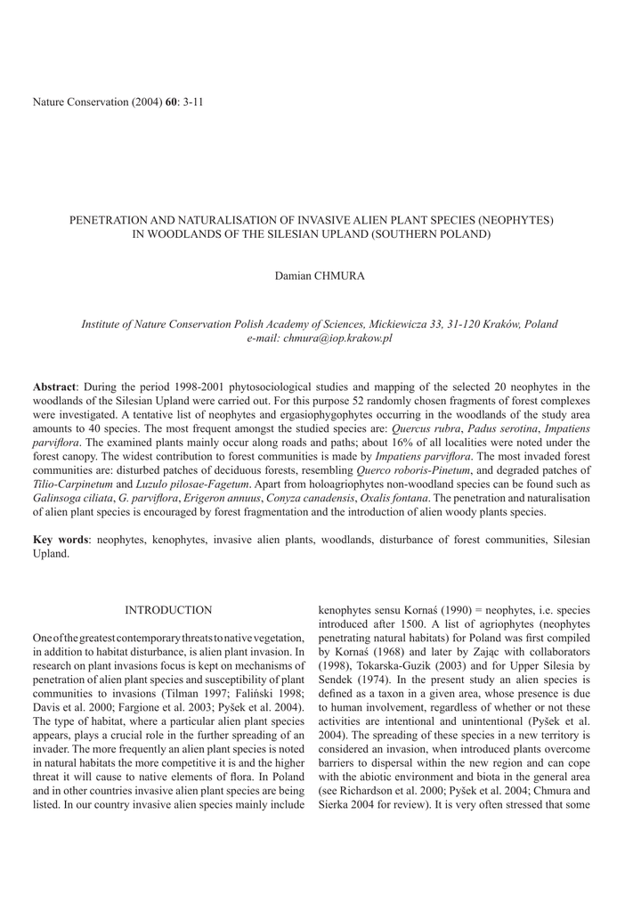Nature Conservation (2004) 60: 3-11 PENETRATION AND NATURALISATION OF INVASIVE ALIEN PLANT SPECIES (NEOPHYTES) IN WOODLANDS OF THE SILESIAN UPLAND (SOUTHERN POLAND) Damian CHMURA Institute of Nature Conservation Polish Academy of Sciences, Mickiewicza 33, 31-120 Kraków, Poland e-mail: [email protected] Abstract: During the period 1998-2001 phytosociological studies and mapping of the selected 20 neophytes in the woodlands of the Silesian Upland were carried out. For this purpose 52 randomly chosen fragments of forest complexes were investigated. A tentative list of neophytes and ergasiophygophytes occurring in the woodlands of the study area amounts to 40 species. The most frequent amongst the studied species are: Quercus rubra, Padus serotina, Impatiens parviflora. The examined plants mainly occur along roads and paths; about 16% of all localities were noted under the forest canopy. The widest contribution to forest communities is made by Impatiens parviflora. The most invaded forest communities are: disturbed patches of deciduous forests, resembling Querco roboris-Pinetum, and degraded patches of Tilio-Carpinetum and Luzulo pilosae-Fagetum. Apart from holoagriophytes non-woodland species can be found such as Galinsoga ciliata, G. parviflora, Erigeron annuus, Conyza canadensis, Oxalis fontana. The penetration and naturalisation of alien plant species is encouraged by forest fragmentation and the introduction of alien woody plants species. Key words: neophytes, kenophytes, invasive alien plants, woodlands, disturbance of forest communities, Silesian Upland. INTRODUCTION One of the greatest contemporary threats to native vegetation, in addition to habitat disturbance, is alien plant invasion. In research on plant invasions focus is kept on mechanisms of penetration of alien plant species and susceptibility of plant communities to invasions (Tilman 1997; Faliński 1998; Davis et al. 2000; Fargione et al. 2003; Pyšek et al. 2004). The type of habitat, where a particular alien plant species appears, plays a crucial role in the further spreading of an invader. The more frequently an alien plant species is noted in natural habitats the more competitive it is and the higher threat it will cause to native elements of flora. In Poland and in other countries invasive alien plant species are being listed. In our country invasive alien species mainly include kenophytes sensu Kornaś (1990) = neophytes, i.e. species introduced after 1500. A list of agriophytes (neophytes penetrating natural habitats) for Poland was first compiled by Kornaś (1968) and later by Zając with collaborators (1998), Tokarska-Guzik (2003) and for Upper Silesia by Sendek (1974). In the present study an alien species is defined as a taxon in a given area, whose presence is due to human involvement, regardless of whether or not these activities are intentional and unintentional (Pyšek et al. 2004). The spreading of these species in a new territory is considered an invasion, when introduced plants overcome barriers to dispersal within the new region and can cope with the abiotic environment and biota in the general area (see Richardson et al. 2000; Pyšek et al. 2004; Chmura and Sierka 2004 for review). It is very often stressed that some 4 Damian CHMURA alien plant species that are not classified as “invasive”, yet may become invasive in the future (Kowarik 1995; Pyšek 2001; Pyšek et al. 2004). The aim of this study was to establish a tentative list of neophytes occurring in forests and to analyse their participation in various types of habitats in the woodland areas of the Silesian Upland situated in southern Poland. STUDY AREA The study area lies in southern Poland, mainly on the territory of Silesian province. The north-western fragment of the upland is situated in the Opole province and the south-eastern part is located in the Małopolska province. The Silesian Upland covers ca 3 990 km2 . The natural environment of this area has been transformed by man for several hundred years. This process has intensified in the last two centuries due to increasing urbanisation and industrialisation. Rich mineral resources, especially coal, contributed to the development of the mining and metallurgical industry, towns and a dense network of roads and railways. On the territory of the Silesian Upland natural forests had dominated in landscape until the end of the 18th century. As the result of forest management and logging for agriculture and urbanisation purposes, the total cover and number of large forest complexes have decreased while the number of isolated, small forests increased. Contemporary woodlands, only to very small extent, are remnants of the former Silesian Primeval Forest; they are primarily planted pine forests (Sendek 1974). In this area Cabała (1990) distinguished 17 plant associations and 26 units of lower rank – subassociations. The most frequent and occupying large areas are: Leucobryo-Pinetum, Molinio-Pinetum, Calamagrostio villosae-Pinetum, Querco roboris-Pinetum and Calamagrostio-Quercetum petraeae. METHODS The objects of the studies conducted during 1998-2001 were plant species of alien origin, neophytes (kenophytes) according to the classification by Kornaś (1990), occurring in the woodland areas of the Silesian Upland. Their list was made on the basis of literature data (Kornaś 1968; Hereźniak 1992; Zając et al. 1998; Celiński et al. 1991; Nowak 1999; Urbisz 1996, 2001), herbarium materials (KTU) and own field data. Based on the literature, 20 permanently established neophytes, meeting the criteria requirements of invasive species, were chosen for detailed studies. Fifty two fragments of large forest complexes were investigated. Each of these encompassed at least ten forest sections. In them, the following types of habitats were distinguished on the basis of their natural, semi-natural or anthropogenic character and shape: 1. Forest habitats: natural and semi-natural dense patches of forest veg