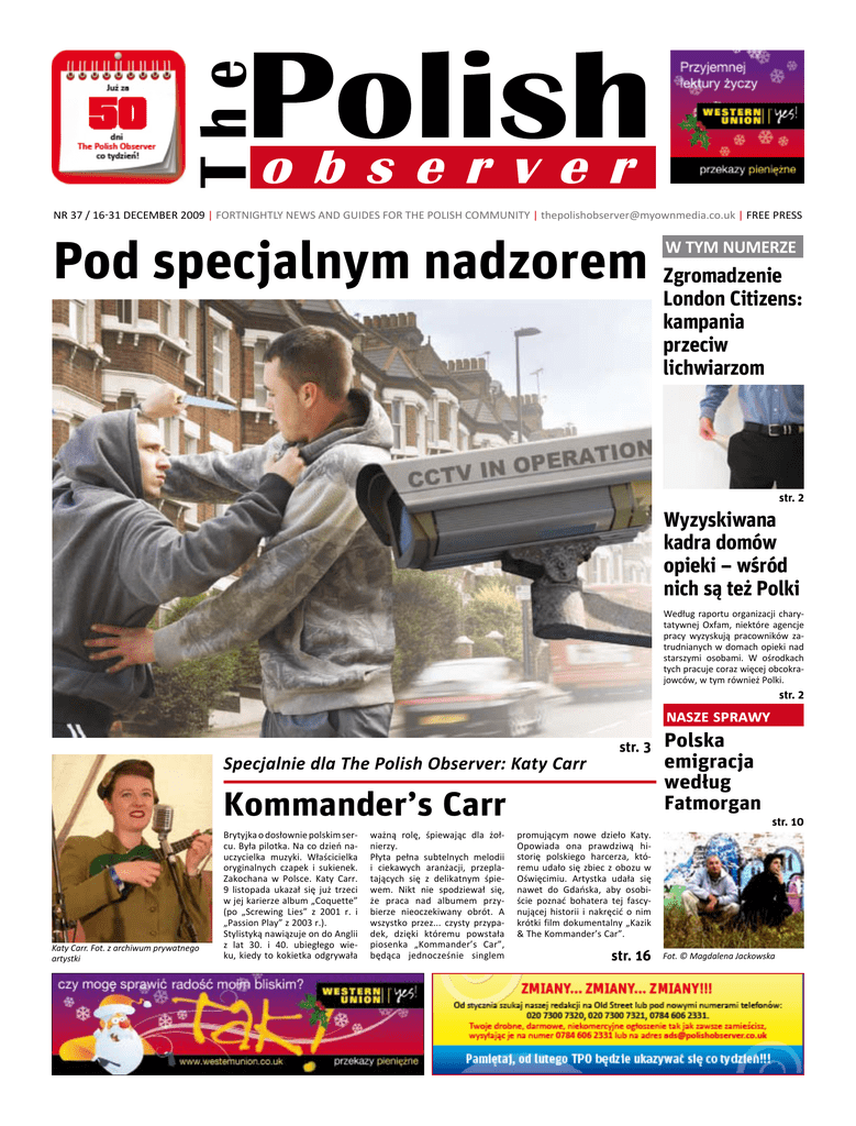 Nr 37 / 16-31 DECEMBER 2009 | Fortnightly News and Guides for the Polish Community | [email protected] | free press Pod specjalnym nadzorem W TYM NUMERZE Zgromadzenie London Citizens: kampania przeciw lichwiarzom str. 2 Wyzyskiwana kadra domów opieki – wśród nich są też Polki Według raportu organizacji charytatywnej Oxfam, niektóre agencje pracy wyzyskują pracowników zatrudnianych w domach opieki nad starszymi osobami. W ośrodkach tych pracuje coraz więcej obcokrajowców, w tym również Polki. str. 2 nasze sprawy Specjalnie dla The Polish Observer: Katy Carr str. 3 Kommander’s Carr Katy Carr. Fot. z archiwum prywatnego artystki Brytyjka o dosłownie polskim sercu. Była pilotka. Na co dzień nauczycielka muzyki. Właścicielka oryginalnych czapek i sukienek. Zakochana w Polsce. Katy Carr. 9 listopada ukazał się już trzeci w jej karierze album „Coquette” (po „Screwing Lies” z 2001 r. i „Passion Play” z 2003 r.). Stylistyką nawiązuje on do Anglii z lat 30. i 40. ubiegłego wieku, kiedy to kokietka odgrywała ważną rolę, śpiewając dla żołnierzy. Płyta pełna subtelnych melodii i ciekawych aranżacji, przeplatających się z delikatnym śpiewem. Nikt nie spodziewał się, że praca nad albumem przybierze nieoczekiwany obrót. A wszystko przez... czysty przypadek, dzięki któremu powstała piosenka „Kommander’s Car”, będąca jednocześnie singlem Polska emigracja według Fatmorgan str. 10 promującym nowe dzieło Katy. Opowiada ona prawdziwą historię polskiego harcerza, któremu udało się zbiec z obozu w Oświęcimiu. Artystka udała się nawet do Gdańska, aby osobiście poznać bohatera tej fascynującej historii i nakręcić o nim krótki film dokumentalny „Kazik & The Kommander’s Car”. str. 16 Fot. © Magdalena Jackowska 2 Nr 37 / 16-31 December 2009 Wiadomości Szkocja niepodległa? Mniejszościowy rząd szkockich nacjonalistów ze Scottish National Party – SNP (Szkocka Partia Narodowa) opublikował 30 listopada dokument konsultacyjny, tzw. białą księgę, na temat przyszłego statusu Szkocji. Może to utorować drogę do referendum w sprawie niepodległości. Nie opublikowano jednak pytania, nad którym Szkoci mogliby głosować. Szkockie władze liczą na to, że referendum zostałoby rozpisane w terminie 12 miesięcy od przyjęcia stosownej ustawy. Potem byłyby cztery opcje przyszłego statusu nowego państwa: zachowanie status quo, niewielkie modyfikacje obecnego systemu, głęboka decentralizacja przyznająca Szkocji samodzielność we wszystkich dziedzinach z wyjątkiem polityki zagranicznej i obronności oraz suwerenność. Rząd szkocki uważa, iż pełna suwerenność byłaby dla Szkocji korzystna, ponieważ umożliwiłaby jej realizację potencjału. Rząd szkockich nacjonalistów nie ma wystarczającego poparcia, by przeforsować projekt ustawy o referendum ws. niepodległości. Ideę takiego referendum oprócz szkockich nacjonalistów popierają tylko Zieloni, którzy mają dwóch posłów głosujących zwykle z SNP. M. R. Zgromadzenie London Citizens: kampania przeciw lichwiarzom 25 listopada w Barbican Centre odbyło się spotkanie organizacji London Citizens z politykami i bankierami, którzy odpowiadali na apel mieszkańców Londynu, dotyczący położenia kresu legalnej działalności „rekinów pożyczkowych”. W spotkaniu uczestniczyli przedstawiciele trzech głównych brytyjskich partii politycznych, British Bankers Association (stowarzyszenie brytyjskich bankierów), najwięksi pracodawcy oraz burmistrz Londynu – Boris Johnson. Greg Hands, minister skarbu gabinetu cieni z ramienia partii konserwatywnej obiecał, że zostanie nałożony limit na odsetki maksymalne, nakładane na użytkowników kart kredytowych określonej sieci sklepów (z ang. store cards) i że zostanie rozważona możliwość ograniczenia udzielania pożyczek na inne produkty finansowe, grożące skandalicznie wysokimi odsetkami. Był to początek kampanii na rzecz wprowadzenia pierwszego prawa anty-lichwiarskiego w Wielkiej Brytanii. W przeciwieństwie do większych krajów europejskich, na Wyspach nie istnieją żadne prawne ograniczenia wysokości maksymalnych odsetek, jakie kredytodawca może nałożyć. Nowa kampania pod nazwą „Taking responsibility in the economic crisis” (Wzięcie odpowiedzialności za kryzys ekonomiczny) jest wynikiem wielomiesięcznych spotkań w siedzibach organizacji należących do London Citizens, podczas których zbierano dowody na to, jaki wpływ na rodziny mają wysoko oprocentowane kredyty. Przewodniczący London Citizens, Dr Luke Bretherton, powiedział, że kampania dotycząca „odbudowy poczucia odpowiedzialności” miała na celu „wyrównanie sił między społeczeństwem, a kapitałem”. Poza zwiększeniem londyńskiej minimalnej stawki wynagrodzenia (London living wage), w kampanii domaga się wprowadzenia 20-procentowego maksymalnego limitu odsetek za kredyt, stworzenia ustawowego kodeksu dla kredytodawców, inwestycji 1 proc. z miliarda funtów, za które państwo wykupiło banki, finansowanie pożyczania wzajemnego, takiego jak spółdzielcze kasy oszczędnościowo-pożyczkowe (credit unions), oraz wprowadzenie programu nauczania o pożyczkach do szkół. M. R. Wyzyskiwana kadra domów opieki – wśród nich są też Polki Według raportu organizacji charytatywnej Oxfam, niektóre agencje pracy wyzyskują pracowników zatrudnianych w domach opieki nad starszymi osobami. W ośrodkach tych pracuje coraz więcej obcokrajowców, w tym również Polki. W yniki raportu podała PAP, powołując się na publikacje dziennika The Guardian. „Jeśli się pochodzi z innego kraju, to nie ma się zbytniej wiary w siebie. Obcokrajowcem, który nie zna biegle języka, łatwiej jest manipulować” – raport cytuje Polkę o imieniu Gosia. Według niej, imigranci pracują ciężej niż miejscowi pracownicy, ponieważ nie mają śmiałości odmówić pracodawcy i nie znają swoich praw. Przytocz
