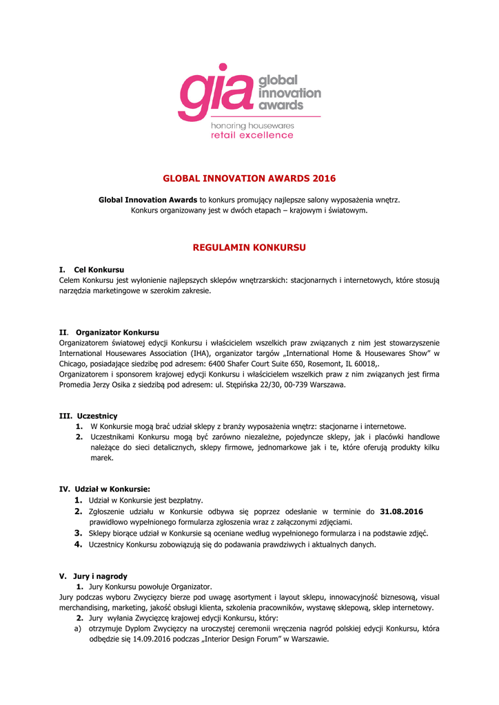 GLOBAL INNOVATION AWARDS 2016 Global Innovation Awards to konkurs promujący najlepsze salony wyposażenia wnętrz. Konkurs organizowany jest w dwóch etapach – krajowym i światowym. REGULAMIN KONKURSU I. Cel Konkursu Celem Konkursu jest wyłonienie najlepszych sklepów wnętrzarskich: stacjonarnych i internetowych, które stosują narzędzia marketingowe w szerokim zakresie. II. Organizator Konkursu Organizatorem światowej edycji Konkursu i właścicielem wszelkich praw związanych z nim jest stowarzyszenie International Housewares Association (IHA), organizator targów „International Home & Housewares Show” w Chicago, posiadające siedzibę pod adresem: 6400 Shafer Court Suite 650, Rosemont, IL 60018,. Organizatorem i sponsorem krajowej edycji Konkursu i właścicielem wszelkich praw z nim związanych jest firma Promedia Jerzy Osika z siedzibą pod adresem: ul. Stępińska 22/30, 00-739 Warszawa. III. Uczestnicy 1. W Konkursie mogą brać udział sklepy z branży wyposażenia wnętrz: stacjonarne i internetowe. 2. Uczestnikami Konkursu mogą być zarówno niezależne, pojedyncze sklepy, jak i placówki handlowe należące do sieci detalicznych, sklepy firmowe, jednomarkowe jak i te, które oferują produkty kilku marek. IV. Udział w Konkursie: 1. Udział w Konkursie jest bezpłatny. 2. Zgłoszenie udziału w Konkursie odbywa się poprzez odesłanie w terminie do 31.08.2016 prawidłowo wypełnionego formularza zgłoszenia wraz z załączonymi zdjęciami. 3. Sklepy biorące udział w Konkursie są oceniane według wypełnionego formularza i na podstawie zdjęć. 4. Uczestnicy Konkursu zobowiązują się do podawania prawdziwych i aktualnych danych. V. Jury i nagrody 1. Jury Konkursu powołuje Organizator. Jury podczas wyboru Zwycięzcy bierze pod uwagę asortyment i layout sklepu, innowacyjność biznesową, visual merchandising, marketing, jakość obsługi klienta, szkolenia pracowników, wystawę sklepową, sklep internetowy. 2. Jury wyłania Zwycięzcę krajowej edycji Konkursu, który: a) otrzymuje Dyplom Zwycięzcy na uroczystej ceremonii wręczenia nagród polskiej edycji Konkursu, która odbędzie się 14.09.2016 podczas „Interior Design Forum” w Warszawie. b) c) a) b) c) weźmie udział w światowej edycji Konkursu, która wyłania 5 laureatów globalnych, zwycięzcę konkursu na najlepszej wystawę sklepową oraz zwycięzcę konkursu na najlepszy sklep internetowy. jest zaproszony do Chicago na koszt Organizatora (który pokrywa koszty przelotów i hotelu), by wziąć udział w uroczystej Gali GIA (18.03.2017.) podsumowującej światowy etap Konkursu, a także by odwiedzić targi „International Home & Housewares Show” (18-21.03.2017.), korzysta z prowadzonych przez Organizatora działań reklamowych i public relations promujących Konkurs i jego Zwycięzców, ma prawo do posługiwania się tytułem krajowego Zwycięzcy Konkursu Global Innovation Awards 2016 we wszystkich swoich materiałach promocyjnych, z obowiązkowym podaniem firmy Promedia, jako Organizatora Konkursu. Organizator Konkursu zastrzega sobie prawo i możliwość przyznania dodatkowych Wyróżnień uczestnikom Konkursu. VI. Postanowienia końcowe 1. Organizatorowi Konkursu przysługuje prawo odwołania Konkursu bez podania przyczyny. 2. W sprawach nie ujętych w regulaminie, decyzje podejmuje Organizator Konkursu. 3. Organizator Konkursu może unieważnić przyznanie nagrody w przypadku niedopełnienia przez Uczestnika Konkursu wymogów regulaminowych. Organizator: Promedia Jerzy Osika