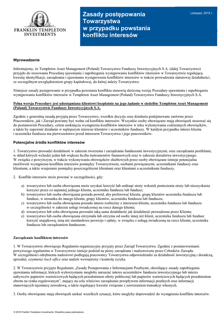 Zasady postępowania Towarzystwa w przypadku powstania konfliktu interesów Listopad, 2015 r. Wprowadzenie Informujemy, że Templeton Asset Management (Poland) Towarzystwo Funduszy Inwestycyjnych S.A. (dalej Towarzystwo) przyjęło do stosowania Procedurę ujawniania i zapobiegania występowaniu konfliktów interesów w Towarzystwie regulującą kwestię identyfikacji, zarządzania i ujawniania występowania konfliktów interesów w trakcie prowadzenia statutowej działalności, ze szczególnym uwzględnieniem grupy kapitałowej, do której należy Towarzystwo. Niniejsze zasady postępowania w przypadku powstania konfliktu stanowią skróconą wersję Procedury ujawniania i zapobiegania występowaniu konfliktów interesów w Templeton Asset Management (Poland) Towarzystwo Funduszy Inwestycyjnych S.A. Pełna wersja Procedury jest udostępniana klientowi bezpłatnie na jego żądanie w siedzibie Templeton Asset Management (Poland) Towarzystwie Funduszy Inwestycyjnych S.A. Zgodnie z generalną zasadą przyjętą przez Towarzystwo, wszelkie decyzje oraz działania podejmowane zarówno przez Pracowników, jak i Zarząd powinny być wolne od konfliktu interesów. Wszystkie osoby obowiązane mają obowiązek stosować się do postanowień Procedury, celem uniknięcia wystąpienia konfliktów interesów w toku wykonywania codziennych obowiązków, a także by zapewnić działanie w najlepszym interesie klientów i uczestników funduszy. W każdym przypadku interes klienta i uczestnika funduszu ma pierwszeństwo przed interesem Towarzystwa i jego pracowników. Potencjalne źródła konfliktów interesów 1. Towarzystwo prowadzi działalność w zakresie tworzenia i zarządzania funduszami inwestycyjnymi, oraz zarządzania portfelami, w skład których wchodzi jeden lub większa liczba instrumentów finansowych oraz w zakresie doradztwa inwestycyjnego. W związku z powyższym, w trakcie wykonywania obowiązków służbowych przez osoby obowiązane istnieje potencjalna możliwość wystąpienia konfliktu interesów pomiędzy Towarzystwem, osobami powiązanymi, uczestnikami funduszy oraz klientami, a także wzajemnie pomiędzy poszczególnymi klientami oraz klientami a uczestnikami funduszy. 2. Konflikt interesów może powstać w szczególności, gdy: a) towarzystwo lub osoba obowiązana może uzyskać korzyść lub uniknąć straty wskutek poniesienia straty lub nieuzyskania korzyści przez co najmniej jednego klienta, uczestnika funduszu lub fundusz; b) towarzystwo lub osoba obowiązana posiada powód, aby preferować klienta, grupę klientów uczestnika funduszu lub fundusz, w stosunku do innego klienta, grupy klientów, uczestnika funduszu lub funduszu; c) towarzystwo lub osoba obowiązana posiada interes rozbieżny z interesem klienta, uczestnika funduszu lub funduszu w szczególności w zakresie usługi świadczonej na rzecz danego klienta; d) towarzystwo lub soba obowiązana prowadzi taką sama działalność jak działalność prowadzona przez Klienta; e) towarzystwo lub osoba obowiązana otrzymała lub otrzyma od osoby innej niż klient, uczestnika funduszu lub fundusz korzyść majątkową, inną niż standardowe prowizje i opłaty, w związku z usługą świadczoną na rzecz klienta, uczestnika funduszu lub zarządzaniem funduszem. Zarządzanie konfliktem interesów 1. W Towarzystwie obowiązuje Regulamin organizacyjny przyjęty przez Zarząd Towarzystwa. Zgodnie z postanowieniami powyższego regulaminu w Towarzystwie istnieje podział na piony zarządzane i nadzorowane przez Członków Zarządu. W szczególności odrębnemu nadzorowi podlegają pracownicy Towarzystwa odpowiedzialni za działalność inwestycyjną i doradczą, sprzedaż, czynności back office oraz nadzór wewnętrzny i kontrolę ryzyka. 2. W Towarzystwie przyjęto Regulamin „Zasady Postępowania z Informacjami Poufnymi, określający zasady zapobiegania ujawnianiu informacji, których wykorzystanie mogłoby naruszać interes uczestników funduszu inwestycyjnego lub interes nabywców papierów wartościowych będących przedmiotem oferty publicznej lub papierów wartościowych będących przedmiotem obrotu na rynku regulowanym”, mający na celu właściwe zarządzanie przepływem informacji poufnych oraz informacji stanowiących tajemnicę zawodową, a także regulujący kwestie związane z zawieraniem transakcji własnych. 3. Osoby obowiązane mają obowiązek unikać wszelkich sytuacji, które mogłyby doprowadzić do wystąpienia konfliktu interesów. © 2015 Franklin Templeton Investments. Wszelkie prawa zastrzeżone. 4. Osoby obowiązane, które w ramach swoich obowiązków służbowych będą wykonywać czynności związane z zarządzaniem portfelami inwestycyjnymi funduszy oraz świadczeniem usług zarządzania portfelami, w skład których wchodzi jeden lub większa liczba instrumentów finansowych lub doradztwa inwestycyjnego na rzecz klientów są zobowiązane do: a) respektowania istniejącego podziału między portfelami: - funduszy, - klientów, - towarzystwa, - własnymi osób obowiązanych; b) działania w najlepiej pojętym interesie funduszy, uczestników funduszy oraz klientów, stawiając interes funduszy, uczestników funduszy i klientów ponad interes Towarzystwa oraz własny; c) niedokonywania w sposób świadomy transakcji, w których stronami będą fundusze, portfele klientów zarządzane przez Towarzystwo, portfele własne Towarzystwa bądź osoby obowiązane; d) niewykorzystywania informacji w przedmiocie potencjalnych lokat, w tym również w zakresie decyzji inwestycyjnych podejmowanych przez podmioty z grupy kapitałowej, do której należy Towarzystwo, w szczególności w zakresie wydawanych przez osoby obowiązane porad inwestycyjnych. 5. Z zastrzeżeniem pkt 6 – 7, w przypadku wystąpienia potencjalnej sytuacji konfliktu interesów, osoba obowiązana jest zobowiązana do niezwłocznego poinformowania o tej sytuacji właściwego Członka Zarządu pełniącego jednocześnie funkcję D
