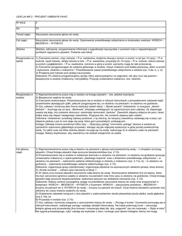 LEKCJA NR 2 - PROJEKT UMIEM PŁYWAĆ Nr lekcji 2 Str. 70 Temat zajęć: Nauczanie zanurzania głowy do wody. Cel zajęć: Nauczanie zanurzania głowy do wody. Opanowanie prawidłowego oddychania w środowisku wodnym: WDECH – BEZDECH – WYDECH. Zbiórka Zbiórka, odliczenie, przypomnienie informacji o sygnalizacji nauczyciela z uczniami oraz o najważniejszych punktach regulaminu pływalni. Podanie celu lekcji. Rozgrzewka na 1) Ćwiczenia ramion, nóg i tułowia: • P.w. swobodna, krążenia oburącz ramion w przód i w tył (po 10 razy). • P.w. lądzie rozkrok, opad tułowia, skręty tułowia w bok. • P.w. swobodna, przysiady (5–10 razy). • P.w. rozkrok, skłony tułowia w przód z pogłębieniem. • P.w. swobodna, ramiona w górę w przód, wymachy nogą do ręki przeciwnej. 2) Ćwiczenie przygotowujące do zadania głównego w wodzie: chwyć makaron pod klatką piersiową, skłon w przód i wykonanie „okienka z makaronu”. Przedstawienie zasad prawidłowego oddychania w wodzie (rys. 2.9a, b, c, d). 3) Przejście pod natrysk pod opieką nauczyciela. Zalecenie: Po zbiórce przygotowujemy sprzęt, który wykorzystujemy na zajęciach, tak aby czuć się pewnie i bezpiecznie w wodzie (makarony i skrzydełka). Pozycja uniwersalna makaronu, tzw. okienko. Rozgrzewka w wodzie 1) Naprzemianstronna praca nóg w siadzie na brzegu pływalni – tzw. płaskie kopnięcie. 2) Bezpieczne wejście do wody. 3) Ćwiczenie doskonalące. Przemieszczanie się w wodzie w różnych kierunkach z prowadzeniem zabawek bądź przedmiotów pływających (piłki, piłeczki pingpongowe itp.) w ułożeniu na piersiach i w ułożeniu na grzbiecie. 4) Gry, zabawy i konkursy jako forma realizacji zadań lekcji: • „Berek parami” Ustawienie: w rozsypce; „dwóch berków” – trzymają się za ręce. „Berkowie” chwytają uciekających na ograniczonym polu zabawy. Za złapanego uważa się tego, kto zostanie otoczony i zamknięty ramionami „berków”. Zawodnik złapany dołącza do pary i teraz trójka stara się złapać następnego zawodnika. Wygrywa ten, kto zostanie złapany jako ostatni. Odmiana: Ustawienie i przebieg zabawy podobne, z tą różnicą, że wszyscy zawodnicy ustawiają się w pary i po złapaniu jednej z par to ona staje się parą, która goni pozostałych uciekających. Uwaga: Zabawę można powtórzyć kilka razy. • „Skaczący pstrąg” Uczniowie „pstrągi” skaczą w wodzie po uprzednim wykonaniu głębokiego przysiadu, starając się jak najwyżej wyskoczyć w górę ponad powierzchnię wody. Co jakiś czas lub kilka skoków płasko rzucają się na wodę, wykonując to w ułożeniu ciała na piersiach. Uwaga: Należy dopilnować, aby zawodnicy nie skakali wzajemnie na siebie. Cel główny zajęć 1) Naprzemianstronna praca nóg w leżeniu na piersiach z głową nad powierzchnią wody – z chwytem za brzeg pływalni. Chwyt brzegu pływalni daje poczucie bezpieczeństwa (rys. 2.10). 2) Przemieszczanie się w wodzie w ustalonym kierunku w ułożeniu na piersiach i w ułożeniu na grzbiecie (pozycja uniwersalna makaronu) z wykorzystaniem „płaskiego kopania” oraz z dodaniem prawidłowego oddychania: • w ułożeniu na piersiach – wykonanie zadania oddechowego w okienku z makaronu (rys. 2.11a, b), • w ułożeniu na grzbiecie – wykonanie prawidłowego zadania oddechowego (rys. 2.12). Zalecenie: organizacja grupy szkoleniowej i organizacja pływania na wyznaczonym akwenie (prawa, lewa strona). 3) „Koniki morskie” – zobacz opis ćwiczenia w lekcji 1. 4) W staniu przy ścianie pływalni zanurzenie całej twarzy do wody. Wyznaczenie dokładnie linii na twarzy, która ma być zanurzona (granica czepka w ułożeniu na piersiach oraz linia uszu w ułożeniu na grzbiecie). Chwyt brzegu pływalni daje poczucie bezpieczeństwa; wytłumacz jeszcze raz dokładnie ćwiczenie (rys. 2.13). Zalecenie: Należy zwrócić szczególną uwagę na prawidłowe zanurzenie twarzy do wody oraz przypomnieć o kolejności: WDECH – BEZDECH – WYDECH z liczeniem: WDECH – zatrzymanie powietrza – BEZDECH – liczymy na palcach do 3, WYDECH do wody – liczymy na palcach do trzech. Czas trwania bezdechu powinien być zbliżony do czasu trwania wydechu do wody. 5) Wyławianie zabawek tonących z dna pływalni z wykorzystaniem żerdzi pływackiej (woda płytka, woda głęboka) (rys.2.14a, b). 6) Przysiady w wodzie (rys. 2.15). 7) Gry, zabawy i konkursy związane z zanurzaniem twarzy do wody. • „Pociąg w tunelu” Uczniowie poruszają się w różnych kierunkach, naśladując pociąg i wydając dźwięki lokomotywy. Na trasie pokonują tunel – zanurzają kolejno głowę pod przeszkodą (lina torowa) i maszerują dalej tak, aby „wagoniki” się nie rozerwały. • „Ryby w sieci” Na sygnał prowadzącego „ryby” starają się wydostać z sieci, nurkując pod rękami kolegów, którzy nie mogą utrudniać wydostania się. Po upływie umówionego czasu następuje zmiana. Wygrywa grupa, z której więcej „ryb” wydostało się z „sieci”. • „Baraszkujące delfinki” Deski pływają po wodzie. Dzieci nurkują pod wyznaczone przez siebie deski i starają się podrzucić je jak najwyżej. • Zanurzenie twarzy w dwójkach Trzymając się za ręce w parach naprzeciw siebie, dzieci wykonują na zmianę przysiad z zanurzeniem głowy pod wodę. • Zanurzenie twarzy z obręczą Kilkoro ćwiczących (około 4) trzyma dłońmi za obręcz: a) zanurza twarz do wody, b) wchodzi do wnętrza obręczy. 8) Skoki z siadu na brzegu pływalni. Wprowadzenie skoku na sygnał prowadzącego, głęboki wdech w momencie 6) Przysiady w wodzie (rys. 2.15). 7) Gry, zabawy i konkursy związane z zanurzaniem twarzy do wody. • „Pociąg w tunelu” Uczniowie poruszają się w różnych kierunkach, naśladując pociąg i wydając dźwięki lokomotywy. Na trasie pokonują tunel – zanurzają kolejno głowę pod przeszkodą (lina torowa) i maszerują dalej tak, aby „wagoniki” si