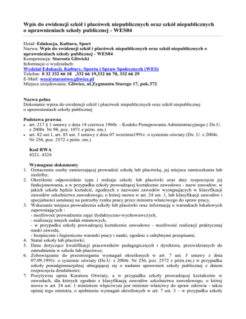 Wpis do ewidencji szkół i placówek niepublicznych oraz szkół niepublicznych o uprawnieniach szkoły publicznej - WES04 Dział: Edukacja, Kultura, Sport Nazwa: Wpis do ewidencji szkół i placówek niepublicznych oraz szkół niepublicznych o uprawnieniach szkoły publicznej - WES04 Kompetencja: Starosta Gliwicki Informacje o wydziałach: Wydział Edukacji, Kultury, Sportu i Spraw Społecznych (WES) Telefon: 0 32 332 66 18 ,332 66 19,332 66 70, 332 66 29 E-Mail: [email protected] Miejsce urzędowania: Gliwice, ul.Zygmunta Starego 17, pok.372 Nazwa pełna Dokonanie wpisu do ewidencji szkół i placówek niepublicznych oraz szkół niepublicznej o uprawnieniach szkoły publicznej Podstawa prawna art. 217 § 1 ustawy z dnia 14 czerwca 1960r. - Kodeks Postępowania Administracyjnego ( Dz.U. z 2000r. Nr 98, poz. 1071 z późn. zm.) art. 82 ust.1, art. 85 ust. 3 ustawy z dnia 07 września1991r. o systemie oświaty (Dz. U. z 2004r. Nr 256, poz. 2572 z późn. zm.) Kod RWA 4321, 4324 1. 2. 3. 4. 5. 6. 7. Wymagane dokumenty Oznaczenie osoby zamierzającej prowadzić szkołę lub placówkę, jej miejsca zamieszkania lub siedziby; Określenie odpowiednio typu i rodzaju szkoły lub placówki oraz daty rozpoczęcia jej funkcjonowania, a w przypadku szkoły prowadzącej kształcenie zawodowe - nazw zawodów, w jakich szkoła będzie kształcić, zgodnych z nazwami zawodów występujących w klasyfikacji zawodów szkolnictwa zawodowego, o której mowa w art. 24 ust. 1, lub klasyfikacji zawodów i specjalności ustalanej na potrzeby rynku pracy przez ministra właściwego do spraw pracy, Wskazanie miejsca prowadzenia szkoły lub placówki oraz informację o warunkach lokalowych zapewniających : - możliwość prowadzenia zajęć dydaktyczno-wychowawczych, - realizację innych zadań statutowych, - w przypadku szkoły prowadzącej kształcenie zawodowe - możliwość realizacji praktycznej nauki zawodu, - bezpieczne i higieniczne warunki pracy i nauki, zgodnie z odrębnymi przepisami, Statut szkoły lub placówki; Dane dotyczące kwalifikacji pracowników pedagogicznych i dyrektora, przewidzianych do zatrudnienia w szkole lub placówce; Zobowiązanie do przestrzegania wymagań określonych w art. 7 ust. 3 ustawy z dnia 07.09.1991r. o systemie oświaty (Dz.U. z 2004r. Nr 256, poz. 2572 z późn.zm.) w przypadku szkoły ponadgimnazjalnej ubiegającej się o nadanie uprawnień szkoły publicznej z dniem rozpoczęcia działalności; Pozytywna opnia Kuratora Oświaty, a w przypadku szkoły prowadzącej kształcenie w zawodach, dla których zgodnie z klasyfikacją zawodów szkolnictwa zawodowego, o której mowa w art. 24 ust. 1 ministrem włąściwym jest minister właściwy do spraw zdrowia - takze opinię tego ministra, o spełnieniu wymagań określonych w art. 7 ust. 3 – w przypadku szkoły ponadgimnazjalnej ubiegajęcej się o nadanie uprawnień szkoły publicznej z dniem rozpoczęcia działalności. 8. Dane niezbędne do wpisania szkoły lub placówki do krajowego rejestru urzędowego podmiotów gospodarki narodowej. Formularze Wniosek o wpis do ewidencji szkół i placówek niepublicznych Wniosek o wpis do ewidencji szkół niepublicznych o uprawnieniach szkół publicznych Opłaty Brak opłaty skarbowej. Miejsce załatwienia sprawy Wydział Edukacji, Kultury, Sportu i Spraw Społecznych Jednostka odpowiedzialna Starostwo Powiatowe w Gliwicach - Wydział Edukacji, Kultury, Sportu i Spraw Społecznych, tel. (32) 332 66 29, (32) 332 66 18 Termin odpowiedzi 30 dni od daty zgłoszenia Tryb odwoławczy Nie przysługuje. Uwagi Zobowiązanie osoby prowadzącej szkołę lub placówkę do zgłoszenia w ciągu 14 dni zmian w danych zawartych w zgłoszeniu, powstałych po wpisie do ewidencji.