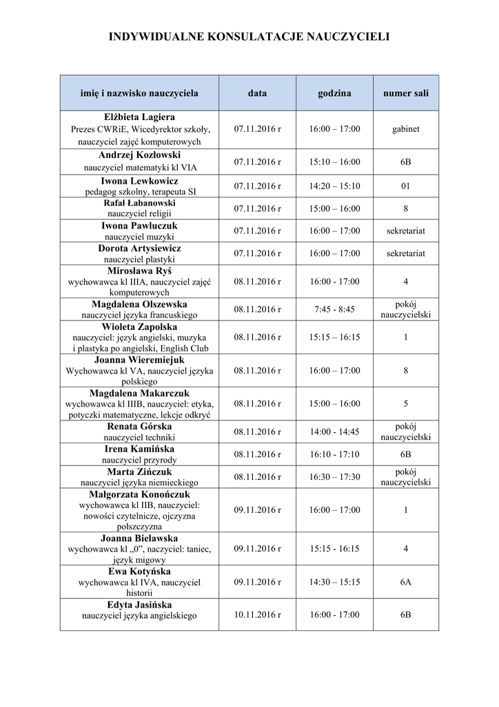 INDYWIDUALNE KONSULATACJE NAUCZYCIELI imię i nazwisko nauczyciela data godzina numer sali 07.11.2016 r 16:00 – 17:00 gabinet 07.11.2016 r 15:10 – 16:00 6B 07.11.2016 r 14:20 – 15:10 01 07.11.2016 r 15:00 – 16:00 8 07.11.2016 r 16:00 – 17:00 sekretariat 07.11.2016 r 16:00 – 17:00 sekretariat 08.11.2016 r 16:00 - 17:00 4 08.11.2016 r 7:45 - 8:45 pokój nauczycielski 08.11.2016 r 15:15 – 16:15 1 08.11.2016 r 16:00 – 17:00 8 08.11.2016 r 15:00 – 16:00 5 08.11.2016 r 14:00 - 14:45 pokój nauczycielski 08.11.2016 r 16:10 - 17:10 6B 08.11.2016 r 16:30 – 17:30 pokój nauczycielski 09.11.2016 r 16:00 – 17:00 1 09.11.2016 r 15:15 - 16:15 4 09.11.2016 r 14:30 – 15:15 6A 10.11.2016 r 16:00 - 17:00 6B Elżbieta Lagiera Prezes CWRiE, Wicedyrektor szkoły, nauczyciel zajęć komputerowych Andrzej Kozłowski nauczyciel matematyki kl VIA Iwona Lewkowicz pedagog szkolny, terapeuta SI Rafał Łabanowski nauczyciel religii Iwona Pawluczuk nauczyciel muzyki Dorota Artysiewicz nauczyciel plastyki Mirosława Ryś wychowawca kl IIIA, nauczyciel zajęć komputerowych Magdalena Olszewska nauczyciel języka francuskiego Wioleta Zapolska nauczyciel: język angielski, muzyka i plastyka po angielski, English Club Joanna Wieremiejuk Wychowawca kl VA, nauczyciel języka polskiego Magdalena Makarczuk wychowawca kl IIIB, nauczyciel: etyka, potyczki matematyczne, lekcje odkryć Renata Górska nauczyciel techniki Irena Kamińska nauczyciel przyrody Marta Zińczuk nauczyciel języka niemieckiego Małgorzata Konończuk wychowawca kl IIB, nauczyciel: nowości czytelnicze, ojczyzna polszczyzna Joanna Bielawska wychowawca kl „0”, naczyciel: taniec, język migowy Ewa Kotyńska wychowawca kl IVA, nauczyciel historii Edyta Jasińska nauczyciel języka angielskiego INDYWIDUALNE KONSULATACJE NAUCZYCIELI Dorota Saniewska wychowawca kl IIA, nauczyciel: koło reporterów, potyczki ortograficzne Beata Malinowska- Bejda nauczyciel języka angielskiego 10.11.2016 r 16:00 – 17:00 7 10.11.2016 r 15:15-16:15 5 10.11.2016 15:30 - 16:30 1 10.11.2016 r 16:15 - 17:15 8 15.11.2016 r 15:00 – 16:00 gabinet Barbara Radomyska wychowawca kl IA, nauczyciel: potyczki ortograficzne, koło edukacyjne „przygody z literami i cyframi” Agnieszka Mancewicz nauczyciel matematyki kl IVA, VA Agnieszka Iłendo – Milewska Dyrektor szkoły, psycholog, wychowawca kl. VIA