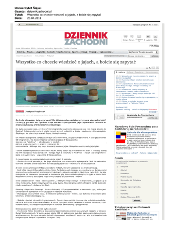Uniwersytet l¹ski Gazeta: dziennikzachodni.pl Tytu³: Wszystko co chcecie wiedzieæ o jajach, a boicie siê zapytaæ Data: 20.04.2011 POLSKATIMES.PL Najlepszy program TV w sieci Sklepy Forum Program E-wydania RSS TV środa 20 kwietnia 2011 r. imieniny obchodz ą : Agnieszka, Teodor, Czes ław Fakty24 Śląsk Zagłębie Beskidy Częstochowa Sport Dziennik Zachodni » Aktualności » Artyku ł Drogi Więcej Ogłoszenia Wybierz Twoje miasto Dodaj ogłoszenie do gazety 6 Szukaj na stronie... Wszystko co chcecie wiedzieć o jajach, a boicie się zapytać Z regionu Polska Popularne Komentowane 13:31 Wszystko co chcecie wiedzieć o jajach, a boicie się zapytać 12:59 Myszków: Maszt telefonii komórkowej zawieszony 12:44 Cz ęstochowa: Nowe utrudnienia wokół placu Biegańskiego. Uwaga na zakazy na Pułaskiego 11:45 Komendant straży miejskiej w Tarnowskich Górach straci ł stanowisko 11:37 Mysłowice: Z kasy urz ędu zniknęło 100 tys. zł. Są zwolnienia 11:30 Bytom: Dziecko bawi ło się na parapecie, a matka pijana 10:50 Pikieta przeciwko łamaniu praw pracowniczych w Fiat Auto Poland 3 jajka wytrzymują obciążenie nawet ponad 150 kg (© arkadiusz ławrywianiec) Porównaj OFE Sprawdź ranking i zmie ń na Najlepszy! Reklama Justyna Przybytek więcej » Zapisz się do Newslettera 2 0 1 1 - 04 - 20 13:31:42, aktualizacja: 2011 - 04 - 20 13:34:07 [email protected] Co by ło pierwsze: jajo, czy kura? Ile kilogramów nacisku wytrzyma skorupka jaja? Co maj ą pisanki do Żydów? I kto zakaza ł spożywania jaj? Odpowiedzi udzielili w środę naukowcy z Uniwersytetu Śląskiego. Co by ło pierwsze: jajo, czy kura? Ile kilogramów wytrzyma skorupka jaja i co maj ą pisanki do Żydów? Odpowiedzi na te i wiele innych pyta ń udzielili w środę naukowcy z Uniwersytetu Śląskiego. Na placu boju stanęli fizycy, biolog i etnolog. Narodowy Spis Powszechny 2011 Zadeklaruj narodowość » Spisz się dla własnego dobra Dr Aneta Szczygielska z Instytutu Fizyki UŚ udowodni ła, że jajko zniesie wiele. A trzy jajka nawet 60 kilogramów. Na dowód mocnej konstrukcji jajka dr Szczygielska stan ęła n a " s t o l i k u " - zbudowany z dwóch pły t e k w y k o n a n y c h z p i a n k i s łużąc e j d o uszczelniania - którego trzy nogi stanowi ły surowe jajka. Wszystkie wytrzyma ły jej cięż ar. Od 1 kwietnia do 30 czerwca trwa Narodowy Spis Powszechny Ludności i Mieszkań. W formularzu w zależności od jego rodzaju jest od kilku do kilkudziesięciu pytań. Najbardziej kontrowersyjne dotycz ą narodowości i przynależności do grupy etnicznej. Poznaj wszystkie pytania i dowiedz si ę, jak wypełnić formularz. » - Stolik zosta ł wykonany na Festiwal Nauki, który odby ł się w Genewie w 2007 r. i wtedy stan ął na nim najcięż szy nasz odwa żnik - kolega fizyk z Instytutu w Madrycie - wa żył 156 kilogramów i jajka też wytrzymały - wspomina dr Szczygielska. Jaką narodowość wybrać? Z czego bierze si ę wytrzymała konstrukcja jajka? Z kszta łtu. - Owalny kszta łt powoduje, że jego skorupka jest niezwykle wytrzyma ła. Jest to naturalna ochrona zarodka przed ci ęż arem wysiaduj ącej jajka kury - tłumaczyła dr Szczygielska. Z kolei etnolog Grzegorz Odoj opowiadał o mitach, którymi uzasadnia si ę malowanie jaj. - Jest kilka nawet kilkana ście mitów, które funkcjonowa ły jeszcze do niedawna w świadomo ści starszych przedstawicieli spo łeczno ści lokalnych, g łównie wiejskich. Niektórzy twierdzili, że jaja maluje si ę na czerwono, ponieważ w momencie gdy Jezus umar ł na krzyżu, to jajka w domu Marii Magdaleny zosta ły zbryzgane jego krwi ą i zrobiły się czerwone - mówił. Inne uzasadnienie? - Było i takie zgodnie , z którym chłopi wierzyli i ż dzięki temu, że jajka s ą co roku malowane, Żydzi utrzymywani są przy życiu. Więc dzi ęki polskim chłopom naród żydowski miałby przetrwa ć - dodawa ł dr Odoj. Etnolog z Wydzia łu Etnologii i Nauk o Edukacji U Ś przypomniał też o znaczeniu jaja, które jest uniwersalnym symbolem wyst ępującym w różnych kulturach. - Wyst ępuje jako symbol życia, a w łaściwie potencji życia - mówił. Jajo było te ż traktowane jako talizman, przeciwdzia łający złu. Pytania i odpowiedzi Sonda Co najcz ęściej dostajesz w prezencie świątecznym i Słodycze j k l m n j Alkohol k l m n j Kosmetyki k l m n j Modne ciuchy k l m n j Wycieczk ę do Watykanu k l m n j Kwiaty k l m n j Kopertę z pewną kwotą k l m n j Książki k l m n j Komórk ę k l m n j Zestaw filmów na DVD k l m n - Służyło również do praktyk magicznych. Oprócz tego pe łniło istotną rolę w kulcie przodków, także w kulturze staros łowia ńskiej. A tak że jajo jest silnie zwi ązane z kultem solarnym, czyli kultem słońca, też rozpowszechnionym w kulturze s łowia ńskiej - przypominał. Dlatego jedzenia jajek trzeba by ło zakaza ć! - Po chrzcie Polski Ko ściół nie dopuszcza ł jakichkolwiek praktyk zwi ązanych z jajami w okresie Świąt Wielkanocnych. W sumie przez oko ło 200 lat zabronione było te ż spo żywanie jaj w okresie wielkanocnym. Po tym okresie Ko ściół dopuszcza ł możliwość spo życia, ale jaja trzeba by ło obligatoryjnie święcić - opowiada Grzegorz Odoj. Natomiast dla dr Magdaleny Rost - Roszkowskiej z Wydzia łu Biologii i Ochrony Środowiska jajo to nic innego jak komórka jajowa, czyli pocz ątek nowego życia, pod warunkiem, że dotrze do niej Tutaj przeczytasz Dziennik Zachodni » Dziennik Zachodni w lokalach gastronomicznych Jesteś klientem? Sprawd ź, w którym barze, restauracji, czy pubie przeczytasz za darmo Dziennik Zachodni. Jeste ś właścicielem lokalu? Przeczytaj, jak talizman, przeciwdzia łający złu. j Zestaw filmów na DVD k l m n - Służyło również do praktyk magicznych. Oprócz tego pe łniło istotną rolę w kulcie przodków, także w kulturze staros łowia ńskiej. A tak że jajo jest silnie zwi ązane z kultem solarnym, czyli kultem słońca, też ro