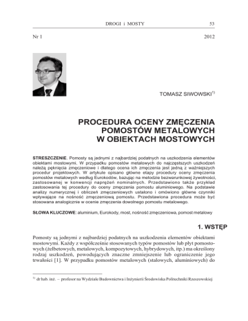 DROGI i MOSTY Nr 1 53 2012 TOMASZ SIWOWSKI1) PROCEDURA OCENY ZMÊCZENIA POMOSTÓW METALOWYCH W OBIEKTACH MOSTOWYCH STRESZCZENIE. Pomosty s¹ jednymi z najbardziej podatnych na uszkodzenia elementów obiektami mostowymi. W przypadku pomostów metalowych do najczêstszych uszkodzeñ nale¿¹ pêkniêcia zmêczeniowe i dlatego ocena ich zmêczenia jest jedn¹ z wa¿niejszych procedur projektowych. W artykule opisano g³ówne etapy procedury oceny zmêczenia pomostów metalowych wed³ug Eurokodów, bazuj¹c na metodzie bezwarunkowej ¿ywotnoœci, zastosowanej w konwencji naprê¿eñ nominalnych. Przedstawiono tak¿e przyk³ad zastosowania tej procedury do oceny zmêczenia pomostu aluminiowego. Na podstawie analizy numerycznej i obliczeñ zmêczeniowych ustalono i omówiono g³ówne czynniki wp³ywaj¹ce na noœnoœæ zmêczeniow¹ pomostu. Przedstawiona procedura mo¿e byæ stosowana analogicznie w ocenie zmêczenia dowolnego pomostu metalowego. S£OWA KLUCZOWE: aluminium, Eurokody, most, noœnoœæ zmêczeniowa, pomost metalowy 1. WSTÊP Pomosty s¹ jednymi z najbardziej podatnych na uszkodzenia elementów obiektami mostowymi. Ka¿dy z wspó³czeœnie stosowanych typów pomostów lub p³yt pomostowych (¿elbetowych, metalowych, kompozytowych, hybrydowych, itp.) ma okreœlony rodzaj uszkodzeñ, powoduj¹cych znaczne zmniejszenie lub ograniczenie jego trwa³oœci [1]. W przypadku pomostów metalowych (stalowych, aluminiowych) do 1) dr hab. in¿. – profesor na Wydziale Budownictwa i In¿ynierii Œrodowiska Politechniki Rzeszowskiej 54 Tomasz Siwowski takich uszkodzeñ nale¿¹ g³ównie rysy i pêkniêcia zmêczeniowe, powstaj¹ce zazwyczaj w tzw. karbach konstrukcyjnych, którymi s¹ najczêœciej po³¹czenia spawane pomiêdzy elementami pomostów [2], [3]. Uszkodzenia te powoduj¹ stopniow¹ utratê sztywnoœci pomostów oraz szybk¹ degradacjê izolacji i nawierzchni, co prowadzi do zmniejszenia trwa³oœci ca³ego obiektu i wzrostu kosztów jego utrzymania. Dlatego ocena zmêczenia pomostów metalowych jest jedn¹ z wa¿niejszych procedur projektowych, których przeprowadzenie – przy zastosowaniu spójnego systemu norm konstrukcyjnych (ang. code checking) – jest konieczne zarówno w przypadku nowo projektowanych obiektów mostowych, jak równie¿ przy ocenie dalszej przydatnoœci eksploatacyjnej obiektów istniej¹cych. Od kwietnia 2010 r., wraz z wycofaniem ze zbioru aktualnych norm krajowych dotychczasowych norm s³u¿¹cych do projektowania mostów, status aktualnych polskich norm maj¹ tzw. Eurokody konstrukcyjne wraz z za³¹cznikami krajowymi. Procedura oceny zmêczenia spawanych pomostów metalowych jest oparta na zaleceniach Eurokodów 1, 3 i 9 [4 - 6]. Metody oceny zmêczenia podane w Eurokodach opieraj¹ siê na ogólnej zasadzie, polegaj¹cej na porównaniu efektów oddzia³ywañ w postaci zakresów naprê¿eñ w sprawdzanym przekroju (po³¹czeniu) do wytrzyma³oœci zmêczeniowej tego karbu. Takie porównanie jest mo¿liwe tylko wtedy, gdy oddzia³ywania zmêczeniowe s¹ okreœlane za pomoc¹ parametrów zmêczeniowych podanych w Eurokodach. Oddzia³ywania do oceny zmêczenia przyjmuje siê zgodnie ze specyficznymi wymaganiami, które s¹ ró¿ne od oddzia³ywañ przyjmowanych przy sprawdzaniu innych stanów granicznych noœnoœci i u¿ytkowalnoœci [4]. Ocenê zmêczenia konstrukcji metalowych wg Eurokodów przeprowadza siê stosuj¹c jedn¹ z nastêpuj¹cych metod: metod¹ bezwarunkowej ¿ywotnoœci (ang. safe life design) lub metod¹ tolerowanych uszkodzeñ (ang. damage tolerant design). Metoda bezwarunkowej ¿ywotnoœci zapewnia odpowiedni¹ niezawodnoœæ konstrukcji bez koniecznoœci regularnych kontroli na okolicznoœæ uszkodzeñ zmêczeniowych w okresie eksploatacji. Metodê tê stosuje siê, gdy lokalne pêkniêcie mog³yby doprowadziæ do zniszczenia elementu i/lub konstrukcji. Metoda tolerowanych uszkodzeñ zapewnia odpowiedni¹ niezawodnoœæ konstrukcji pod warunkiem, ¿e w okresie eksploatacji konstrukcja jest poddawana cyklicznej kontroli i zabiegom utrzymaniowym, maj¹cym na celu wykrycie i usuniêcie uszkodzeñ zmêczeniowych. Obie normy dopuszczaj¹ tak¿e stosowanie metody oceny zmêczenia za pomoc¹ badañ (ang. design by testing). Jednak¿e metoda ta jest stosowana tylko wówczas, gdzie dane konieczne do oceny zmêczenia, np. obci¹¿enie zmêczeniowe, poziomy naprê¿eñ w konstrukcji odpowiadaj¹ce tym obci¹¿eniom, wytrzyma³oœæ zmêczeniowa detali lub dane dotycz¹ce propagacji rys, nie s¹ dostêpne w Eurokodach lub innych Ÿród³ach naukowych. W projektowaniu nowych konstrukcji metalowych powszechnie jest stosowana metoda bezwarunkowej ¿ywotnoœci, bêd¹ca najbardziej konserwatywn¹, lecz zapewniaj¹ca maksymaln¹ niezawodnoœæ projektowanej konstrukcji. Metodê tolerowanych uszkodzeñ stosuje siê tylko w przypadku, gdy ¿ywotnoœæ zmêczeniowa wyznaczona dla projektowego widma obliczeniowego metod¹ bezwarunkowej ¿ywotnoœci jest krótsza od projektowanego okresu eksploatacji konstrukcji. DROGI i MOSTY 1/2012 OCENA ZMÊCZENIA POMOSTÓW METALOWYCH W OBIEKTACH MOSTOWYCH 55 Stalowe pomosty ortotropowe to powszechnie znane i najczêœciej stosowane rozwi¹zania konstrukcyjne wœród pomostów metalowych. Problematyka ich noœnoœci zmêczeniowej by³a przedmiotem bardzo licznych badañ, których wyniki pos³u¿y³y do ustalenia wytrzyma³oœci zmêczeniowej elementów i typowych karbów w tego typu pomostach [7 - 10]. Pomosty aluminiowe s¹ wykonywane w obiektach mostowych od ponad 75 lat [11]. Wspó³czesne pomosty aluminiowe drogowych obiektów mostowych s¹ wykonywane z aluminiowych kszta³towników wyciskanych, ³¹czonych w panele przez spawanie, zgrzewanie tarciowe lub za pomoc¹ ³¹czników mechanicznych [12]. Jak wykaza³y liczne badania, zmêczenie jest zazwyczaj decyduj¹cym stanem granicznym noœnoœci aluminiowych pomostów obiektów mostowych [3], [13 - 16]. Zatem w obu przypadkach w³aœciwa ocena zmêczenia ju¿ na etap