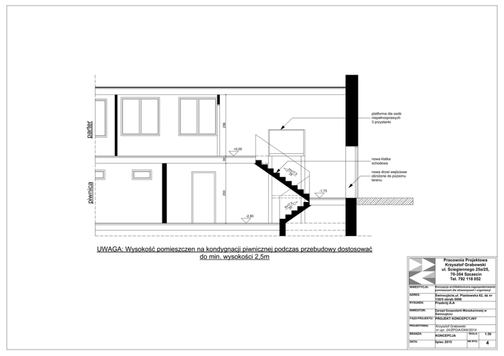 256 parter platforma dla osób niepełnosprawych 3 przystanki +0,00 30 nowa klatka schodowa nowa drzwi wejściowe obniżone do poziomu terenu -1,75 250 piwnica 10 x1 25 7,5 ,5 17 6x 25 -2,80 UWAGA: Wysokość pomieszczen na kondygnacji piwnicznej podczas przebudowy dostosować do min. wysokości 2,5m Pracownia Projektowa Krzysztof Grabowski ul. Ściegiennego 25a/25, 70-354 Szczecin Tel. 792 118 052 INWESTYCJA: Koncepcja architektoniczna zagospodarowania pomieszczeń dla stowarzyszeń i organizacji ADRES: Świnoujście,ul. Piastowska 62, dz nr 130/5 obręb 0006 Przekrój A-A RYSUNEK: INWESTOR: Zarząd Gospodarki Mieszkaniowej w Świnoujściu FAZA PROJEKTU: PROJEKT KONCEPCYJNY PROJEKTOWAŁ BRANŻA: DATA: Krzysztof Grabowski nr upr. 24/ZPOiA/OKK/2014 KONCEPCJA lipiec 2015 SKALA: 1:50 NR RYS.: 4