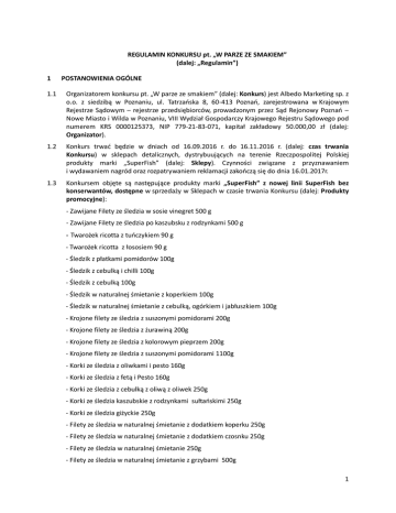 REGULAMIN KONKURSU pt. „W PARZE ZE SMAKIEM” (dalej: „Regulamin”) 1 POSTANOWIENIA OGÓLNE 1.1 Organizatorem konkursu pt. „W parze ze smakiem” (dalej: Konkurs) jest Albedo Marketing sp. z o.o. z siedzibą w Poznaniu, ul. Tatrzańska 8, 60-413 Poznań, zarejestrowana w Krajowym Rejestrze Sądowym – rejestrze przedsiębiorców, prowadzonym przez Sąd Rejonowy Poznań – Nowe Miasto i Wilda w Poznaniu, VIII Wydział Gospodarczy Krajowego Rejestru Sądowego pod numerem KRS 0000125373, NIP 779-21-83-071, kapitał zakładowy 50.000,00 zł (dalej: Organizator). 1.2 Konkurs trwać będzie w dniach od 16.09.2016 r. do 16.11.2016 r. (dalej: czas trwania Konkursu) w sklepach detalicznych, dystrybuujących na terenie Rzeczpospolitej Polskiej produkty marki „SuperFish” (dalej: Sklepy). Czynności związane z przyznawaniem i wydawaniem nagród oraz rozpatrywaniem reklamacji zakończą się do dnia 16.01.2017r. 1.3 Konkursem objęte są następujące produkty marki „SuperFish” z nowej linii SuperFish bez konserwantów, dostępne w sprzedaży w Sklepach w czasie trwania Konkursu (dalej: Produkty promocyjne): - Zawijane Filety ze śledzia w sosie vinegret 500 g - Zawijane Filety ze śledzia po kaszubsku z rodzynkami 500 g - Twarożek ricotta z tuńczykiem 90 g - Twarożek ricotta z łososiem 90 g - Śledzik z płatkami pomidorów 100g - Śledzik z cebulką i chilli 100g - Śledzik z cebulką 100g - Śledzik w naturalnej śmietanie z koperkiem 100g - Śledzik w naturalnej śmietanie z cebulką, ogórkiem i jabłuszkiem 100g - Krojone filety ze śledzia z suszonymi pomidorami 200g - Krojone filety ze śledzia z żurawiną 200g - Krojone filety ze śledzia z kolorowym pieprzem 200g - Krojone filety ze śledzia z suszonymi pomidorami 1100g - Korki ze śledzia z oliwkami i pesto 160g - Korki ze śledzia z fetą i Pesto 160g - Korki ze śledzia z cebulką z oliwą z oliwek 250g - Korki ze śledzia kaszubskie z rodzynkami sułtańskimi 250g - Korki ze śledzia giżyckie 250g - Filety ze śledzia w naturalnej śmietanie z dodatkiem koperku 250g - Filety ze śledzia w naturalnej śmietanie z dodatkiem czosnku 250g - Filety ze śledzia w naturalnej śmietanie 250g - Filety ze śledzia w naturalnej śmietanie z grzybami 500g 1 - Filety ze śledzia w naturalnej śmietanie z buraczkami 500g - Filety ze śledzia z suszonymi pomidorami 650g - Filety ze śledzia z pieprzem i ziołami 650g - Filety ze śledzia z krojoną cebulką 650g - Filety ze śledzia z ogórkiem i czosnkiem 400g - Filety ze śledzia z oliwkami 400g - Filety ze śledzia z suszonymi pomidorami 400g - Płaty ze śledzia w zalewie octowej 650g Produkty promocyjne mogą być dostępne w sprzedaży w Sklepach zarówno przed czasem trwania Konkursu, jak i po jego upływie, jednakże wówczas ich zakup nie uprawnia do wzięcia udziału w Konkursie i otrzymania nagrody. 1.4 W Konkursie nie mogą brać udziału pracownicy Organizatora, Graal, a także członkowie ich rodzin, jak również osoby reprezentujące ww. podmioty zgodnie zasadami reprezentacji oraz członkowie rodzin tych osób. Przez członków rodziny, o których mowa powyżej, rozumie się: wstępnych, zstępnych, rodzeństwo, małżonków, małżonków i zstępnych rodzeństwa, rodziców i rodzeństwo małżonków oraz osoby pozostające w stosunku przysposobienia. Pod pojęciem Graal, używanym dalej w Regulaminie, rozumie się Graal Spółka Akcyjna z siedzibą w Wejherowie (84-200), ul. Zachodnia 22, zarejestrowana w Krajowym Rejestrze Sądowym – rejestrze przedsiębiorców, prowadzonym przez Sąd Rejonowy Gdańsk – Północ w Gdańsku, VIII Wydział Gospodarczy Krajowego Rejestru Sądowego pod numerem KRS 0000205630, NIP 5882001859, kapitał zakładowy 80 564 850,00 zł opłacony w całości. 1.5 Konkurs nie jest grą losową, zakładem wzajemnym, ani grą na automatach, których wynik zależy od przypadku w rozumieniu art. 2 ustawy z dnia 19 listopada 2009 roku o grach hazardowych. 1.6 Konkurs jest realizowany przez Organizatora jako przyrzeczenie publiczne w rozumieniu art. 919-921 Kodeksu cywilnego. 1.7 Uczestnik przystępując do Konkursu powinien zapoznać się z treścią Regulaminu. Uczestnik zobowiązuje się do przestrzegania zawartych w nim zasad, jak również potwierdza, iż spełnia wszystkie warunki, które uprawniają go do udziału w Konkursie. 2 WARUNKI UCZESTNICTWA W KONKURSIE 2.1 Uczestnikiem Konkursu może być wyłącznie pełnoletnia osoba fizyczna, posiadająca pełną zdolność do czynności prawnych, zamieszkała na terytorium Rzeczypospolitej Polskiej, która w czasie trwania Konkursu dokona w Sklepie zakupu przynajmniej jednego, dowolnego Produktu promocyjnego dla celów niezwiązanych z prowadzoną działalnością gospodarczą lub zawodową (tzn. jako konsument w rozumieniu art. 221 Kodeksu cywilnego) (dalej: Uczestnik). 2.2 Konkurs polega na ukończeniu jednej z gier „Memo” w jak najkrótszym czasie od momentu jej rozpoczęcia. Dostępne będą 2 gry: gra „Memo 12” oraz gra „Memo 20”. Gra „Memo 12” polega na wyszukiwaniu na 12 polach par obrazków z wizerunkiem tych samych produktów marki Superfish. Wizerunki produktów na polach w momencie rozpoczęcia gry są niewidoczne, a Uczestnik poprzez kliknięcie na polu odsłania wizerunek produktu znajdujący się na tym polu. Za jeden ruch uznaje się odsłonięcie dwóch pól (jedynie 2 pola mogą być odsłonięte w ramach jednego ruchu). Jeżeli w ramach jednego ruchu odsłonięte zostaną pola z wizerunkiem takiego samego produktu, parę obrazków uznaje się za odszukaną i pola zawierające odszukaną parę 2 pozostają odsłonięte, a Uczestnik wykonuje kolejny ruch w celu odsłonięcia kolejnych pól, aż do odszukania wszystkich par obrazków. Jeżeli w ramach jednego ruchu odsłonięte zostaną pola z wizerunkiem różnych produktów, pola zostają ponownie zasłonięte aż do odsłonięcia ich w ramach jednego z kolejnych ruchów. Przez ukończenie gry rozumie si