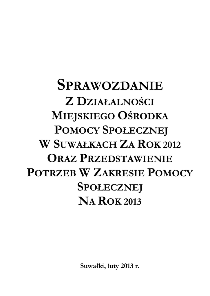 SPRAWOZDANIE Z DZIAŁALNOŚCI MIEJSKIEGO OŚRODKA POMOCY SPOŁECZNEJ W SUWAŁKACH ZA ROK 2012 ORAZ PRZEDSTAWIENIE POTRZEB W ZAKRESIE POMOCY SPOŁECZNEJ NA ROK 2013 Suwałki, luty 2013 r. SPRAWOZDANIE Z DZIAŁALNOŚCI MIEJSKIEGO OŚRODKA POMOCY SPOŁECZNEJ W SUWAŁKACH ZA 2012 ROK Zakres odpowiedzialności i działania Ośrodka wynika z przepisów ustawy o pomocy społecznej, ustawy o wspieraniu rodziny i systemie pieczy zastępczej, ustawy o rehabilitacji zawodowej i społecznej oraz zatrudnianiu osób niepełnosprawnych, ustawy o świadczeniach rodzinnych, ustawy o pomocy osobom uprawnionym do alimentów, ustawy o kombatantach oraz niektórych osobach będących ofiarami represji wojennych i okresu powojennego, ustawy o przeciwdziałaniu przemocy w rodzinie, ustawy o świadczeniach opieki zdrowotnej finansowanych ze środków publicznych oraz ustawy o promocji zatrudnienia i instytucjach rynku pracy. Jako bezpośredni realizator pomocy społecznej w Mieście Suwałki według stanu na 31 grudnia 2012 r. Ośrodek zatrudniał 159 osób, w tym: 1) 77 osoby finansowane w ramach dotacji celowej Wojewody Podlaskiego, 2) 75 osoby finansowane z budżetu samorządowego, 3) 7 osób z Europejskiego Funduszu Społecznego. Miejski Ośrodek Pomocy Społecznej w okresie sprawozdawczym realizował zadania pomocy wynikające z ustawy o pomocy społecznej i innych ustaw: 1. Należące do właściwości powiatu poprzez: 1) pełnienie funkcji organizatora pieczy zastępczej; 2) wspieranie rodzin zastępczych opieką koordynatora; 3) kierowanie dzieci do placówek opiekuńczo - wychowawczych; 4) pokrywanie kosztów utrzymania dzieci z terenu miasta umieszczonych w placówkach opiekuńczo-wychowawczych i w rodzinach zastępczych na terenie innych powiatów (obsługa merytoryczna zadania); 5) pomoc pieniężną z tytułu pokrywania kosztów utrzymania dzieci umieszczanych w rodzinach zastępczych; 6) pomoc pieniężną i w naturze usamodzielnianym wychowankom opuszczającym zastępcze formy opieki rodzinnej; 7) prowadzenie mieszkań chronionych; 8) wypłata wynagrodzeń zawodowym rodzinom zastępczym oraz kosztów utrzymania mieszkań; 9) rehabilitację społeczną i zawodową (środki PFRON). 2. Z zakresu administracji rządowej realizowanych przez powiat/gminę: 1) orzekanie o niepełnosprawności; 2 2) prowadzenie Środowiskowego Domu Samopomocy dla Osób Psychicznie Chorych i Niepełnosprawnych Intelektualnie. 3. Na szczeblu gminy z zakresu zadań zleconych: 1) ubezpieczenia zdrowotne osób pobierających świadczenia pielęgnacyjne; 2) specjalistyczne usługi opiekuńcze; 3) świadczenia rodzinne i pielęgnacyjne; 4) fundusz alimentacyjny oraz postępowanie wobec dłużników alimentacyjnych; 5) ustalanie prawa do świadczeń opieki zdrowotnej osób nieubezpieczonych. 4. Z zakresu zadań własnych gminy: 1) 2) 3) 4) wsparcie rodzin pomocą asystenta; zasiłki stałe; zasiłki i pomoc w naturze; gorące posiłki, w tym dożywianie dzieci i młodzieży - realizacja programu „Pomoc państwa w zakresie dożywiania”; 5) 6) 7) 8) 9) usługi opiekuńcze; schronienie (noclegownia); sprawienie pogrzebu; ubezpieczenia emerytalno - rentowe; ubezpieczenia zdrowotne osób pobierających zasiłki stałe; 10) kierowanie i odpłatność za pobyt mieszkańców miasta Suwałk w domach pomocy społecznej; 11) przewóz osób niepełnosprawnych. 5. Inne działania Ośrodka: 1) prowadzenie Miejskiego Centrum Interwencji Kryzysowej; 2) realizacja projektu „Od bierności do aktywności”, w ramach POKL 2007-2013; 3) prowadzenie grup korekcyjno - edukacyjnych dla sprawców przemocy w rodzinie w ramach Krajowego Programu Przeciwdziałania Przemocy w Rodzinie; 4) realizacja programu PFRON „Aktywny Samorząd”; 5) realizacja rządowego programu „Wspieranie pielęgnacyjne”; 6) organizacja prac społecznie użytecznych. osób pobierających świadczenia 6. Pozostała działalność związana z merytoryczną obsługą zadań oraz utrzymaniem budynków MOPS - rozdział 85219 Ośrodki pomocy społecznej - w 2012 r. wydatkowano łącznie 3.888.568 zł, w tym 42.553 zł z PFRON. 3 POMOC ŚRODOWISKOWA Świadczenia w ramach pomocy społecznej obejmują realizację zadań zleconych gminom zadań własnych gminy/ powiatu oraz zadań objętych programami rządowymi. Adresatami działań pomocy społecznej są osoby i rodziny z grup szczególnego ryzyka. Pomoc społeczna ma nie tylko wspierać rodzinę, ale także reagować na nowe sytuacje, w których się ona znalazła. Celem pomocy społecznej jest: 1) zaspokajanie uzasadnionych potrzeb życiowych osób i rodzin; 2) umożliwianie im bytowania w warunkach odpowiadających godności człowieka; 3) doprowadzanie w miarę możliwości do życiowego usamodzielniania się osób i rodzin oraz ich integracji ze środowiskiem. Praca Ośrodka Pomocy Społecznej ukierunkowana jest w szczególności na: 1) pomoc finansową; 2) pomoc rzeczową; 3) pomoc instytucjonalną; 4) pomoc w formie usług opiekuńczych; 5) pracę socjalną polegającą na aktywizowaniu i wzmacnianiu zdolności do wypełniania ról społecznych i zawodowych z wykorzystaniem instrumentów aktywnej integracji 6) wsparcie rodzin przeżywających trudności opiekuńczo - wychowawcze pomocą asystenta rodzin Miejski Ośrodek Pomocy Społecznej w Suwałkach zatrudniał 35 pracowników socjalnych do realizacji zadań gminy. Statystycznie na jednego pracownika przypada ok. 1.949 mieszkańców. Miasto podzielone jest na 25 rejonów opiekuńczych. W 2012 roku do Ośrodka wpłynęło 9.625 wniosków (wzrost o 377) o udzielenie pomocy w formie zasiłków stałych, gorących posiłków, zasiłków okresowych, zasiłków celowych, pomocy rzeczowej, usług opiekuńczych, umieszczenie w domu pomocy społecznej, skierowanie do ośrodków wsparcia oraz pomocy rodzinom zastępczym i usamodzielnianym wychowankom. Bezpośrednio świadczeniami pomocy objęto 2.883 środowisk rodzinnych (spadek o 593) liczących 7.375 osób. W 431 przypadkac