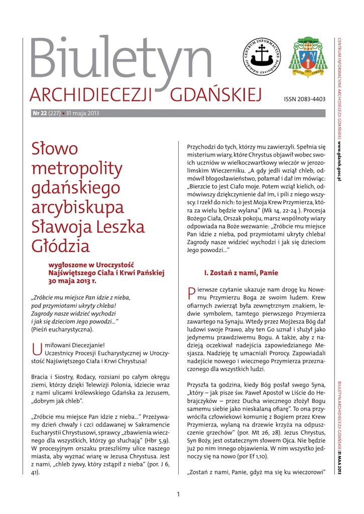 Nr 22 (227) • 31 maja 2013 Słowo metropolity gdańskiego arcybiskupa Sławoja Leszka Głódzia Przychodzi do tych, którzy mu zawierzyli. Spełnia się misterium wiary, które Chrystus objawił wobec swoich uczniów w wielkoczwartkowy wieczór w jerozolimskim Wieczerniku. „A gdy jedli wziął chleb, odmówił błogosławieństwo, połamał i dał im mówiąc: „Bierzcie to jest Ciało moje. Potem wziął kielich, odmówiwszy dziękczynienie dał im, i pili z niego wszyscy. I rzekł do nich: to jest Moja Krew Przymierza, która za wielu będzie wylana” (Mk 14, 22-24 ). Procesja Bożego Ciała, Orszak pokoju, marsz wspólnoty wiary odpowiada na Boże wezwanie: „Zróbcie mu miejsce Pan idzie z nieba, pod przymiotami ukryty chleba! Zagrody nasze widzieć wychodzi i jak się dzieciom Jego powodzi…” wygłoszone w Uroczystość Najświętszego Ciała i Krwi Pańskiej 30 maja 2013 r. Centrum Informacyjne Archidiecezji Gdańskiej www.gdansk.gosc.pl ISSN 2083-4403 I. Zostań z nami, Panie P ierwsze czytanie ukazuje nam drogę ku Nowemu Przymierzu Boga ze swoim ludem. Krew ofiarnych zwierząt była zewnętrznym znakiem, ledwie symbolem, tamtego pierwszego Przymierza zawartego na Synaju. Wtedy przez Mojżesza Bóg dał ludowi swoje Prawo, aby ten Go uznał i służył jako jedynemu prawdziwemu Bogu. A także, aby z nadzieją oczekiwał nadejścia zapowiedzianego Mesjasza. Nadzieję tę umacniali Prorocy. Zapowiadali nadejście nowego i wiecznego Przymierza przeznaczonego dla wszystkich ludzi. „Zróbcie mu miejsce Pan idzie z nieba, pod przymiotami ukryty chleba! Zagrody nasze widzieć wychodzi i jak się dzieciom Jego powodzi…” (Pieśń eucharystyczna). U miłowani Diecezjanie! Uczestnicy Procesji Eucharystycznej w Uroczystość Najświętszego Ciała i Krwi Chrystusa! Przyszła ta godzina, kiedy Bóg posłał swego Syna, „który – jak pisze św. Paweł Apostoł w Liście do Hebrajczyków – przez Ducha wiecznego złożył Bogu samemu siebie jako nieskalaną ofiarę”. To ona przywróciła człowiekowi komunię z Bogiem przez Krew Przymierza, wylaną na drzewie krzyża na odpuszczenie grzechów” (por. Mt 26, 28). Jezus Chrystus, Syn Boży, jest ostatecznym słowem Ojca. Nie będzie już po nim innego objawienia. W nim wszystko jednoczy się na nowo (por Ef 1,10). „Zróbcie mu miejsce Pan idzie z nieba…” Przeżywamy dzień chwały i czci oddawanej w Sakramencie Eucharystii Chrystusowi, sprawcy „zbawienia wiecznego dla wszystkich, którzy go słuchają” (Hbr 5,9). W procesyjnym orszaku przeszliśmy ulice naszego miasta, aby wyznać wiarę w Jezusa Chrystusa. Jest z nami, „chleb żywy, który zstąpił z nieba” (por. J 6, 41). „Zostań z nami, Panie, gdyż ma się ku wieczorowi” 1 Biuletyn Archidiecezji Gdańskiej31 maa 2013 Bracia i Siostry, Rodacy, rozsiani po całym okręgu ziemi, którzy dzięki Telewizji Polonia, idziecie wraz z nami ulicami królewskiego Gdańska za Jezusem, „dobrym jak chleb”. Biuletyn Archidiecezji Gdańskiej 31 maja 2013 Centrum Informacyjne Archidiecezji Gdańskiej www.gdansk.gosc.pl nr 22 (227) naukowców – wskazuje na to, że serce to cierpiało, ze ten, w którym to serce biło, był bity właśnie w okolicach klatki piersiowej. Chylimy głowy przed tymi zadziwiającymi zjawiskami, których ludzki umysł i wiedza wytłumaczyć nie może. Odkrywają i ujawniają rzeczywistość wiary – Jezusa obecnego w Najświętszym Sakramencie. (Łk 24, 29). To pragnienie, to zaproszenie wypowiedziane przez dwóch uczniów zdążających do Emaus, skierowane do Nieznajomego – zmartwychwstałego Pana rozpoznanego po łamaniu chleba – towarzyszyło apostołom i uczniom spotykającym zmartwychwstałego Chrystusa. Obchodząc „do niebieskiej Ojczyny”, do chwały Ojca, Jezus Chrystus nie zostawił nas sierotami. Pozostał w Eucharystii. Znaku Przymierza człowieka z Bogiem. To w niej, jak naucza nas Kościół: „są zawarte prawdziwie, rzeczywiście i substancjalnie Ciało i Krew wraz z duszą i Bóstwem Pana naszego Jezusa Chrystusa, a więc cały Chrystus” (Sobór Trydencki: Ds. 1651). Tę prawdę wiary przyjmujemy przez Boży autorytet Zbawiciela, który jest Prawdą. On nie kłamie! II. Tobie cześć i chwała nasz wieczny Panie U miłowani! Na czterech procesyjnych stacjach poprzez czytania rozważaliśmy istotę i znaczenie Eucharystii. Pierwsza z nich, miała miejsce na Długim Targu. W tej części naszego miasta, gdzie Bazylika Mariacka, ta wspaniała „korona miasta Gdańska” wzniesiona na chwałę Matki Zbawiciela i zdobny Dwór Artusa. Budowle te symbolizują i wskazują na to odwieczne połączenie wiary i pracy gdańskiej wspólnoty, tego rytmu, który wyznacza bieg dziejów naszego miasta. U miłowani! Drodzy Telewidzowie! Wraz z całym Kościołem przeżywamy Rok Wiary ogłoszony przez Ojca Świętego Benedykta XVI. Ma on stać się czasem naszego odnowienia. Otwarcia na Słowo Boże, na żywe rozumienie treści Objawienia, czynów i słów Chrystusa, w którym każdy z nas „złożył swoją wiarę”, na nauczania Kościoła. W Roku Wiary jest wiele okazji i możliwości, aby to czynić w naszych parafiach, w działających w nich wspólnotach, które dążą do pogłębienie naszej katolickiej formacji. Wiarę, jaką przekazuje nam Kościół – Nauczyciel Prawdy, trzeba nam umacniać modlitwą, poznawać sercem i rozumem, przekazywać innym. Mówił przed wiekami święty Augustyn: „wierzę, aby rozumieć i rozumiem, aby głębiej wierzyć”. O wiarę trzeba się modlić! Trzeba wołać: „Panie przymnóż naw wiary”! Wiarą trzeba żyć. Iść z nią przez życie. Jej blask rozświetla drogę chrześcijan. ….Nadaje jej sens, ład, piękno”. To tam, przy pierwszej stacji, nasze myśli kierowały się ku Eucharystii, Stanowi ona pamiątkę Paschy Chrystusa, jest także Ofiarą, która uobecnia Chrystusową ofiarę krzyża, poniesioną dla naszego zbawienia. Każda Msza św., w której jest obecn