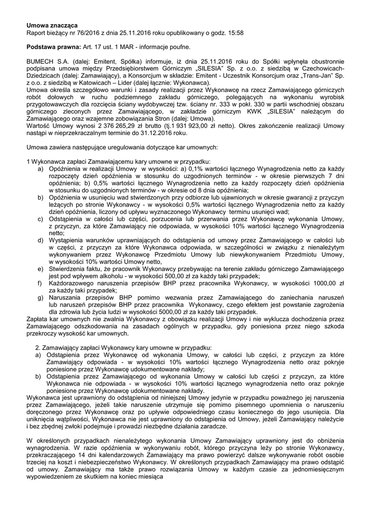 Umowa znacząca Raport bieżący nr 76/2016 z dnia 25.11.2016 roku opublikowany o godz. 15:58 Podstawa prawna: Art. 17 ust. 1 MAR - informacje poufne. BUMECH S.A. (dalej: Emitent, Spółka) informuje, iż dnia 25.11.2016 roku do Spółki wpłynęła obustronnie podpisana umowa między Przedsiębiorstwem Górniczym „SILESIA” Sp. z o.o. z siedzibą w CzechowicachDziedzicach (dalej: Zamawiający), a Konsorcjum w składzie: Emitent - Uczestnik Konsorcjum oraz „Trans-Jan” Sp. z o.o. z siedzibą w Katowicach – Lider (dalej łącznie: Wykonawca). Umowa określa szczegółowo warunki i zasady realizacji przez Wykonawcę na rzecz Zamawiającego górniczych robót dołowych w ruchu podziemnego zakładu górniczego, polegających na wykonaniu wyrobisk przygotowawczych dla rozcięcia ściany wydobywczej tzw. ściany nr. 333 w pokł. 330 w partii wschodniej obszaru górniczego zleconych przez Zamawiającego, w zakładzie górniczym KWK „SILESIA” należącym do Zamawiającego oraz wzajemne zobowiązania Stron (dalej: Umowa). Wartość Umowy wynosi 2 376 265,29 zł brutto (tj.1 931 923,00 zł netto). Okres zakończenie realizacji Umowy nastąpi w nieprzekraczalnym terminie do 31.12.2016 roku. Umowa zawiera następujące uregulowania dotyczące kar umownych: 1 Wykonawca zapłaci Zamawiającemu kary umowne w przypadku: a) Opóźnienia w realizacji Umowy w wysokości: a) 0,1% wartości łącznego Wynagrodzenia netto za każdy rozpoczęty dzień opóźnienia w stosunku do uzgodnionych terminów - w okresie pierwszych 7 dni opóźnienia; b) 0,5% wartości łącznego Wynagrodzenia netto za każdy rozpoczęty dzień opóźnienia w stosunku do uzgodnionych terminów - w okresie od 8 dnia opóźnienia; b) Opóźnienia w usunięciu wad stwierdzonych przy odbiorze lub ujawnionych w okresie gwarancji z przyczyn leżących po stronie Wykonawcy - w wysokości 0,5% wartości łącznego Wynagrodzenia netto za każdy dzień opóźnienia, liczony od upływu wyznaczonego Wykonawcy terminu usunięci wad; c) Odstąpienia w całości lub części, porzucenia lub przerwania przez Wykonawcę wykonania Umowy, z przyczyn, za które Zamawiający nie odpowiada, w wysokości 10% wartości łącznego Wynagrodzenia netto; d) Wystąpienia warunków uprawniających do odstąpienia od umowy przez Zamawiającego w całości lub w części, z przyczyn za które Wykonawca odpowiada, w szczególności w związku z nienależytym wykonywaniem przez Wykonawcę Przedmiotu Umowy lub niewykonywaniem Przedmiotu Umowy, w wysokości 10% wartości Umowy netto, e) Stwierdzenia faktu, że pracownik Wykonawcy przebywając na terenie zakładu górniczego Zamawiającego jest pod wpływem alkoholu - w wysokości 500,00 zł za każdy taki przypadek; f) Każdorazowego naruszenia przepisów BHP przez pracownika Wykonawcy, w wysokości 1000,00 zł za każdy taki przypadek; g) Naruszania przepisów BHP pomimo wezwania przez Zamawiającego do zaniechania naruszeń lub naruszeń przepisów BHP przez pracownika Wykonawcy, czego efektem jest powstanie zagrożenia dla zdrowia lub życia ludzi w wysokości 5000,00 zł za każdy taki przypadek. Zapłata kar umownych nie zwalnia Wykonawcy z obowiązku realizacji Umowy i nie wyklucza dochodzenia przez Zamawiającego odszkodowania na zasadach ogólnych w przypadku, gdy poniesiona przez niego szkoda przekroczy wysokość kar umownych. 2. Zamawiający zapłaci Wykonawcy kary umowne w przypadku: a) Odstąpienia przez Wykonawcę od wykonania Umowy, w całości lub części, z przyczyn za które Zamawiający odpowiada - w wysokości 10% wartości łącznego Wynagrodzenia netto oraz pokryje poniesione przez Wykonawcę udokumentowane nakłady; b) Odstąpienia przez Zamawiającego od wykonania Umowy w całości lub części z przyczyn, za które Wykonawca nie odpowiada - w wysokości 10% wartości łącznego wynagrodzenia netto oraz pokryje poniesione przez Wykonawcę udokumentowane nakłady. Wykonawca jest uprawniony do odstąpienia od niniejszej Umowy jedynie w przypadku poważnego jej naruszenia przez Zamawiającego, jeżeli takie naruszenie utrzymuje się pomimo pisemnego upomnienia o naruszeniu doręczonego przez Wykonawcę oraz po upływie odpowiedniego czasu koniecznego do jego usunięcia. Dla uniknięcia wątpliwości, Wykonawca nie jest uprawniony do odstąpienia od Umowy, jeżeli Zamawiający należycie i bez zbędnej zwłoki podejmuje i prowadzi niezbędne działania zaradcze. W określonych przypadkach nienależytego wykonania Umowy Zamawiający uprawniony jest do obniżenia wynagrodzenia. W razie opóźnienia w wykonywaniu robót, którego przyczyna leży po stronie Wykonawcy, przekraczającego 14 dni kalendarzowych Zamawiający ma prawo powierzyć dalsze wykonywanie robót osobie trzeciej na koszt i niebezpieczeństwo Wykonawcy. W określonych przypadkach Zamawiający ma prawo odstąpić od umowy. Zamawiający ma także prawo rozwiązania Umowy w każdym czasie za jednomiesięcznym wypowiedzeniem ze skutkiem na koniec miesiąca