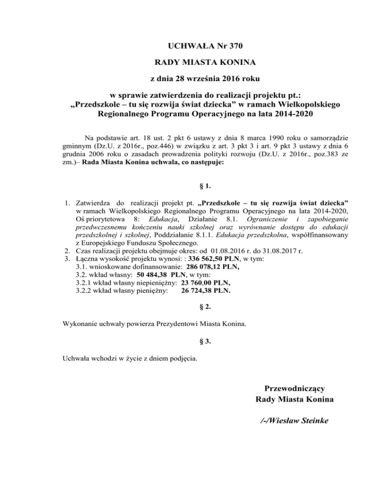 UCHWAŁA Nr 370 RADY MIASTA KONINA z dnia 28 września 2016 roku w sprawie zatwierdzenia do realizacji projektu pt.: „Przedszkole – tu się rozwija świat dziecka” w ramach Wielkopolskiego Regionalnego Programu Operacyjnego na lata 2014-2020 Na podstawie art. 18 ust. 2 pkt 6 ustawy z dnia 8 marca 1990 roku o samorządzie gminnym (Dz.U. z 2016r., poz.446) w związku z art. 3 pkt 3 i art. 9 pkt 3 ustawy z dnia 6 grudnia 2006 roku o zasadach prowadzenia polityki rozwoju (Dz.U. z 2016r., poz.383 ze zm.)– Rada Miasta Konina uchwala, co następuje: § 1. 1. Zatwierdza do realizacji projekt pt. „Przedszkole – tu się rozwija świat dziecka” w ramach Wielkopolskiego Regionalnego Programu Operacyjnego na lata 2014-2020, Oś priorytetowa 8: Edukacja, Działanie 8.1. Ograniczenie i zapobieganie przedwczesnemu kończeniu nauki szkolnej oraz wyrównanie dostępu do edukacji przedszkolnej i szkolnej, Poddziałanie 8.1.1. Edukacja przedszkolna, współfinansowany z Europejskiego Funduszu Społecznego. 2. Czas realizacji projektu obejmuje okres: od 01.08.2016 r. do 31.08.2017 r. 3. Łączna wysokość projektu wynosi: : 336 562,50 PLN, w tym: 3.1. wnioskowane dofinansowanie: 286 078,12 PLN, 3.2. wkład własny: 50 484,38 PLN, w tym: 3.2.1 wkład własny niepieniężny: 23 760,00 PLN, 3.2.2 wkład własny pieniężny: 26 724,38 PLN. § 2. Wykonanie uchwały powierza Prezydentowi Miasta Konina. § 3. Uchwała wchodzi w życie z dniem podjęcia. Przewodniczący Rady Miasta Konina /-/Wiesław Steinke Uzasadnienie do Uchwały Nr 370 Rady Miasta Konina z dnia 28 września 2016 roku Dyrektor Przedszkola nr 17 w Koninie Pani Renata Kasperowicz wystąpiła z wnioskiem o dofinansowanie projektu pn. „Przedszkole – tu się rozwija świat dziecka” (suma kontrolna zaakceptowanego wniosku:309cd14867195658, nr wniosku RPWP.08.01.0130.0074/16), który został zaakceptowany przez Komisję Oceny Projektów w Instytucji Zarządzającej Wielkopolskim Regionalnym Programem Operacyjnym 2014+, którą jest Urząd Marszałkowski Województwa Wielkopolskiego i otrzymał dofinansowanie w kwocie 286 078,12 zł. Całkowita wartość projektu wynosi 336 562,50 zł., z czego 50 484,38 zł. to wkład własny, w tym wkład własny niepieniężny w wysokości: 23 760,00 zł (wynajem sal dydaktycznych do prowadzenia zajęć) oraz wkład własny pieniężny w kwocie: 26 724,38 zł (wynagrodzenie nauczyciela mianowanego). Celem głównym projektu jest utworzenie do 31.08.2017 r. w Przedszkolu nr 17 „Wojtusiowa Izba” w Koninie 33 nowych miejsc wychowania przedszkolnego dla dzieci 3 i 4-letnich, w tym 1 dziecko z niepełnosprawnością, poprzez zatrudnienie 2 nauczycielek wychowania przedszkolnego oraz dostosowanie pomieszczeń lekcyjnych, sanitarnych, korytarzy i doposażenia kuchni oraz organizację placu zabaw do potrzeb realizacji nowoczesnej edukacji przedszkolnej. Przedmiotem projektu jest także podniesienie kwalifikacji nauczycieli do prowadzenia zajęć przedszkolnych. W ramach projektu przedszkole odnowi sale dydaktyczne, korytarz, szatnie, doposaży plac zabaw, zakupi meble, pomoce dydaktyczne, sprzęt audiowizualny, zatrudni 2 nauczycieli wychowania przedszkolnego, rozszerzy ofertę edukacyjną dla dzieci 3 i 4-letnich (zajęcia specjalistyczne, logopedyczne, j. angielski, zajęcia teatralne, taneczne, rewalidacyjne, gimnastyka korekcyjna). Wszystkie cele projektu są zgodne ze strategią Rozwoju Miasta Konina. Wobec powyższego podjęcie Uchwały Rady Miasta zatwierdzającej do realizacji projekt pt. „Przedszkole – tu się rozwija świat dziecka", współfinasowany z Europejskiego Funduszu Społecznego jest zasadne. Zastępca Prezydenta Miasta Konina /-/ Sławomir Lorek
