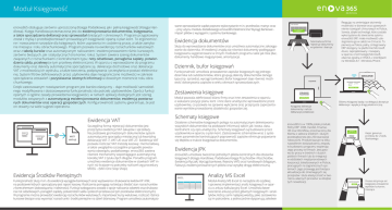 Moduł Księgowość enova365 obsługuje zarówno uproszczoną (Księga Podatkowa), jak i pełną księgowość (Księga Handlowa). Księga Handlowa przeznaczona jest do ewidencjonowania dokumentów, księgowania, a także sporządzania deklaracji oraz sprawozdań bieżących i okresowych. Program przygotowany został z myślą o przedsiębiorstwach prowadzących księgowość opartą o plan kont. To ergonomiczne i nowoczesne narzędzie dla księgowych, które usprawnia im codzienną pracę, a także zamykanie miesiąca i roku obrachunkowego. Program pozwala na ewidencję rozrachunków walutowych wraz z tabelą kursów oraz automatycznym naliczaniem i ewidencjonowaniem różnic kursowych, zarówno bieżących, jak i statystycznych (na koniec roku). System zawiera szereg dokumentów związanych z rozrachunkami z kontrahentami typu: noty odsetkowe, ponaglenia zapłaty, potwierdzenia salda, przelewy (w tym przelewy elektroniczne). W oparciu o wprowadzone do programu dokumenty oraz dekrety automatycznie sporządzane są deklaracje dochodowe oraz deklaracje VAT z możliwością ich wydruku, a także tworzenia, podpisywania i przesyłania w postaci elektronicznej. System filtrów definiowanych przez użytkownika daje nieograniczone możliwości w zakresie sporządzania zestawień i pozyskiwania istotnych informacji w dowolnym momencie roku obrachunkowego. Dzięki zastosowanym rozwiązaniom program jest bardzo elastyczny – daje możliwość samodzielnego modyfikowana i dostosowywania funkcjonalności do potrzeb użytkowników. Oprócz funkcji opartych o ogólne zasady prowadzenia księgowości, w ramach aplikacji dostępnych jest szereg modułów związanych z automatyzacją ewidencjonowania dokumentów, ewidencją powtarzanych dokumentów oraz operacji gospodarczych. Konfigurowalność systemu gwarantuje, że jest on otwarty na wiele sugestii operatora. Ewidencja VAT REJESTR VAT EWIDENCJA VAT VAT7 VAT-UE Szczególną formą rejestracji dokumentów jest przejrzysta ewidencja VAT zakupów i sprzedaży. Na podstawie gromadzonych dokumentów system automatycznie sporządza miesięczną lub kwartalną deklarację VAT-7, VAT-UE oraz VAT-27. Ewidencja VAT pozwala rozliczać VAT metodą kasową i memoriałową, a także uwzględnia szczególne przypadki powstawania obowiązku podatkowego. enova365 zawiera również mechanizmy wspomagające automatyczną korektę VAT z tytułu złych długów. Ponadto program umożliwia ewidencje dokumentów w stawkach VAT innych niż krajowe na potrzeby rozliczeń wg procedury MOSS – (Mini One Stop Shop). Ewidencja Środków Pieniężnych Funkcjonalność służy m.in. do ewidencji wyciągów bankowych oraz wystawiania i drukowania kwitów KP i KW, na podstawie których sporządzany jest raport kasowy. Rozliczenia pomagają na bieżąco śledzić stan rozrachunków z kontrahentami (zobowiązania i należności). Funkcja wzbogacona została o opcje naliczania odsetek oraz drukowania not odsetkowych, ponagleń zapłaty, potwierdzeń salda i poleceń przelewu (w tym przelewów elektronicznych). W programie można prowadzić ewidencję rozrachunków walutowych, importować kursy walutowe, rozliczać różnice kursowe bieżące oraz wyceniać rozrachunki i środki pieniężne na dzień bilansowy. Program umożliwia zautomatyzo- Reagując na zmieniające się trendy mobilności w biznesie oraz upowszechnienie rozwiązań chmurowych w Polsce, Soneta, dzięki technologii, która została wykorzystana do stworzenia sytemu enova365 ERP, miała możliwość udostępnienia go w całości w chmurze. To pierwszy w Polsce, pełny, zintegrowany ERP dostępny na platformie Microsoft Azure, zaprojektowany i rozwijany w oparciu o technologię Microsoft, obecnie zgodną z HTML5, z interfejsem na Windows 8.1 i Windows Phone. wane wprowadzanie zapłat poprzez wykorzystanie m.in. przelewów, matryc oraz – przy użyciu modułu dodatkowego enova365 Elektroniczne Wyciągi Bankowe import plików z wyciągami z systemu bankowego. Ewidencja dokumentów Służy do wprowadzania dokumentów oraz umożliwia automatyczne zaksięgowanie do dziennika. W ewidencji znajdą się również dokumenty podlegające księgowaniu wygenerowane w innych modułach programu takie jak lista płac, dokumenty handlowo-magazynowe, amortyzacja. Dziennik, bufor księgowań Funkcjonalność umożliwia prowadzenie zapisów księgowych wg jednego dziennika lub subdzienników, które grupują dekrety dokumentów danego typu (np. sprzedaż, wyciągi bankowe). Bufor księgowań daje również możliwość dokonywania zapisów w wielu okresach sprawozdawczych. SZKOLENIE DEKLARACJE PODATKOWE PIERWSZA TRZECIA DRUGA Zestawienia księgowe Moduł pozwala zdefiniować bilans firmy oraz inne zestawienia w oparciu o wskazane pozycje planu kont i inne dane analityczne wprowadzone przez użytkownika, co pozwala na sprawne wyliczenie oraz przejrzyste zaprezentowanie wyników prowadzonej działalności gospodarczej. Schematy księgowe Działanie schematów księgowych polega na automatycznym dekretowaniu wszystkich dokumentów na podstawie informacji takich jak: kwota, data, kontrahent czy opis analityczny. Schematy księgowań są budowane przez użytkownika w oparciu o plan kont. Zastosowanie schematów wraz z systemem parametrów kontrolujących poprawność zapisów eliminuje pojawianie się błędów w trakcie księgowania dokumentów. Ewidencja JPK enova365 umożliwia tworzenie jednolitych plików kontrolnych dla obszarów księgowych (Księga Handlowa, Podatkowa Księga Przychodów i Rozchodów, Ewidencja Ryczałt, Wyciągi bankowe, Rejestry VAT) oraz handlowych (Magazyn, Faktury), ewidencjonowanie tych plików oraz wysyłkę drogą elektroniczną. EXCEL Analizy MS Excel Moduł Analizy MS Excel to narzędzie do szybkiej i sprawnej implementacji analiz księgowych w oparciu o arkusz kalkulacyjny Excel. Umożliwia łatwe tworzenie arkuszy przez głównych księgowych i analityków, którzy sami najlepiej wiedzą, jakie zestawieni
