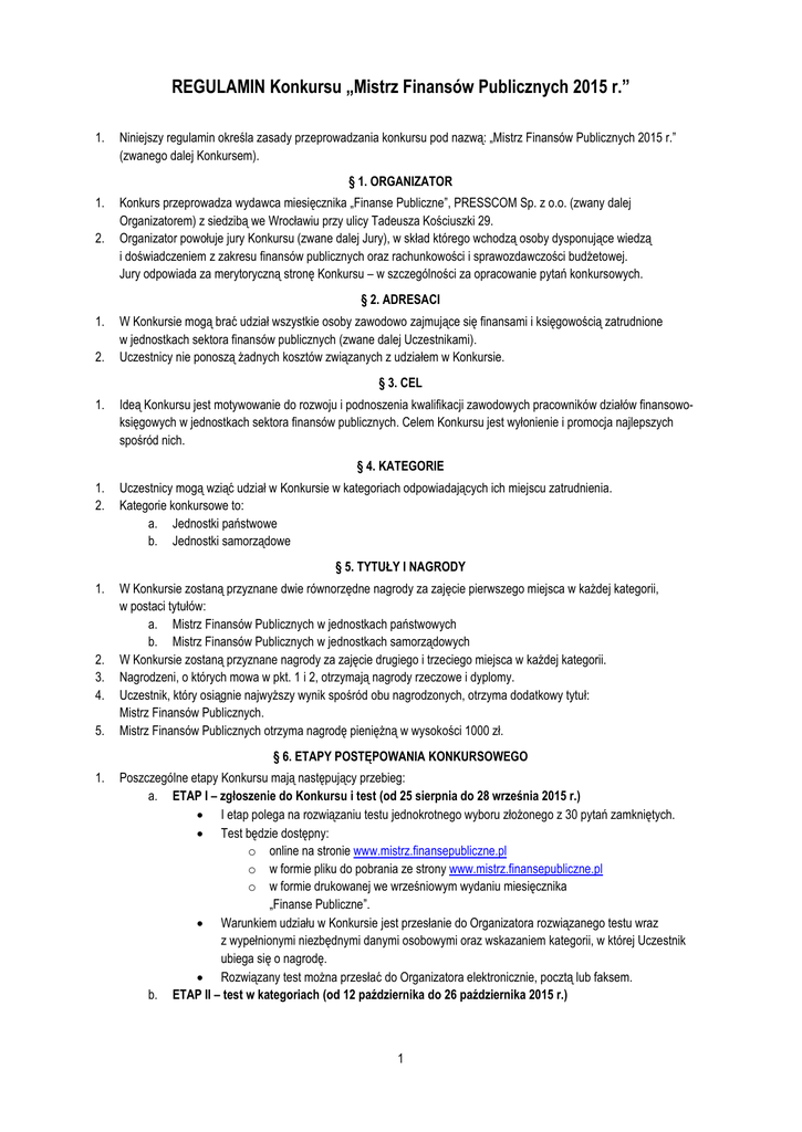 REGULAMIN Konkursu „Mistrz Finansów Publicznych 2015 r.”