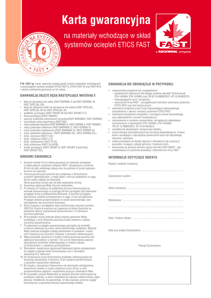 Karta gwarancyjna na materiały wchodzące w skład systemów ociepleń ETICS FAST P.W. FAST sp. z o.o. zapewnia wysoką jakość swoich materiałów wchodzących w poszczególne systemy ociepleń ETICS FAST S, ETICS FAST W oraz FAST W-G i udziela wydłużonej gwarancji na ich zakup. GWARANCJA NIE OBOWIĄZUJE W PRZYPADKU: · GWARANCJĄ OBJĘTE BĘDĄ NASTĘPUJĄCE MATERIAŁY: · · · · · · · · · · · · · · · kleje do styropianu lub wełny (FAST NORMAL S lub FAST NORMAL W, FAST SPECJAL DS) kleje do zatapiania siatki na styropianie lub wełnie (FAST SPECJAL, FAST SPECJAL M lub FAST SPECJAL W) podkłady gruntujące (FAST GRUNT M lub FAST GRUNT S-T) farba gruntująca (FAST KWARC) zaprawy tynkarskie polimerowo-mineralne(FAST BARANEK, FAST KORNIK) cementowa masa szpachlowa (FAST MS) masy tynkarskie akrylowe (FAST BARANEK A, FAST KORNIK A, FAST GRANIT) masy tynkarskie silikatowe (FAST BARANEK S, FAST KORNIK S) masy tynkarskie siloksanowe (FAST BARANEK SI, FAST KORNIK SI) masy tynkarskie silikonowe (FAST BARANEK SIL, FAST KORNIK SIL) farby akrylowe (FAST F-AZ) farby silikatowe (FAST F-S) farby siloksanowe (FAST SI-SI) farby silikonowe (FAST SILIKON) środki gruntujące (FAST GRUNT G, FAST GRUNT S pod farby, FAST GRUNT SIL) · · · · · · · wykonywania ocieplenia bez uwzględnienia: - postanowień właściwych dla danego systemu Aprobat Technicznych ETA-14/0464, ETA-14/0465 oraz ITB AT-15-8869/2012 i AT-15-9146/2013 - obowiązujących norm i przepisów, - wytycznych firmy FAST - szczegółowych instrukcji wykonania systemów ETICS FAST oraz kart technicznych, wykonania ocieplenia przez firmy nieposiadające odpowiedniego przeszkolenia z zakresu realizacji systemów ETICS FAST, wykonania docieplenia niezgodnie z wymogami prawa budowlanego oraz odpowiednimi normami budowlanymi, zastosowanie w systemie zamienników, nie będących składnikami wymienionymi w aprobatach ETA-14/0464, ETA-14/0465, ITB AT-15-8869/2012, AT-15-9146/2013 niewłaściwej eksploatacji i konserwacji obiektu, zmian elewacji spowodowanych jej normalną eksploatacją np. zmiana koloru wynikająca z zabrudzenia powierzchni ścian lub naturalnego starzenia, płowienia, szkód powstałych na skutek zdarzeń o charakterze siły wyższej tj. powodzie, huragany, szkody górnicze, trzęsienia ziemi. stosowania na elewacji kolorów spoza wzornika FAST BASIC - bez wcześniejszej ich pisemnej akceptacji z laboratorium firmy FAST WARUNKI GWARANCJI INFORMACJE DOTYCZĄCE OBIEKTU 1. Gwarant udziela 10-cio letniej gwarancji na materiały wchodzące w skład pełnych systemów ociepleń FAST i wbudowane w terminie 45 dni od daty ostatniego zakupu lecz nie później niż przed upływem terminu ich ważności. 2. Umowa gwarancyjna powinna być podpisana u Dystrybutora w dwóch egzemplarzach, z czego jeden z nich po podpisaniu w ciągu 30 dni należy odesłać do Gwaranta. Okres gwarancji liczony jest od daty podpisania umowy. 3. Gwarancja obejmuje Wady fizyczne materiałów. 4. Po okresie 24 miesięcy od podpisania Umowy Gwarancyjnej na wniosek Uprawnionego w przeciągu 60 dni wymagane jest dokonanie przeglądu przez przedstawiciela Gwaranta. O terminie przeglądu Uprawniony zostanie powiadomiony w ciągu 14 dni od zgłoszenia. Przegląd zostanie przeprowadzony na koszt Uprawnionego i jest obowiązkowy dla utrzymania Gwarancji. 5. Koszt związany z przeglądem stanu technicznego elewacji wyniesie 200 PLN. Kwota ta powinna być wpłacona na konto Gwaranta na podstawie faktury wystawionej Uprawnionemu z 14 dniowym terminem płatności. 6. W przypadku wizyty podczas której zostaną ujawnione Wady wynikające z winy Gwaranta powyższa kwota zostanie w całości zwrócona Uprawnionemu. 7. Po dokonaniu przeglądu gwarancyjnego sporządza się protokół, w którym dokonuje się oceny stanu technicznego ocieplenia. Wykryte Wady podczas przeglądu zostają odnotowane w protokole i wobec nich rozpoczną się czynności związane z procesem reklamacyjnym. 8. Wady pozostałe ujawnione w trakcie trwania gwarancji powinny być zgłaszane Gwarantowi w okresie 7 dni od ich stwierdzenia poprzez sporządzenie protokołu reklamacyjnego w miejscu zakupu (u Dystrybutora ) i odesłanie go Gwarantowi. 9. Warunkiem rozpatrzenia zgłoszonej Reklamacji będzie udostępnienie do wglądu oryginału Karty Gwarancyjnej wraz z dowodami zakupowymi tj. fakturami. 10. Po dostarczeniu przez Dystrybutora protokołu reklamacyjnego do Gwaranta Uprawniony w terminie 14 dni zastanie poinformowany o sposobie rozpatrzenia reklamacji. 11. W związku z powyższym Uprawniony ma obowiązek udostępnienia Gwarantowi obiektu w czasie ustalonym przez strony w celu przeprowadzenia oględzin i wyjaśnienia przyczyn zaistniałych Wad. 12. W przypadku uznania Reklamacji za zasadną Gwarant zobowiązuje się przekazać materiały, w ilości niezbędnej do naprawy reklamowanej części elewacji. Dodatkowo nie gwarantuje, że taka naprawa utrzyma wygląd kolorystyczny oryginalnej elewacji naprawianego obiektu. Rodzaj i wielkość inwestycji: ................................................................................................................. Zastosowany system: ................................................................................................................. Adres Inwestycji: ..................................................................................... ................................................................................................................. Wykonawca : ........................................................................................... ................................................................................................................. ................................................................................................................. Data i miejsce zakupu: ............................................................................ Data oraz podpis Dystrybutora: ................................