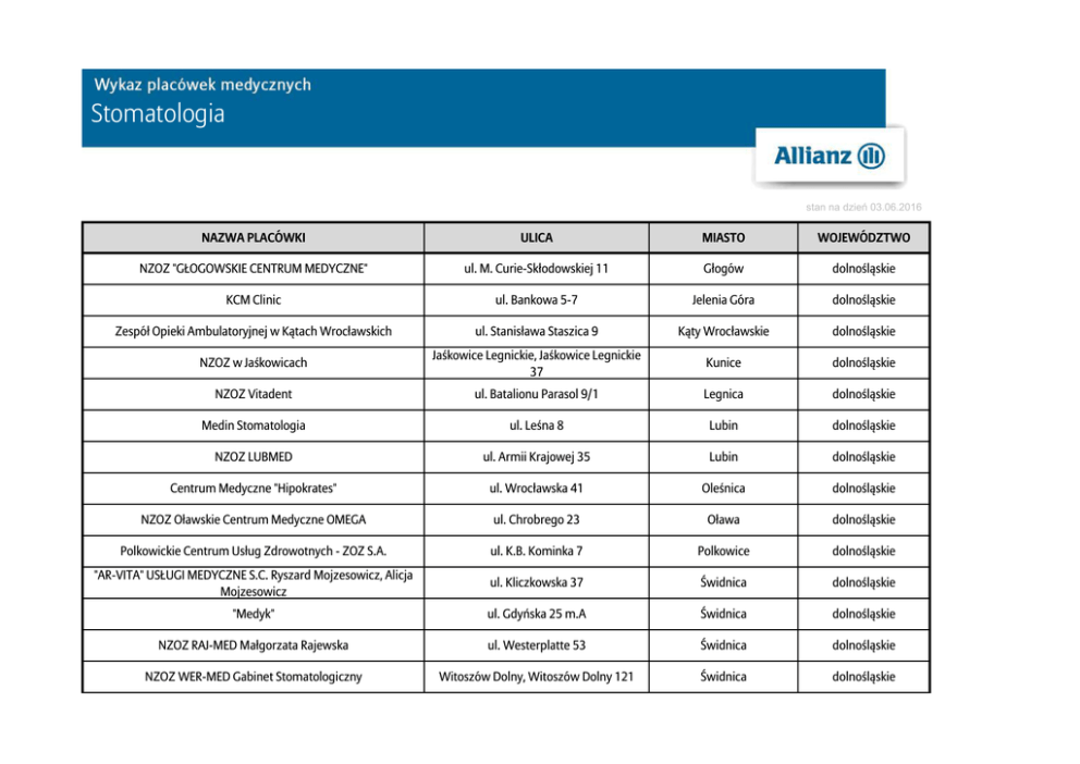 Stomatologia Medycyna Pracy stan na dzień 03.06.2016 NAZWA PLACÓWKI ULICA MIASTO WOJEWÓDZTWO NZOZ "GŁOGOWSKIE CENTRUM MEDYCZNE" ul. M. Curie-Skłodowskiej 11 Głogów dolnośląskie KCM Clinic ul. Bankowa 5-7 Jelenia Góra dolnośląskie Zespół Opieki Ambulatoryjnej w Kątach Wrocławskich ul. Stanisława Staszica 9 Kąty Wrocławskie dolnośląskie NZOZ w Jaśkowicach Jaśkowice Legnickie, Jaśkowice Legnickie 37 Kunice dolnośląskie NZOZ Vitadent ul. Batalionu Parasol 9/1 Legnica dolnośląskie Medin Stomatologia ul. Leśna 8 Lubin dolnośląskie NZOZ LUBMED ul. Armii Krajowej 35 Lubin dolnośląskie Centrum Medyczne "Hipokrates" ul. Wrocławska 41 Oleśnica dolnośląskie NZOZ Oławskie Centrum Medyczne OMEGA ul. Chrobrego 23 Oława dolnośląskie Polkowickie Centrum Usług Zdrowotnych - ZOZ S.A. ul. K.B. Kominka 7 Polkowice dolnośląskie "AR-VITA" USŁUGI MEDYCZNE S.C. Ryszard Mojzesowicz, Alicja Mojzesowicz ul. Kliczkowska 37 Świdnica dolnośląskie "Medyk" ul. Gdyńska 25 m.A Świdnica dolnośląskie NZOZ RAJ-MED Małgorzata Rajewska ul. Westerplatte 53 Świdnica dolnośląskie NZOZ WER-MED Gabinet Stomatologiczny Witoszów Dolny, Witoszów Dolny 121 Świdnica dolnośląskie NZOZ "Przychodnia Piaskowa Góra" sp. z o.o. ul. Główna 4 Wałbrzych dolnośląskie Ośrodek Diagnostyczno-Leczniczy przy Górniczej Fundacji Ochrony Zdrowia ul. Jana Matejki 5A Wałbrzych dolnośląskie Przychodnia Specjalistyczna Regina i Walenty Śliwa ul. Uczniowska 21 Wałbrzych dolnośląskie ARTIDENT Klinika Stomatologii Estetycznej i Ortodoncji ul. Kard. Stefana Wyszyńskiego 144C-146A Wrocław dolnośląskie Centrum Medyczne ESTOMEDICA ul. Słowiańska 27B Wrocław dolnośląskie Centrum Medyczne Medrun (Scanmed Multimedis) ul. Zygmunta Krasińskiego 9 Wrocław dolnośląskie Centrum Medyczne Polmed ul. Grabiszyńska 208 Wrocław dolnośląskie Centrum Medyczne "Zdrowa Kobieta" ul. Kamiennogórska 10 Wrocław dolnośląskie Dental Salon ul. Mjr. Eugeniusza Horbaczewskiego 53A Wrocław dolnośląskie DENTALCITY Gabinet Dentystyczny ul. Wietrzna 18/1B Wrocław dolnośląskie EMC Instytut Medyczny S.A. ul. Pilczycka 144-148 Wrocław dolnośląskie EMC Instytut Medyczny S.A. Przychodnia przy Łowieckiej ul. Łowiecka 24 Wrocław dolnośląskie HIH Prywatna Przychodnia_STOMATOLOGIA ul. Sokolnicza 5/27 Wrocław dolnośląskie Klinika Medyczna LUX MED ul. Kwidzyńska 6 Wrocław dolnośląskie Klinika Medyczna LUX MED ul. Legnicka 51/53 Wrocław dolnośląskie Klinika Medyczna LUX MED ul. Swobodna 3 Wrocław dolnośląskie X-Med ul. Tadeusza Zielińskiego 41C Wrocław dolnośląskie " SANITAS" Lekarze Specjaliści ul. Gen. Franciszka Kleeberga 3 Bydgoszcz kujawsko-pomorskie Centrum Medyczne Gizińscy ul. Leśna 9 Bydgoszcz kujawsko-pomorskie EKODENT CLINIC Elżbieta Kowal ul. Sabały 4 Bydgoszcz kujawsko-pomorskie Gabinet Stomatologiczny Joanna Matczak Józefowska ul. Wojska Polskiego 19A Bydgoszcz kujawsko-pomorskie Grupowa Praktyka Stomatologiczna MARDENT E.B. Cenker ul. Karolewska 15/19 Bydgoszcz kujawsko-pomorskie NZOZ AWIMED sp. z o.o. ul. Gen. Józefa Hallera 2C Bydgoszcz kujawsko-pomorskie Polskie Centra Stomatologiczne ul. Gdańska 125 Bydgoszcz kujawsko-pomorskie Polskie Centra Stomatologiczne ul. Dworcowa 2/1 Bydgoszcz kujawsko-pomorskie Polskie Centra Stomatologiczne ul. Igrzyskowa 1 Bydgoszcz kujawsko-pomorskie Polskie Centra Stomatologiczne ul. Kijowska 90 Bydgoszcz kujawsko-pomorskie Polskie Centra Stomatologiczne ul. Bohaterów Kragujewca 11 Bydgoszcz kujawsko-pomorskie Polskie Centra Stomatologiczne ul. Lawinowa PAW. 7 Bydgoszcz kujawsko-pomorskie Promedica GP ul. Ewy Szelburg-Zarembiny 19 Bydgoszcz kujawsko-pomorskie Przychodnia ROMET sp. z o.o. ul. Fordońska 246 Bydgoszcz kujawsko-pomorskie Remedium Clinic ul. Gdańska 80A Bydgoszcz kujawsko-pomorskie "SANITAS" Lekarze Specjaliści ul. Karola Libelta 2 Bydgoszcz kujawsko-pomorskie "SANITAS" Lekarze Specjaliści ul. Wojska Polskiego 23 Bydgoszcz kujawsko-pomorskie "Sanitas" Lekarze Specjaliści ul. Dworcowa 110 Bydgoszcz kujawsko-pomorskie STO-MED ul. Grunwaldzka 1-3 Bydgoszcz kujawsko-pomorskie Wojskowa Specjalistyczna Przychodnia Lekarska Samodzielny Publiczny ZOZ ul. Legionów 57 Grudziądz kujawsko-pomorskie Spółdzielnia Pracy Lekarzy Specjalistów "SANITAS" ul. Dubienka 3 Inowrocław kujawsko-pomorskie CIVIS VITA Centrum Medyczne ul. Warszawska 20 Toruń kujawsko-pomorskie Dental Republik ul. Zbożowa 47A Toruń kujawsko-pomorskie Klinika Dentaurus ul. Kozacka 17 Toruń kujawsko-pomorskie Lecznice Citomed-Przychodnia nr.1 ul. Marii Skłodowskiej-Curie 73 Toruń kujawsko-pomorskie Gabinet Stomatologiczny Lekarz Stomatologii Małgorzata Dura ul. Wiejska 18A/8 Włocławek kujawsko-pomorskie Centrum Medyczne Luxmed Pl. Kupiecki 12 Chełm lubelskie Centrum Medyczne Luxmed ul. Koncertowa 4D Lublin lubelskie Centrum Medyczne Luxmed ul. Królewska 11 Lublin lubelskie Centrum Medyczne Luxmed ul. Radziwiłłowska 5 Lublin lubelskie Centrum Medyczne Luxmed ul. Zwycięska 6A Lublin lubelskie Centrum Medyczne SANITAS Sp. z o.o. ul. Jana Hempla 5 Lublin lubelskie Żagiel MED Przychodnia Zana ul. Tomasza Zana 32A Lublin lubelskie LUXMED-UZDROWISKO NAŁĘCZÓW ul. Al. Kasztanowa 6 Nałęczów lubelskie LUXMED-UZDROWISKO NAŁĘCZÓW Filia nr 2 ul. Lubelska 3 Poniatowa lubelskie Centrum Medyczne Internus_Przychodnia nr 1 Al. Królewska 15 Puławy lubelskie Niepubliczny Zakład Opieki Zdrowotnej "Resort - Med" Joanna Śmiałko, Wojciech Śmiałko sp.j. ul. Prymasa Stefana Wyszyńskiego 2 Zamość lubelskie ALDEMED Centrum Medyczne Al. Niepodległości 1 Zielona Góra lubuskie ALDEMED Centrum Medyczne Filia Zastal ul. Towarowa 20 Zielona Góra lubuskie KA-MED ul. Marii Skłodowskiej-Curie 3 Aleksandrów Łódzki łódzkie Przychodnia Stomatologiczna AESTHETIC DENTAL, Emilia Bartczak ul. Energetyków 10 Bełchatów łódzkie NZOZ "LECZNICA" ul. Staszica 11 Kutno łódzkie NZOZ MEDYK ul. Grunwaldzka 2 Kutno łódzkie Klinika Medyczna LUX MED ul. 
