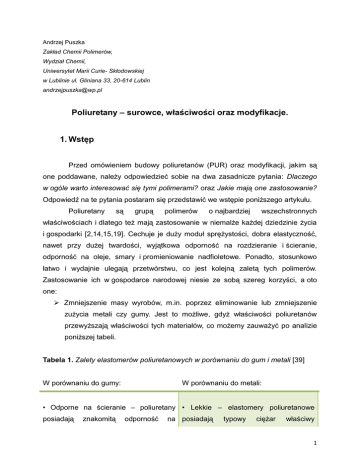 Andrzej Puszka Zakład Chemii Polimerów, Wydział Chemii, Uniwersytet Marii Curie- Skłodowskiej w Lublinie ul. Gliniana 33, 20-614 Lublin [email protected] Poliuretany – surowce, właściwości oraz modyfikacje. 1. Wstęp Przed omówieniem budowy poliuretanów (PUR) oraz modyfikacji, jakim są one poddawane, należy odpowiedzieć sobie na dwa zasadnicze pytania: Dlaczego w ogóle warto interesować się tymi polimerami? oraz Jakie mają one zastosowanie? Odpowiedź na te pytania postaram się przedstawić we wstępie poniższego artykułu. Poliuretany są grupą polimerów o najbardziej wszechstronnych właściwościach i dlatego też mają zastosowanie w niemalże każdej dziedzinie życia i gospodarki [2,14,15,19]. Cechuje je duży moduł sprężystości, dobra elastyczność, nawet przy dużej twardości, wyjątkowa odporność na rozdzieranie i ścieranie, odporność na oleje, smary i promieniowanie nadfioletowe. Ponadto, stosunkowo łatwo i wydajnie ulegają przetwórstwu, co jest kolejną zaletą tych polimerów. Zastosowanie ich w gospodarce narodowej niesie ze sobą szereg korzyści, a oto one: Zmniejszenie masy wyrobów, m.in. poprzez eliminowanie lub zmniejszenie zużycia metali czy gumy. Jest to możliwe, gdyż właściwości poliuretanów przewyższają właściwości tych materiałów, co możemy zauważyć po analizie poniższej tabeli. Tabela 1. Zalety elastomerów poliuretanowych w porównaniu do gum i metali [39] W porównaniu do gumy: W porównaniu do metali: • Odporne na ścieranie – poliuretany • Lekkie – elastomery poliuretanowe posiadają znakomitą odporność na posiadają typowy ciężar właściwy 1 ścieranie, szczególnie w zastosowaniach pomiędzy 0-1,2. mokrych. • Odporne na zużycie – wysokiej jakości • Wysoka nośność – wysoko elastomery poliuretanowe posiadają przetworzone elastomery poliuretanowe znacznie lepszą odporność na ścieranie posiadają zdolność przeciwstawiania się niż stal. dużym obciążeniom dynamicznym. • Odporne na korozję – poza pewnym • Odporne na poliuretanowe ozon nie – są elastomery stopniem przebarwienia w świetle UV, podatne na poliuretany są niezwykle odporny na działanie ozonu. warunki atmosferyczne. • Możliwość pigmentowania – większość • Niskie koszty wytwarzania – ciekłe poliuretanów ma naturalnie blady kolor poliuretany i jest półprzeźroczysta, odpowiednimi do co czyni mogą być przetwarzane je w stosunkowo tanich urządzeniach. pigmentowania w szerokiej gamie kolorów. • Przetwarzanie ciekłe – systemy ciekłych poliuretanów można wtryskiwać w urządzenia natryskiwać temperaturach stosunkowo lub tanie, wylewać otoczenia lub przy przy temperaturach względnie niskich. Kolejnym argumentem przemawiającym na korzyść poliuretanów jest zmniejszenie energochłonności przetwórstwa oraz zwiększenie wydajności i stopnia uprzemysłowienia produkcji dzięki ich zastosowaniu, a co za tym idzie oszczędzania naturalnych zasobów Ziemi [45]. Poniższy diagram obrazuje ilość energii zaoszczędzonej w europejskich gospodarstwach domowych dzięki stosowaniu poliuretanów [46]. 2 kWh/dobę 1,8 1,5 0,9 0,5 kWh/rok 670 550 330 165 Euro/rok 100 82 46 25 Rysunek 1. Porównanie zużycie energii podczas zastosowania poliuretanów między 1990, a 2005 rokiem Uzyskanie wyrobów o doskonałej charakterystyce eksploatacyjnej, trudnych do wyprodukowania w inny sposób to kolejna zaleta poliuretanów. Doskonałym przykładem mogą tu być poliuretanowe podeszwy obuwnicze, charakteryzujące się znakomitymi właściwościami mechanicznymi w długim okresie, co obrazuje następujący wykres: Rysunek 2. Porównanie trwałości właściwej materiałów podeszew obuwniczych [45] 3 Ostatnim argumentem, jaki chciałam przedstawić jest komfort i bezpieczeństwo jakie dają nam wyroby poliuretanowe – od poczucia relaksu, jakie zapewniają pianki zastosowane do produkcji mebli i łóżek, do izolacji, która pozwala uzyskać odpowiednią temperaturę w pomieszczeniu [40,41,42,47]. Dlatego wzrasta nasze – konsumentów, zaufanie do tej grupy polimerów i sięgamy po nie coraz częściej. Obrazują to grafy: Azja Europa Rysunek 3. Struktura zużycia PUR w Azji i Europie w 2005r. [43] Powyższe korzyści z zastosowania poliuretanów podsumuję następującym wykresem: Rysunek 4. Regionalna struktura popytu na poliuretany w 2005r. [43, 44] Zużycie poliuretanów na europejskim rynku łącznie z rynkiem Środkowego Wschodu i Afryki wyniosło za 2005 rok 4,7 miliona ton. Był to wzrost o blisko 3,9 % większy niż 4 w roku 2004 [44]. Rosnąca produkcja i zużycie poliuretanów niesie ze sobą jeden, ale dość poważny problem – odpady. W obliczu dużego zanieczyszczenia środowiska oraz ograniczonych ilości surowców chemicznych i rosnących ich cen, recykling tych tworzyw nabiera szczególnie dużego znaczenia [13]. Dlatego też – równolegle z opracowywaniem technologii nowych materiałów poliuretanowych – jest konieczne zaproponowanie wystarczająco efektywnych metod utylizacji odpadów [12]. Obecnie badania trwają nad udoskonalaniem następujących metod recyklingu tych polimerów: dekompozycja prowadząca do powstania surowca lub surowców bezpośrednio przydatnych do otrzymywania poliuretanów; głęboka przeróbka chemiczna, w której wyniku uzyskuje się surowce petrochemiczne. Do pierwszej grupy, która wydaje się najbardziej obiecująca, zalicza się hydrolizę, aminolizę, fenolizę i glikolizę. Produktami mogą być, np.: poliole użyte do produkcji poliuretanów oraz diaminy będące pochodnymi wykorzystywanych diizocyjanianów. Druga grupa obejmuje zaś zgazowanie, pirolizę oraz uwodornienie. Stosuje się je np.: do otrzymywania gazu syntezowego, węglowodorów bądź paliw [13]. 2. Poliuretany liniowe Poliuretany powstają w wyniku polireakcji wielofunkcyjnych organicznych izocyjanianów z dwu lub więcej funkcyjnymi związkami zawierającymi grupy hydroks