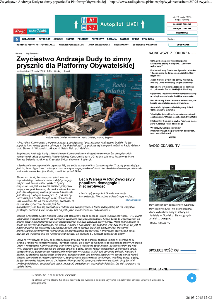 Zwycięstwo Andrzeja Dudy to zimny prysznic dla Platformy Obywatelskiej https://www.radiogdansk.pl/index.php/wydarzenia/item/25095-zwycie... wt, 26 maja 2015r. Filipa, Pauliny SŁUCHAJ ON-LINE OGLĄDAJ ON-LINE SKOMENTUJ WYDAR ZENIA WYDA RZENIA AUTOPILOT A AUDYCJE UDYCJE RODZINNY RODZINNY FESTYN FESTYN RG RG -- FOTORELACJA FOTORELACJA Home MUZYK A POLECAMY POLECAMY ANDRZEJ ANDRZEJ PONIEDZIELSK PONIEDZIELSKI I PATRONATY PATRONATY R REK LAMA LAMA ANNA ANNA DER ESZOWSK ESZOWSKA A GA GALER LERIE PROLETARYAT SPORT STYL STYL ŻYCIA ŻYCIA LOGOWANIE CO CO NOWEGO NOWEGO W KINA CH? CH? NAJNOWSZE Z POMORZA Wydarzenia Zwycięstwo Andrzeja Dudy to zimny prysznic dla Platformy Obywatelskiej poniedziałek, 25 maja 2015 15:29 Drukuj Email Schną drzewa po re witalizacji parku Klasztorne Stawy w Słupsku. "Zawiodło wykonanie " Konie c reformy Gowina w Bytowie i Miastku. 1 lipca zaczną tu działać samodzie lnie Sądy Rejonowe Jace k Kurski: Być m oże gdyby nie Kukiz, Andrzej Duda nie m iałby te j pre zydentury Będą korki w Słupsku. Zaczy na sie rem ont skrzy żowania Szcze cińskie j i Sobie skiego Opie kunka i ratownik WOPR usły szeli zarzuty w zw iązku ze śm ie rcią 8-latki w aquaparku Mozaika Anny Fisze r zostanie zniszczona, ale bę dzie upamiętniona prze z inwestora Samochód by łe go sze fa de le gatury CBA i CBŚ spłonął w Gdańsku "Jest tylko je dna i kocha nas niezależnie od okoliczności." Młodzi o obchodach Dnia Matki Inteligentny hum or i muzy ka. Prom ocja nowe j płyty Andrze ja Ponie dzie lskie go Wy korzy sty wali pracowników interwe ncy jnych na pry watnych budow ach, teraz zostali skazani WIĘCEJ Goście Radia Gdańsk w studiu fot. Radio Gdańsk/Andrzej Stępień - Prezydent Komorowski z ogromną kulturą podziękował i pogratulował Andrzejowi Dudzie. To jest zupełnie inny rodzaj języka od tego, który doświadczyliśmy podczas tej kampanii, mówił w Radiu Gdańsk prof. Sławomir Witkowski z Akademii Sztuk Pięknych Gdańsk. RADIO GDAŃSK TV Zwycięstwo Andrzeja Dudy z Bronisławem Komorowskim w drugiej turze wyborów prezydenckich komentował także pracownik Akademickiego Centrum Kultury UG, radny dzielnicy Przymorze Małe Tomasz Dziemianczuk oraz Krzysztof Skiba, showman i satyryk. - Społeczeństwo zapomniało czym był PiS, ale sobie przypomni i to bardzo szybko. Troszkę przerażające jest to, że w ciągu trzech miesięcy można w tym kraju przekonać ludzi do człowieka nieznanego. No bo do końca nie wiemy kim jest Duda, mówił Krzysztof Skiba. Showman dodał, że nowy prezydent nie ma Lech Wałęsa w RG: Zwyciężyły odpowiedniego doświadczenia. - Gdyby na jego miejscu był Jarosław Kaczyński to byłoby populizm, demagogia i oczywiste - to jest wieloletni działacz polityczny niecierpliwość mający swoje dokonania, dorobek i wiemy kim on jest. Na taką osobę można głosować lub nie, ale - Jest rząd, prezydent i każdy ma swoje jest idealną osobą na to miejsce. [...] A kim był kompetencje. Nie można obiecać tego, co jes... wcześniej pan Duda? Europosłem i działaczem CZYTAJ WIĘCEJ Unii Wolności. Ale on ma tę energię, świeżość, to co uwiodło wyborców. Pewnie jest też sympatyczny, bo tak się prezentuje i rodzinę ma sympatyczną, a także ładną córkę itd. To wszystko punktuje, natomiast nie wiemy kim on jest, jakie ma dokonania i doświadczenie. Według Krzysztofa Skiby Andrzej Duda jest sterowany przez prezesa Prawa i Sprawiedliwości. - PiS wydał kilkanaście milionów złotych na kampanię wyborczą swojego kandydata i będzie teraz to egzekwował. To prezes Kaczyński zadecydował o tej kandydaturze, nie było żadnych prawyborów. Moim zdaniem jest to osoba na smyczy Kaczyńskiego, ale naród wybrał i z tym należy się pogodzić. Pozytyw jest taki, że jest to zimny prysznic dla Platformy i być może nawet jest to zdrowe dla życia politycznego. Platforma przyzwyczaiła się wygrywać i teraz musi się przyzwyczaić przegrywać. Komorowski startował z takiej pozycji, że właściwie mu się należy to stanowisko. Te sondaże 60 procent poparcia go uśpiły. Sławomir Witkowski mówił, że niezrozumiała była dla niego agresja podczas kampanii kierowana w stronę Bronisława Komorowskiego. Przyznał jednak, że cieszy go wezwanie do dialogu ze strony Andrzeja Dudy. - Prezydenta Komorowskiego atakowano bardzo mocno na spotkaniach. Zastanawiałem się nad tym, dlaczego było tyle agresji po drugiej stronie? Sądzę, że ten rodzaj głębokiego upokorzenia strony opozycyjnej po przegranych wielokrotnie wyborach wywoływał w nich tak ogromne pokłady niechęci i agresji, szczególnie wobec osób, które były przeciwko nim. Nie potrafili sobie z tym tak do końca radzić, dlatego tym bardziej jestem zadowolony, że prezydent elekt wezwał do dialogu i wspólnej pracy. Sądzę, że jest to bardzo istotny punkt. Ja jestem skłonny zaufać panu prezydentowi elektowi i chcę by miał swobodę działania i zobaczyć jak stara się zostać prezydentem wszystkich Polaków. Dla PiS na pewno nie będzie łatwe. Trzy samochody podpalono w Gdańsku Trzy spalone auta - to bilans pożaru, który wybuchł w nocy z soboty na niedzielę w Gdańsku. Ze wstępnych ustaleń... OGLĄDAJ Radio Gdańsk TV SPOŁECZNOŚĆ RG POPULARNE INFORMACJE O PLIKACH COOKIE Ta strona używa plików Cookies. Dowiedz się się więcej o celu ich używania i możliwości zmiany ustawień Cookies w przeglądarce. 1 z3 26-05-2015 12:08 Zwycięstwo Andrzeja Dudy to zimny prysznic dla Platformy Obywatelskiej https://www.radiogdansk.pl/index.php/wydarzenia/item/25095-zwycie... Radny dzielnicy Przymorze Małe przyznał, że wśród młodzieży dominują poglądy prawicowe. - Pracuję na uniwersytecie i dość często rozmawiam ze studentami na tematy polityczne. Dzisiaj ta młodzież na afiliacje prawicowe, to są ludzie, którzy wspierają Korwina i takie ruchy dlatego, że dla nich nie ma przestrzeni. Nikt im nie oferuje nic w zamian. Być może jest to n