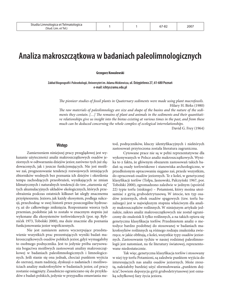 makroszczątkowa w badaniach paleolimnologicznych Studia Limnologica etAnaliza Telmatologica 1 1 (Stud. Lim. et Tel.) 67-82 2007 67 Analiza makroszczątkowa w badaniach paleolimnologicznych Grzegorz Kowalewski Zakład Biogeografii i Paleoekologii, Uniwersytet im. Adama Mickiewicza, ul. Dzięgielowa 27, 61-680 Poznań e-mail: [email protected] e pionieer studies of fossil plants in Quaternary sediments were made using plant macrofossils. Hilary H. Birks (1980) e raw materials of paleolimnology are size and shape of the basins and the nature of the sediments they contain. […] e remains of plant and animals in the sediments and their quantitative relationships give us insight into the biotas existing at various times in the past, and from these much can be deduced concerning the whole complex of ecological interrelationships. David G. Frey (1964) Wstęp Zamierzeniem niniejszej pracy przeglądowej jest wykazanie użyteczności analiz makroszczątkowych osadów jeziornych w odtwarzaniu dziejów jezior, zarówno tych już zlądowaconych, jak i jeszcze funkcjonujących. Nie jest możliwe zaś, prognozowanie tendencji rozwojowych istniejących zbiorników wodnych bez poznania ich dziejów i określenia tempa zachodzących przeobrażeń, wynikających ze zmian klimatycznych i naturalnych tendencji do tzw. „starzenia się” tych akumulacyjnych układów ekologicznych, których przeobrażenia podczas ostatnich kilkuset lat uległy znacznemu przyśpieszeniu. Jezioro, jak każdy ekosystem, podlega sukcesji, przechodząc w swej historii przez poszczególne hydrosery, aż do całkowitego zniknięcia. Rozpoznanie wzorca tych przemian, podobnie jak to zostało w znacznym stopniu już wykonane dla ekosystemów torfowiskowych (por. np. Rybniček 1973, Tobolski 2000), ma duże znacznie dla poznania funkcjonowania jezior współczesnych. Nie jest zamiarem autora wyczerpujące przedstawienie wszystkich prac prezentujących wyniki badań makroszczątkowych osadów polskich jezior, gdyż wymagałoby to osobnego podręcznika. Jest to jedynie próba zarysowania bogactwa możliwych zastosowań analizy makroszczątkowej w badaniach paleolimnologicznych i limnologicznych. Jeśli stanie się ona jednak, chociaż punktem wyjścia do szerszej, mam nadzieję, dyskusji o zadaniach i możliwościach analizy makrofosyliów w badaniach jezior, cel pracy zostanie osiągnięty. Zasadniczo ograniczano się do przykładów z badań polskich, jedynie w przypadku omawiania me- tod, podręczników, kluczy identyfikacyjnych i niektórych zastosowań przytoczona została literatura zagraniczna. Cytowane prace nie są w pełni reprezentatywne dla wykonywanych w Polsce analiz makroszczątkowych. Wynika to z faktu, że głównym obszarem zastosowań takich badań są osady torfowiskowe i stanowiska archeologiczne, w przedłożonym opracowaniu sięgano zaś, przede wszystkim, do opracowań osadów jeziornych. Te z kolei, w genetycznej klasyfikacji torfów (Tołpa, Jasnowski, Pałczyński 1967, por. Tobolski 2000), zgromadzono zaledwie w jednym (spośród 22) typie torfu (niskiego) – Potamioni, który można utożsamiać z gytią grubodetrytusową. W istocie, ten typ osadów jeziornych, obok osadów spągowych (tzw. torfu bazalnego) jest w największym stopniu właściwym dla analizy makroszczątków roślinnych. W niniejszym artykule jednakże, zakres analiz makroszczątkowych nie został ograniczony do znalezisk li tylko roślinnych, a na takich opiera się genetyczna klasyfikacja torfów. Przedmiotem analiz o metodyce bardzo podobnej do stosowanej w badaniach makrofosyliów roślinnych są różnego rodzaju znaleziska zwierzęce, w jakie obfitują, z kolei, wszystkie typy osadów jeziornych. Zastosowanie tychże w naszej rodzimej paleolimnologii jest natomiast, na tle literatury światowej, reprezentowane niedostatecznie. Tak więc, genetyczna klasyfikacja torfów i stosowany w niej typ torfu Potamioni, są zaledwie punktem wyjścia do interesujących nas analiz osadów jeziornych. Może zresztą, należałoby bardziej użyć sformułowania „punktem dojścia”, bowiem depozycja gytii grubodetrytusowej jest oznaką schyłkowej fazy życia jeziora. 68 G. Kowalewski Analizy makroszczątkowe znajdują więc punkt styczny z badaniami torfowisk, najczęściej zresztą limnogenicznymi. Innym, ważnym obszarem nakładania się obszarów zainteresowań naukowych są badania sukcesyjne hydroser, gdzie omawiana tu dziedzina wiedzy spotyka się z ekologią biocenoz wodnych i bagiennych, oferując wielkie możliwości poznawcze. Nigdzie bowiem tak precyzyjnie, w tak długiej skali czasowej, nie prześledzimy zjawisk sukcesyjnych, jak w opartej na badaniach makrofosyliów analizie paleoekologicznej. Podkreślić już na wstępie należy, że punktem wyjścia badań paleoekologicznych są analizy dokonywane w ramach (neo)ekologii, przede wszystkim, zespołów organizmów wodnych i bagiennych. Dlatego wymagana jest tu znajomość zagadnień tych dziedzin wiedzy. Badania znalezisk makroskopowych biegły w Polsce dwoma równoległymi torami: paleobotanicznym i paleozoologicznym. Historię polskiej paleobotaniki przedstawiło kilkoro autorów w tomie „Paleobotanika na przełomie wieków” (Zastawniak, red. 2003). Wśród metod badawczych paleobotaniki najliczniej reprezentowane są analizy: pyłkowa i okrzemkowa, przy czym pierwsza odnosi się do roślinności regionalnej i lokalnej, na podstawie zaś okrzemek interpretujmy przemiany ekosystemu wodnego (Madeyska 1992a). Do analiz paleoekologicznych zaliczymy także analizę makroszczątków roślinnych. Dla geologów czwartorzędu badania makroszczątkowe są cennym uzupełnieniem analiz pyłkowych, ale w kwestii poznania samego jeziora i zamieszkujących je niegdyś organizmów, analiza makrofosyliów nie tylko uzupełnia obraz uzyskany z danych palinologicznych, ale mocno go zmienia, ujawniając fakty zakryte przed analizą pyłkową (por. np. Birks & Birks 2000). W badaniach czwartorzęd